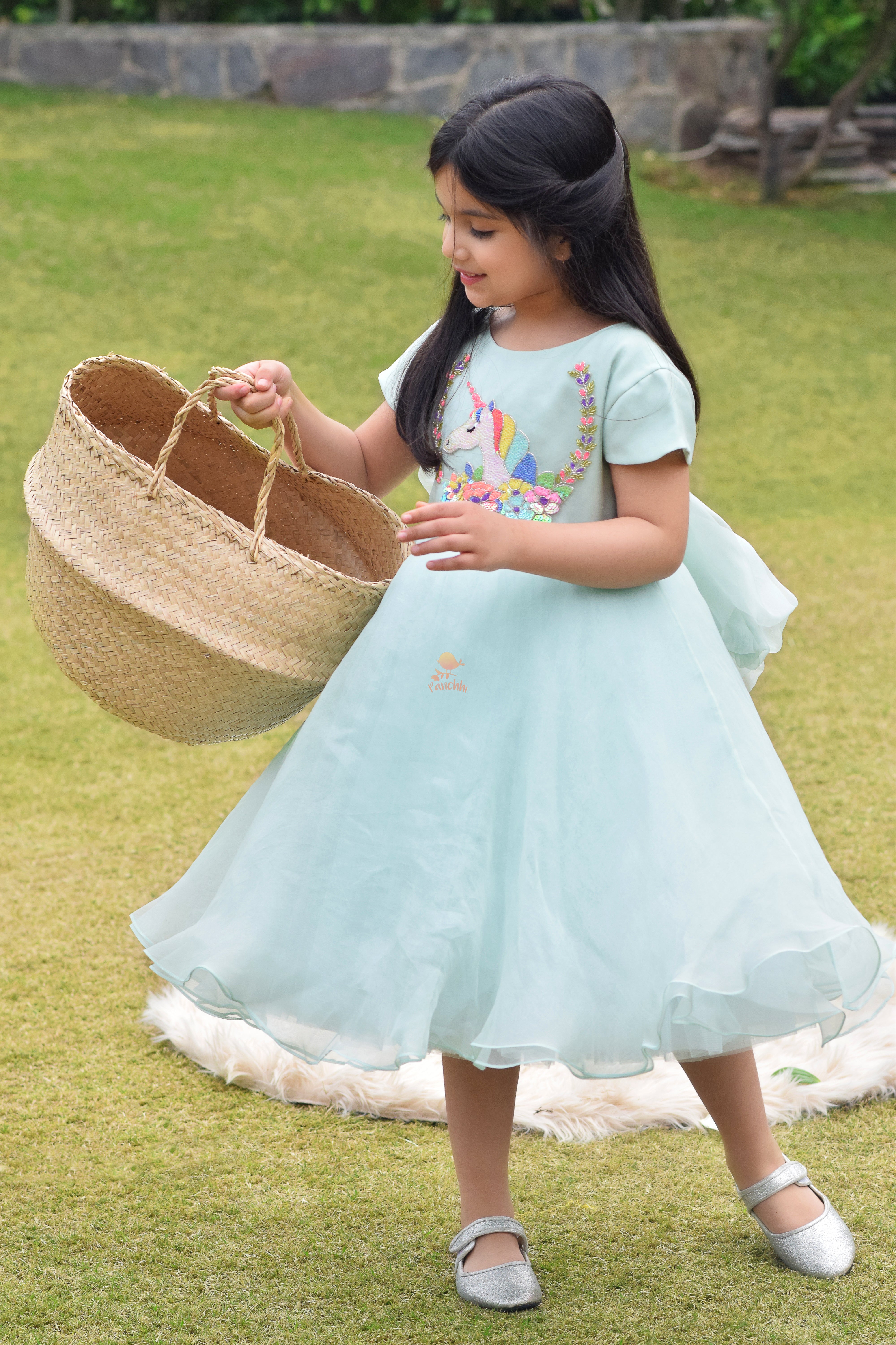 Unicorn Embroidered Short Dress with Deep back and an Organza Bow