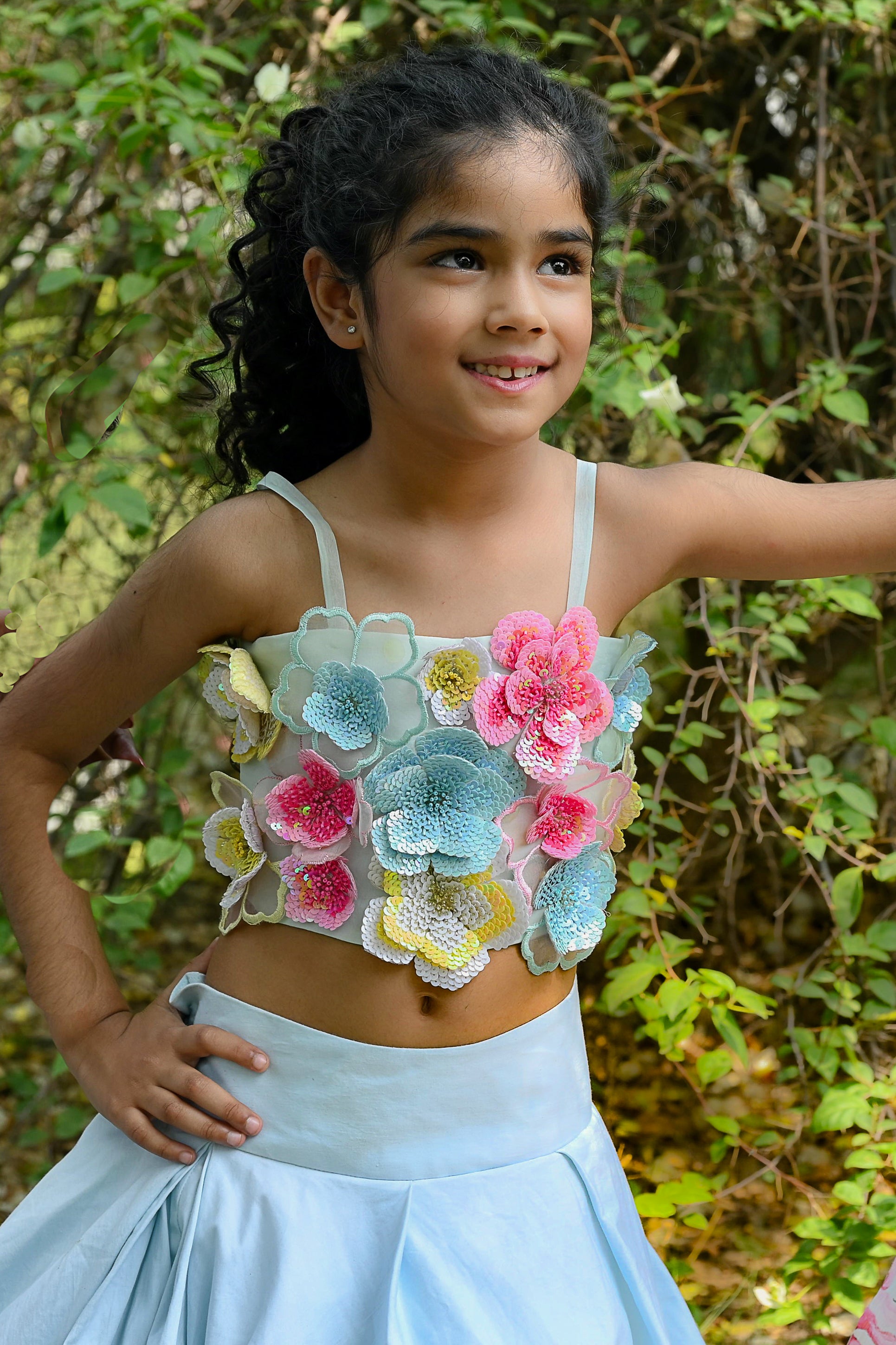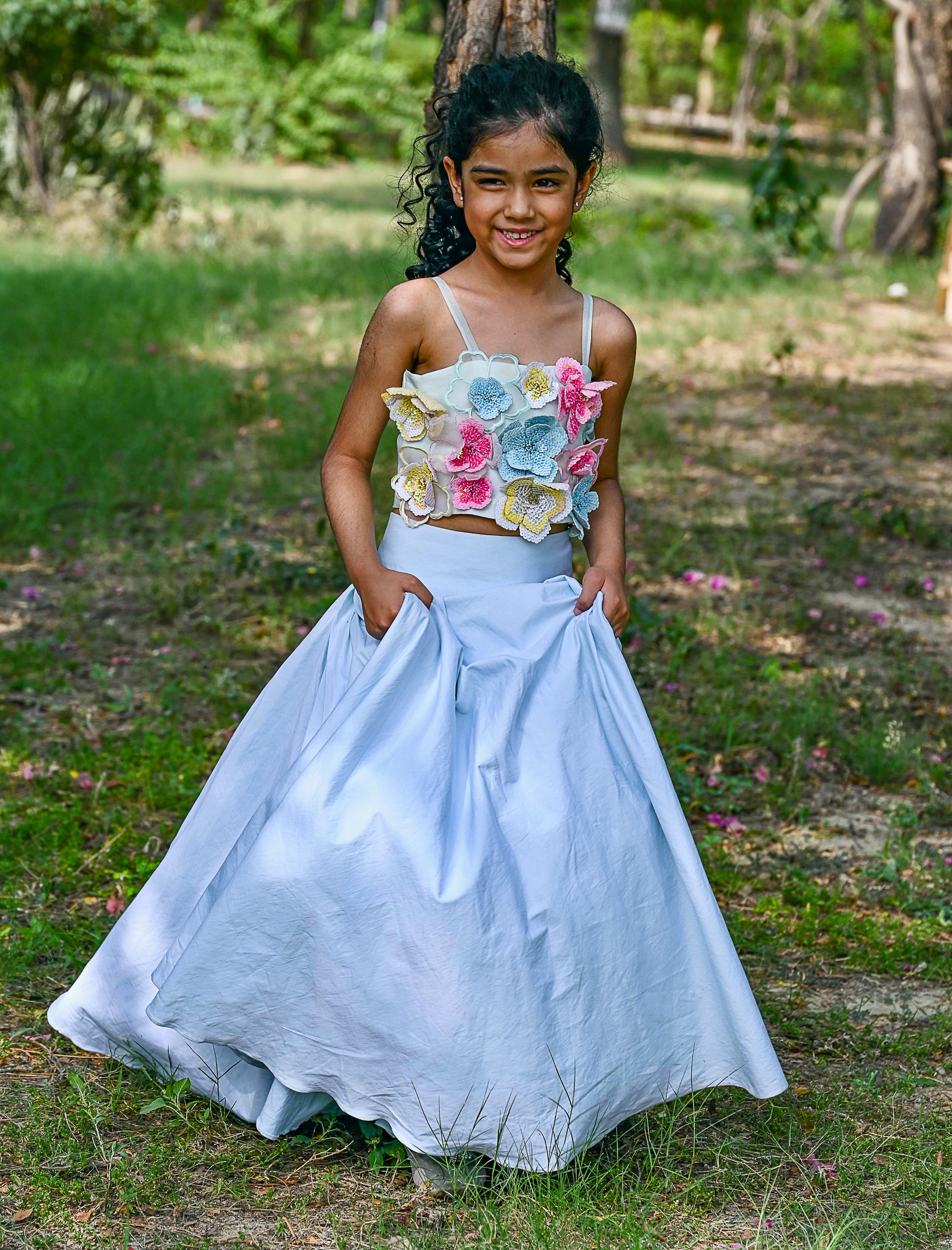 Multicolor 3d Flowers created using different techniques sewn on a tube top with noodle strap and a Box Pleated Skirt. No Can Can