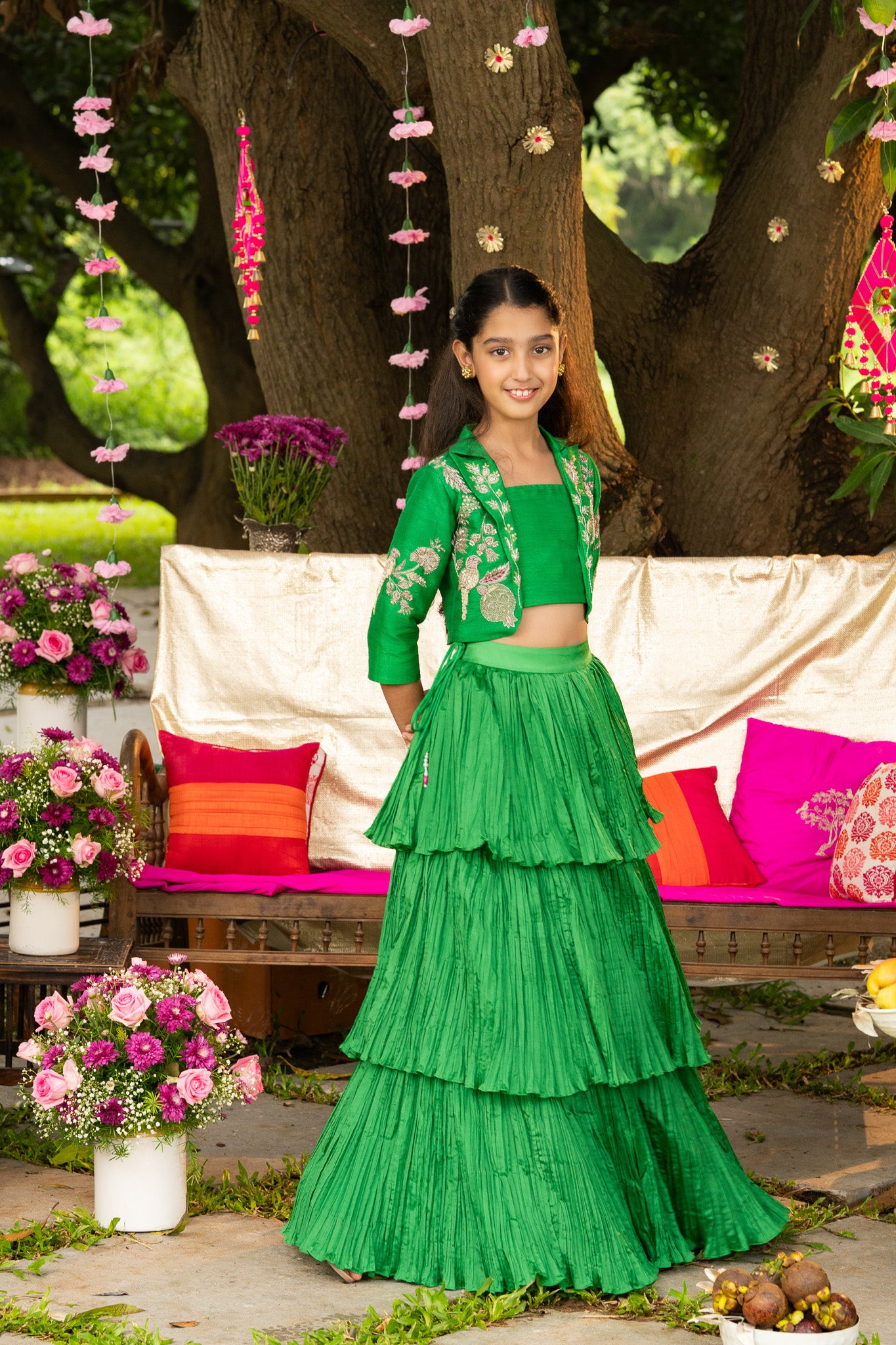 A celebration of colour and craft — this emerald green lehenga features cascading tiers that create beautiful movement, paired with a cropped blouse and a short embroidered jacket.