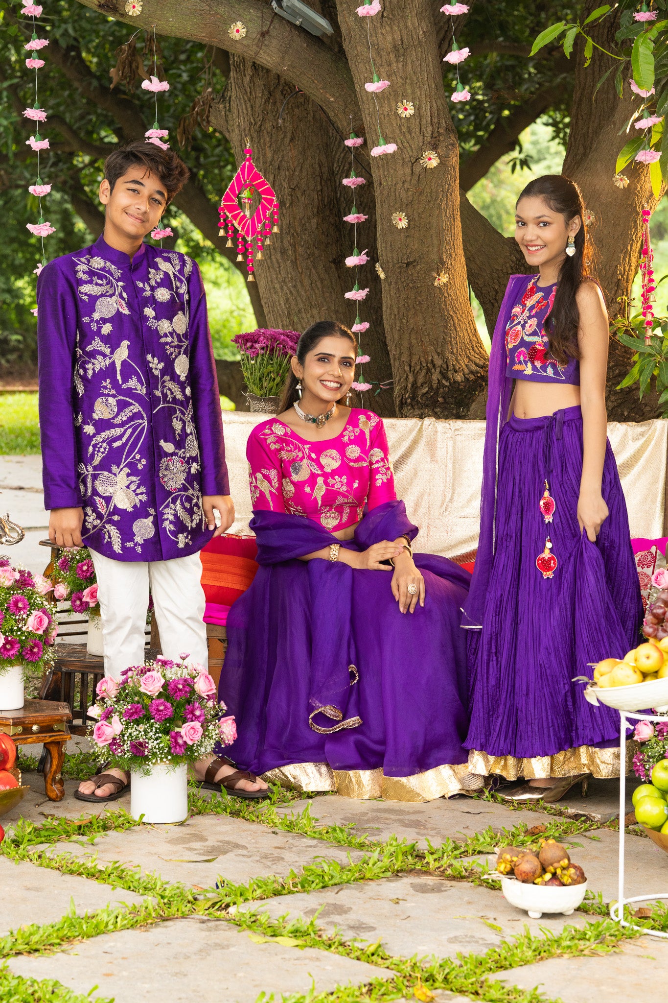 A lehenga that blooms with stories — this pleated purple skirt sways with every twirl, while the blouse is a canvas of embroidered pomegranates and flowers, symbolizing a garden of plenty.