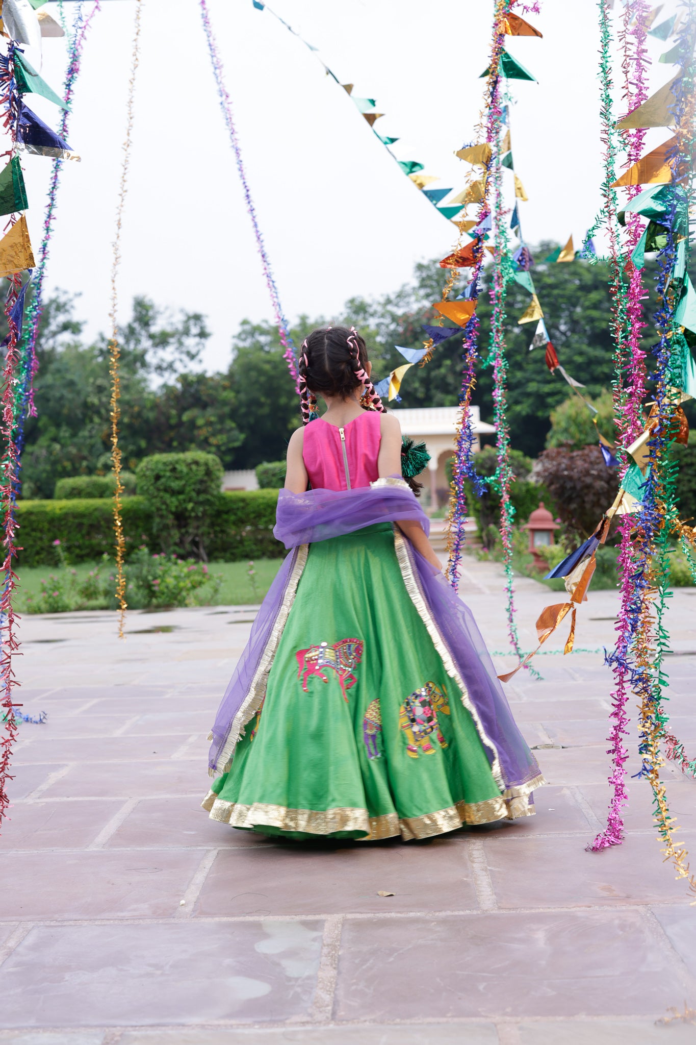 Oversized Elephants, Horses, Camels Embroidered Skirt with Detailed Thread work and mirror work with Mirror Work blouse and Gota Embellished Net Dupatta. Blouse with complete Zip at the back. No Can Can.