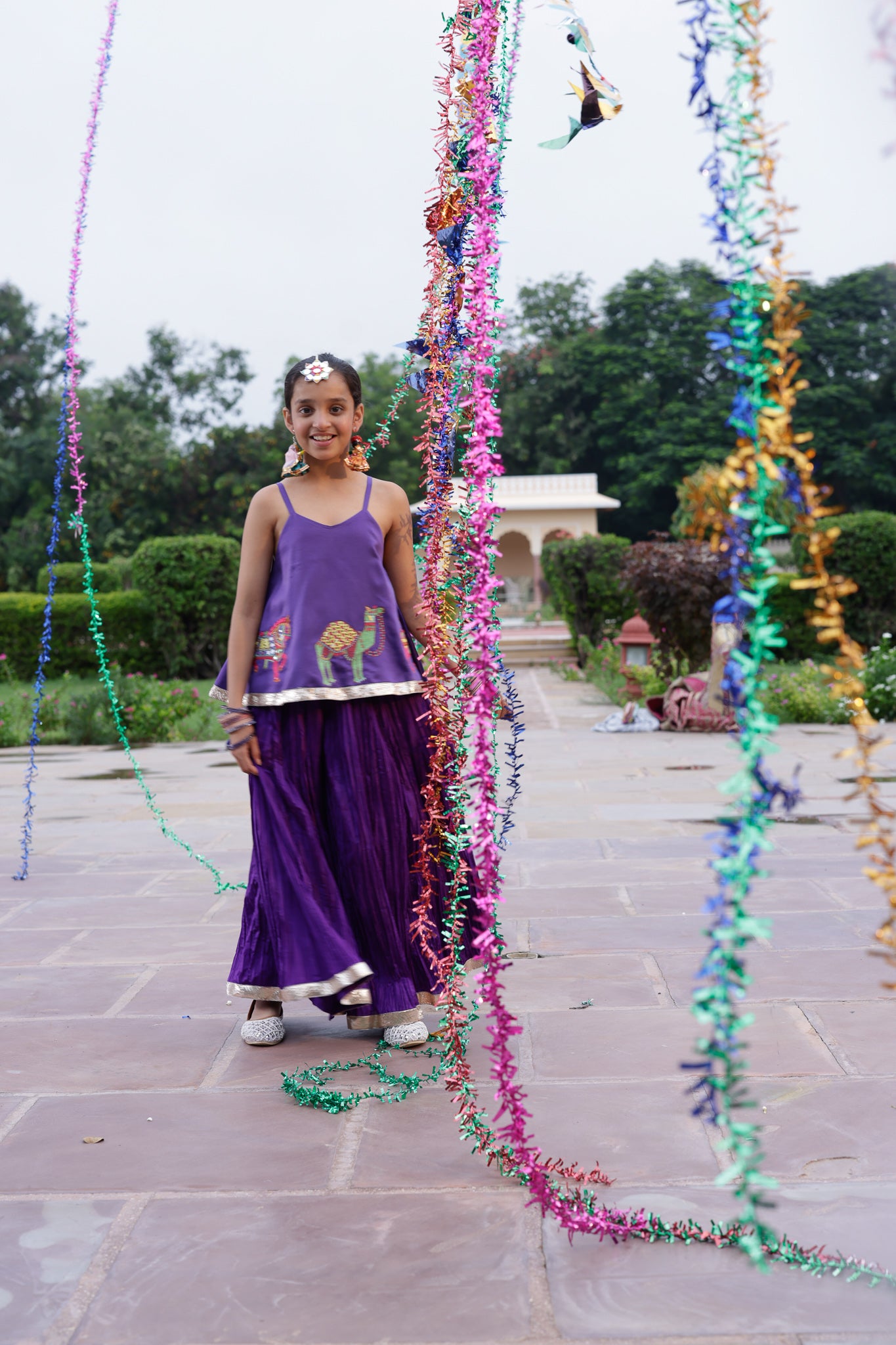 Oversized Horse and Camels Embroidered A Line Top with Detailed Thread work and mirror work crushed fabric Palazzo pants. Hem detailed with Gota.