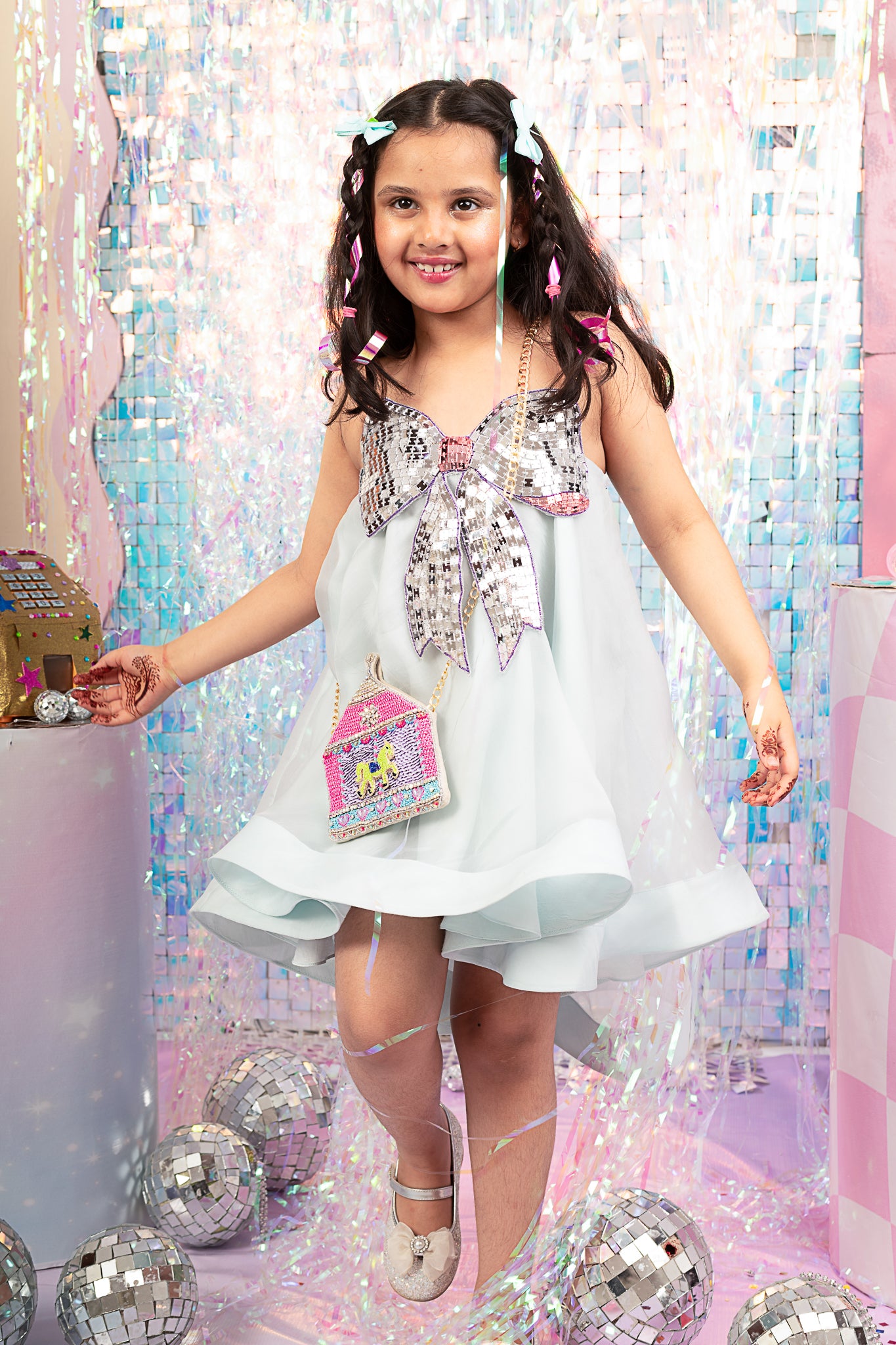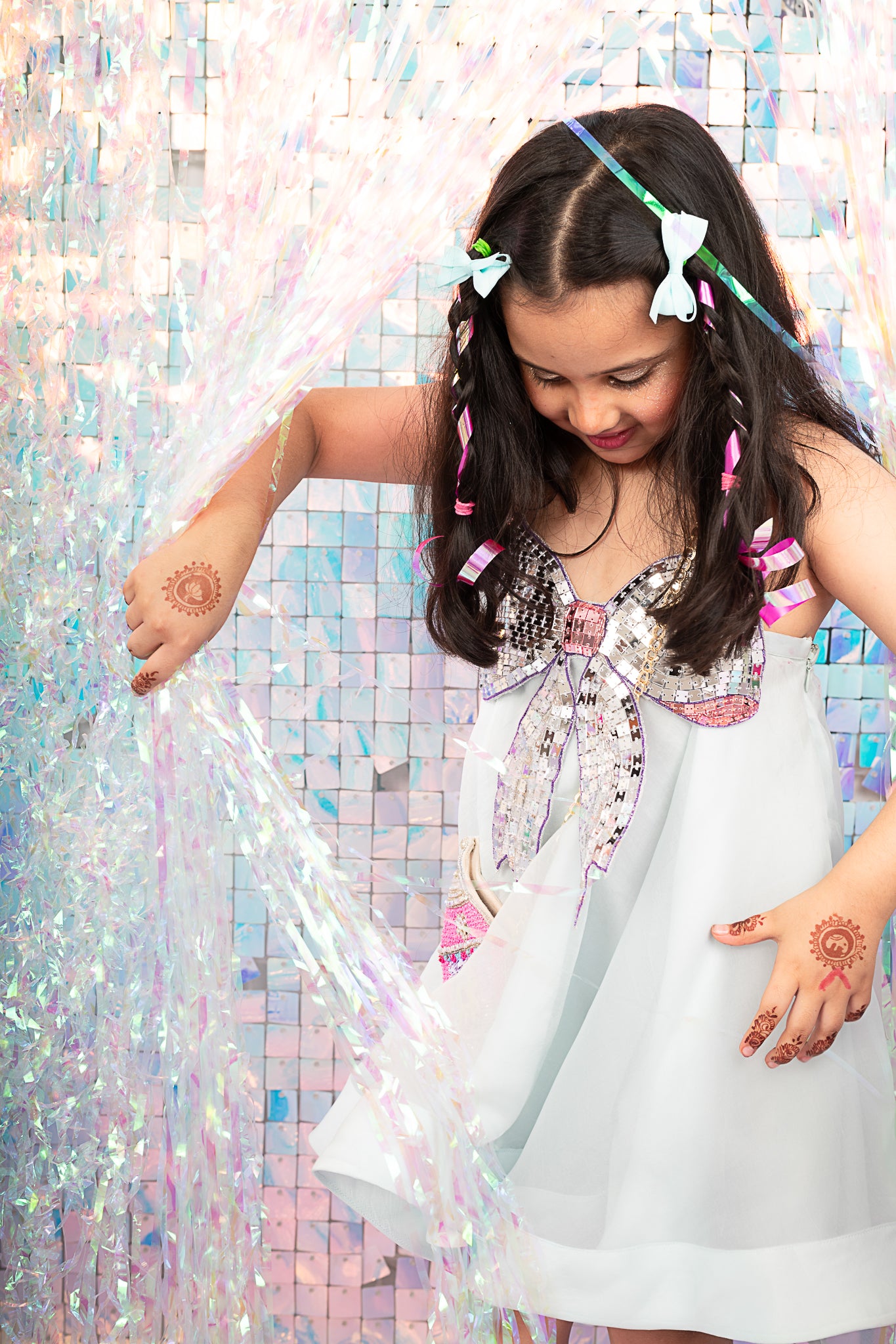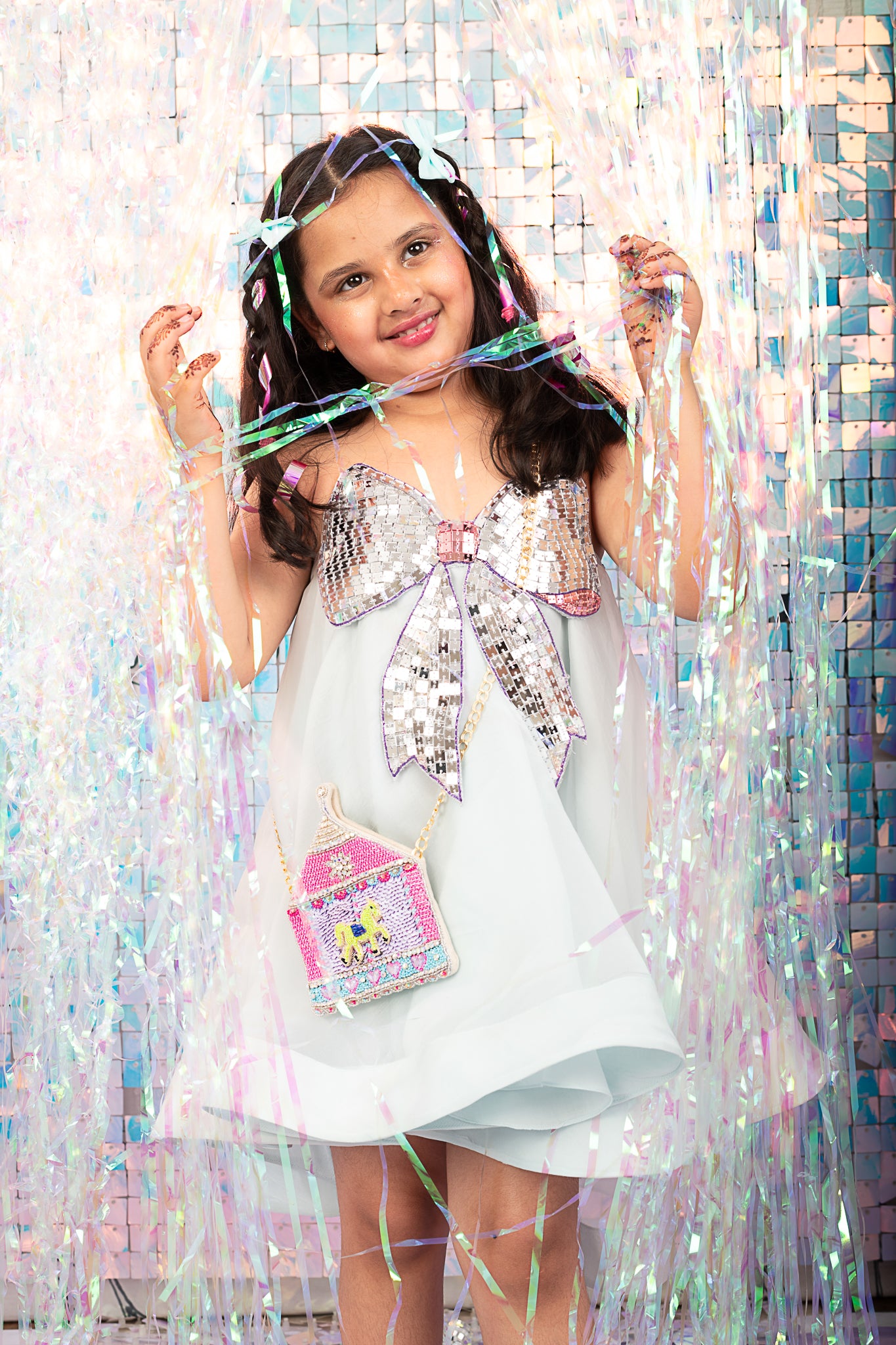 Tube dress with a hand embroidered oversized bow on the bodice. Horse hair detailed hem for extra twirl.