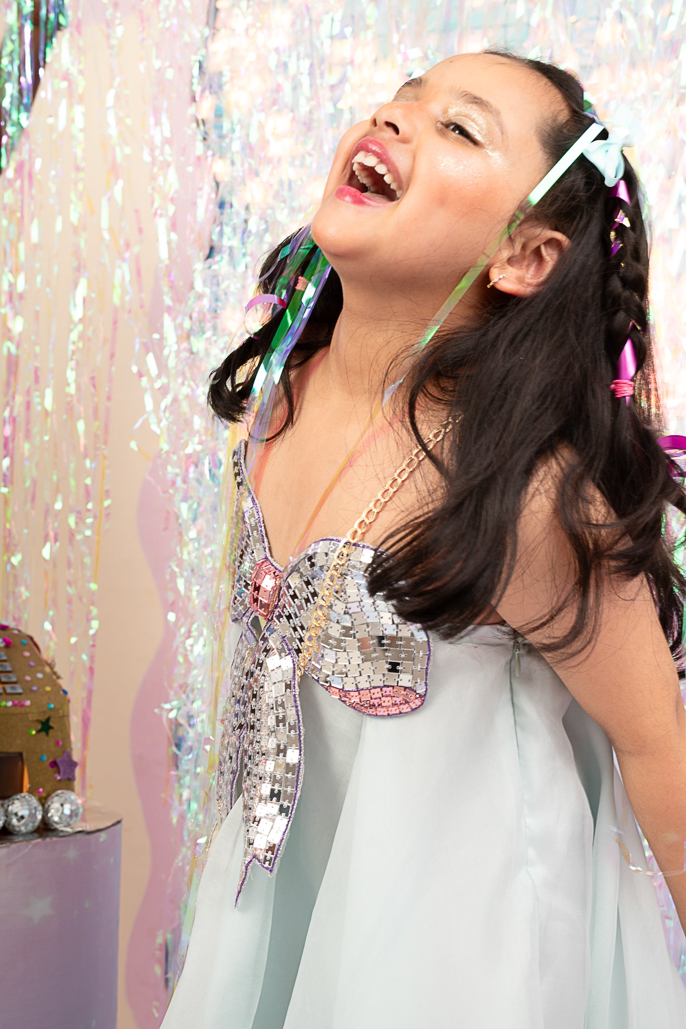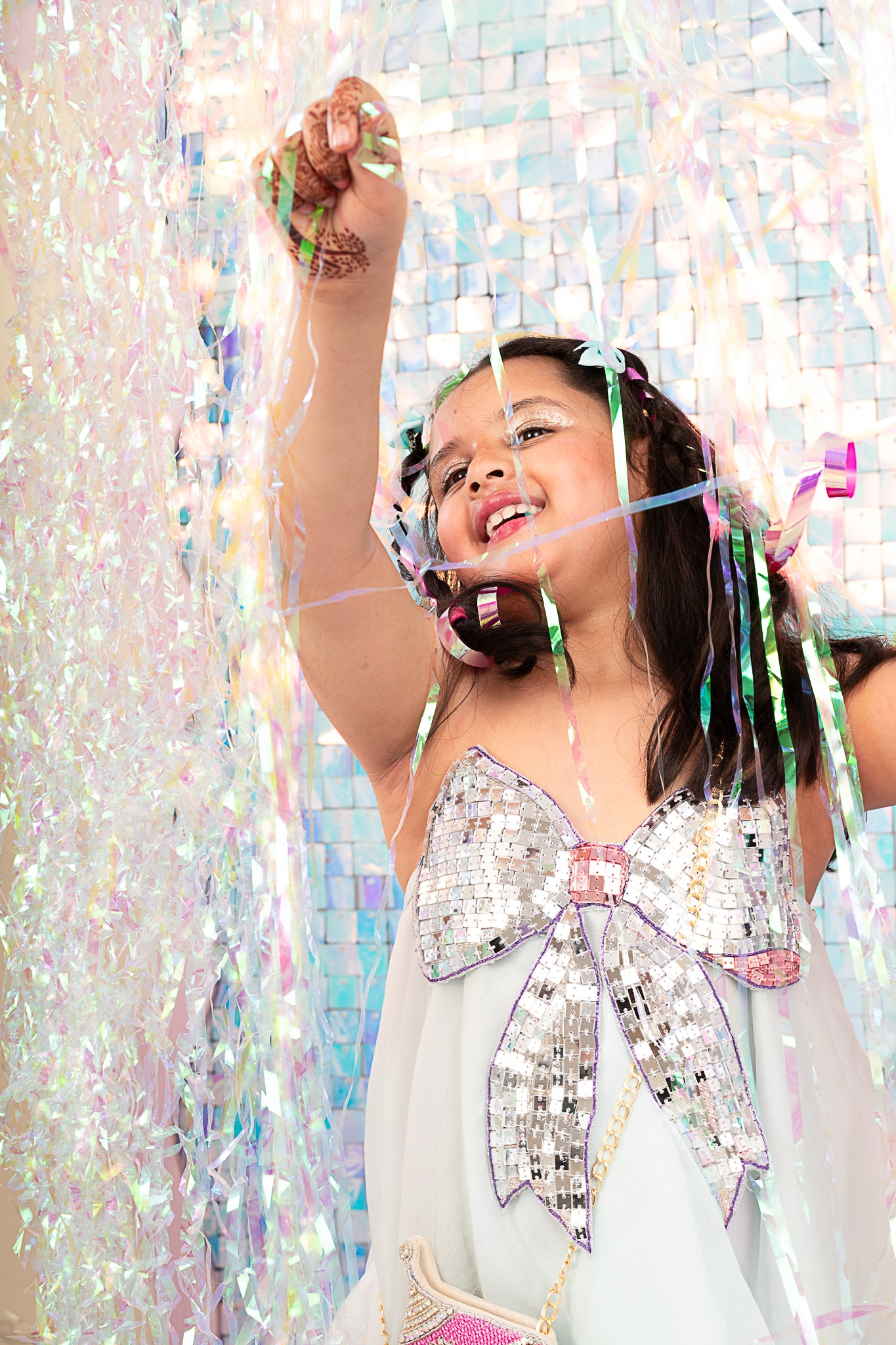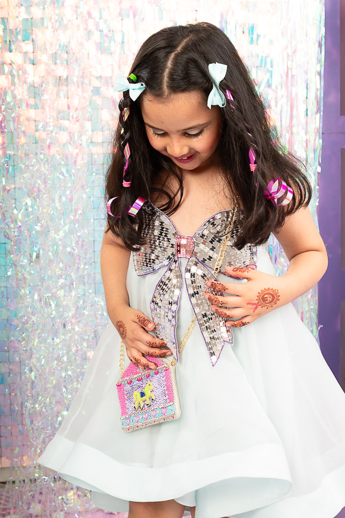 Tube dress with a hand embroidered oversized bow on the bodice. Horse hair detailed hem for extra twirl.