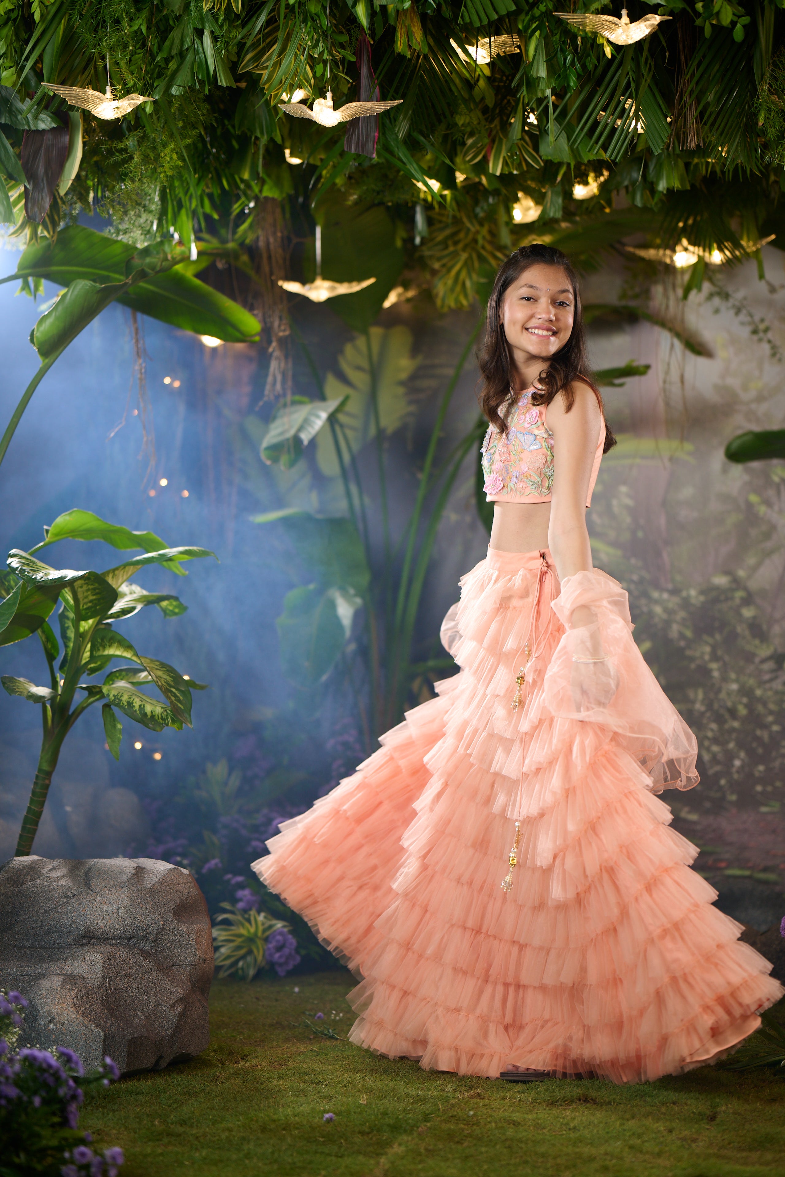 Flowing like ripples of Summer Breeze in the morning sun, the ruffle skirt dances with every move. The Blouse is intricately embroidered with flowers, flamingo and leaves as if its a garden set like the morning scenery. No Can Can.