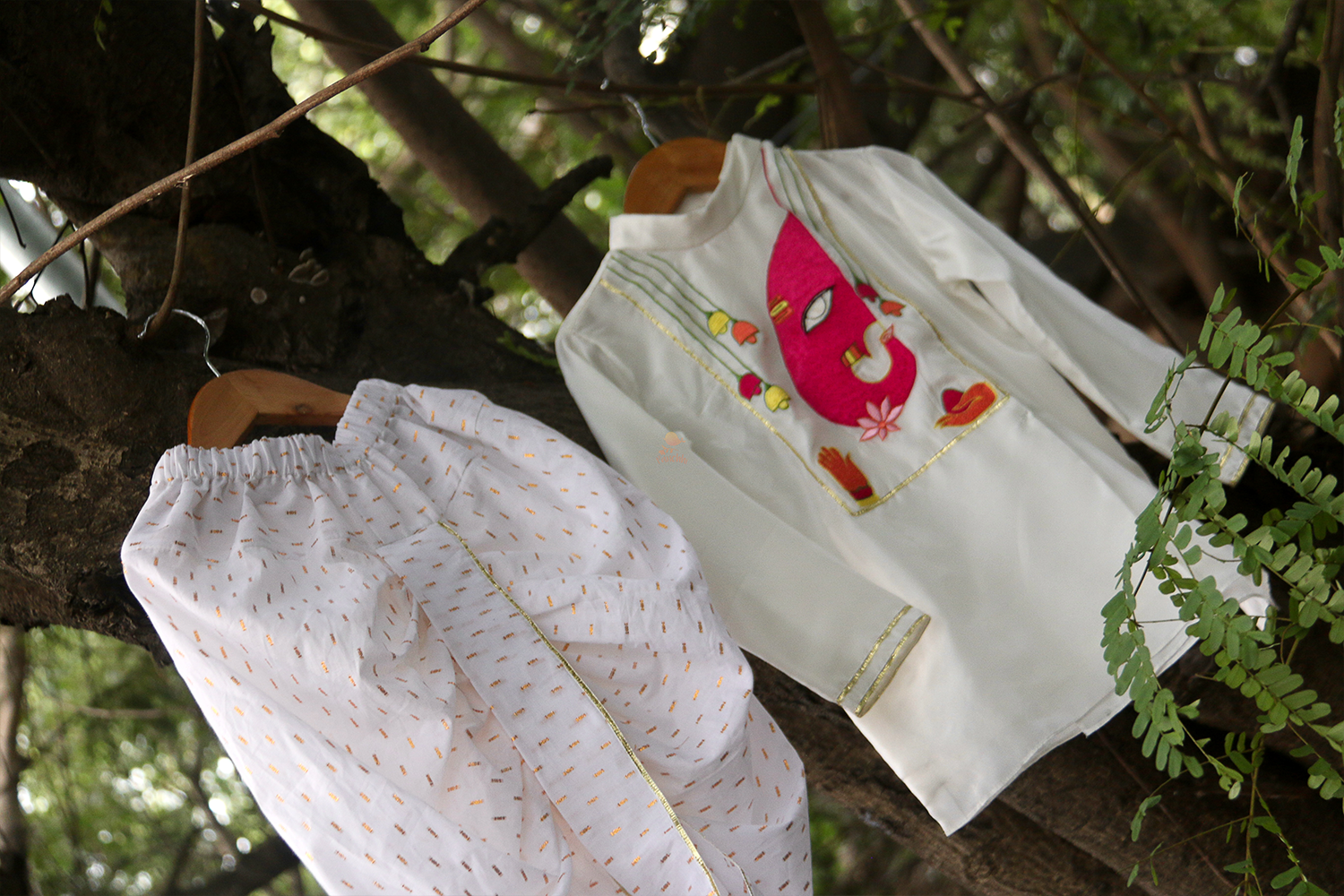 Ganesha Themed Embroidered on a front open kurta set with Gold highlights on dhoti Pants