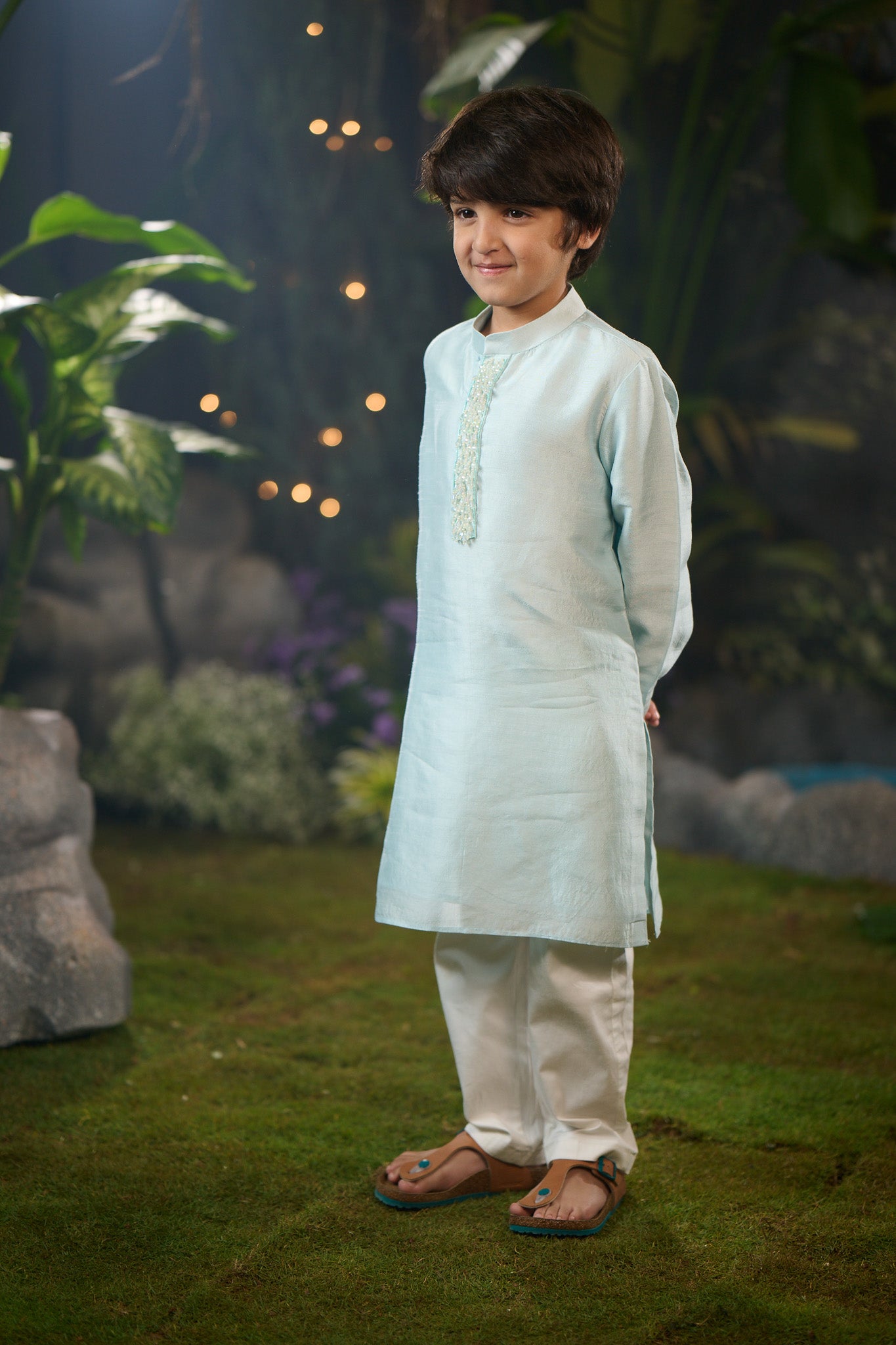Like Dewdrops falling at dawn, this kurta is adorned with hand embroidered placket of pearls and crystals