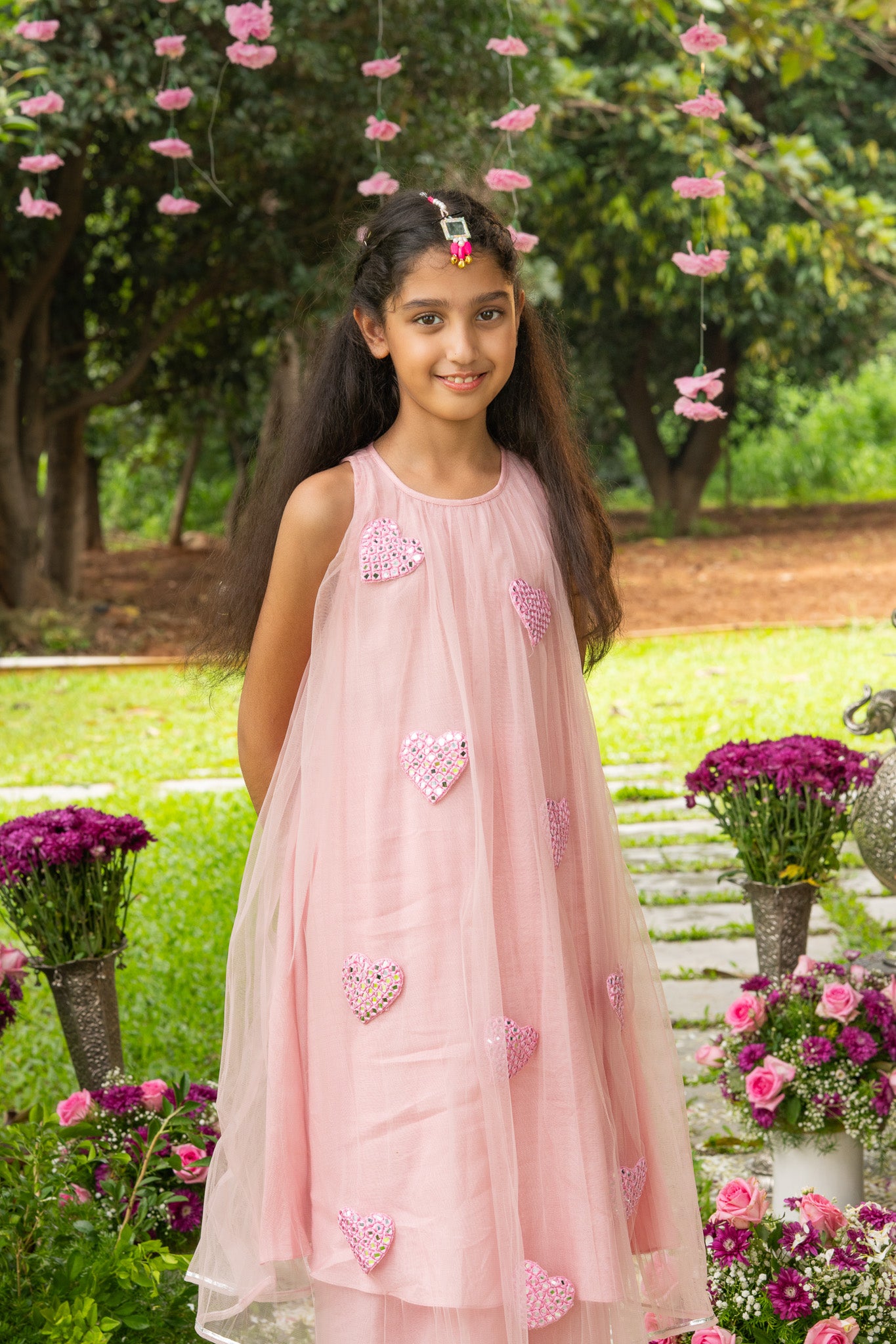 A dreamy tulle dress that feels like wearing love itself. This flowy blush-pink dress is dotted with mirror-embroidered hearts, perfect for twirling through garden parties, birthdays, or the sangeet dance floor.
