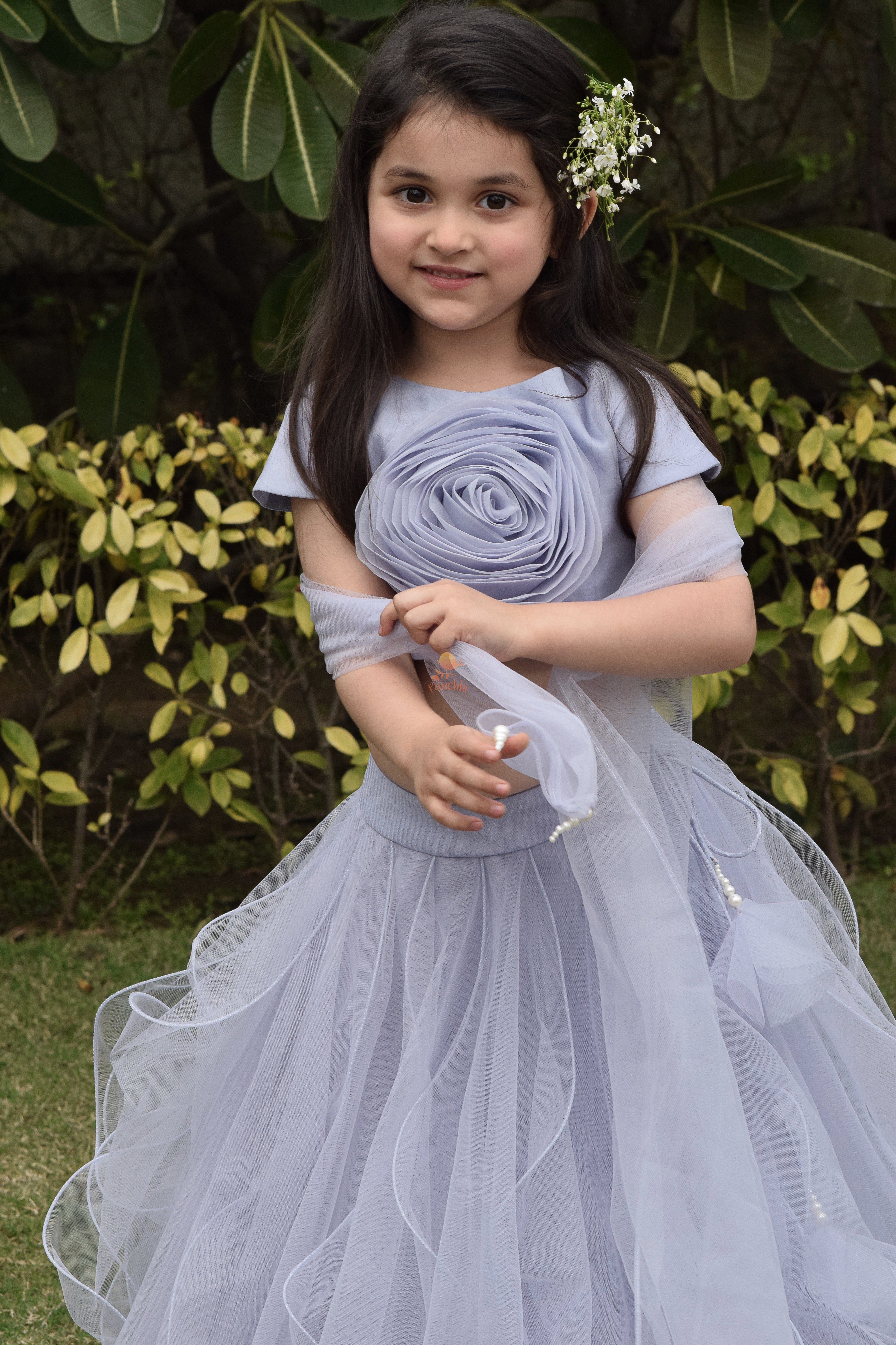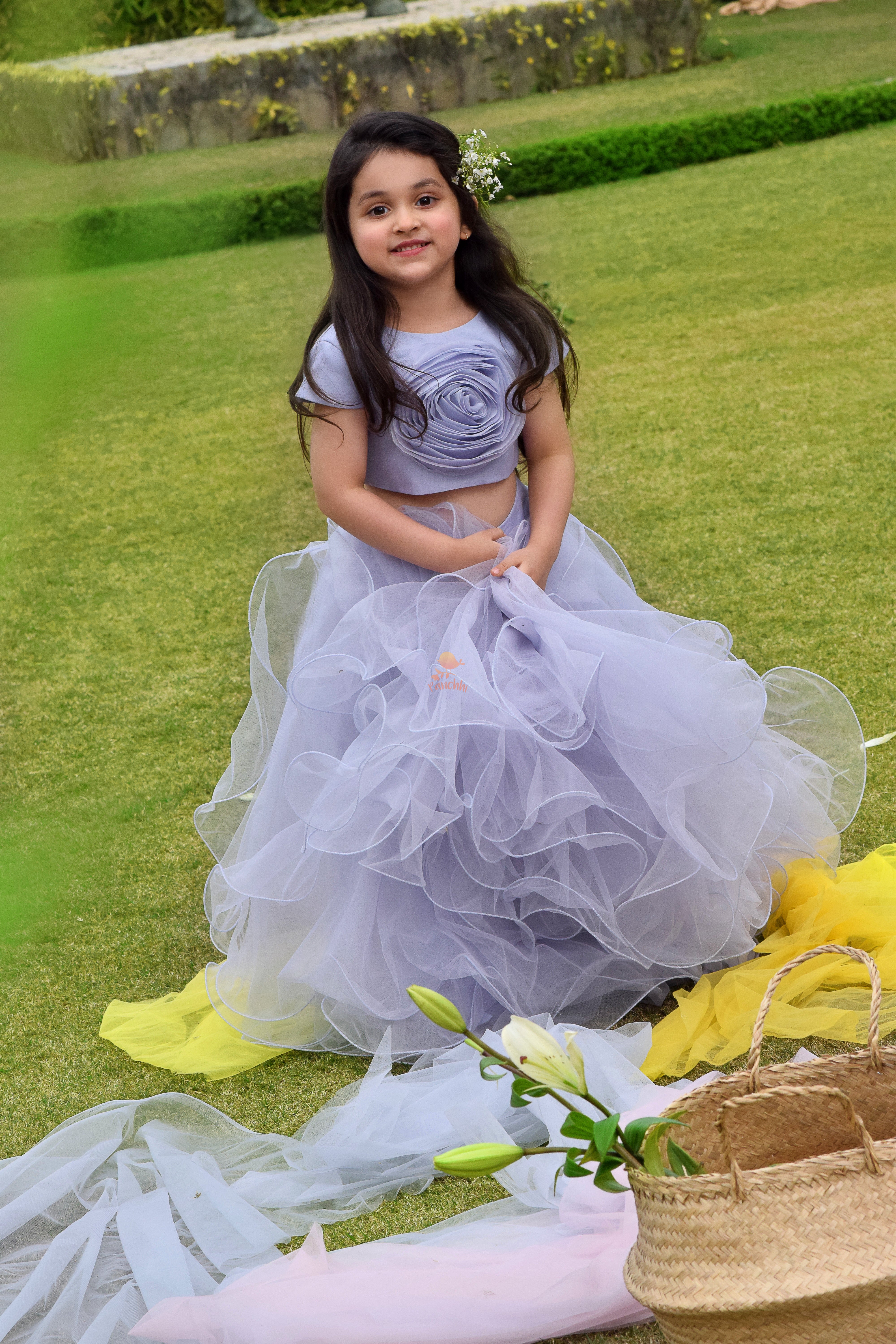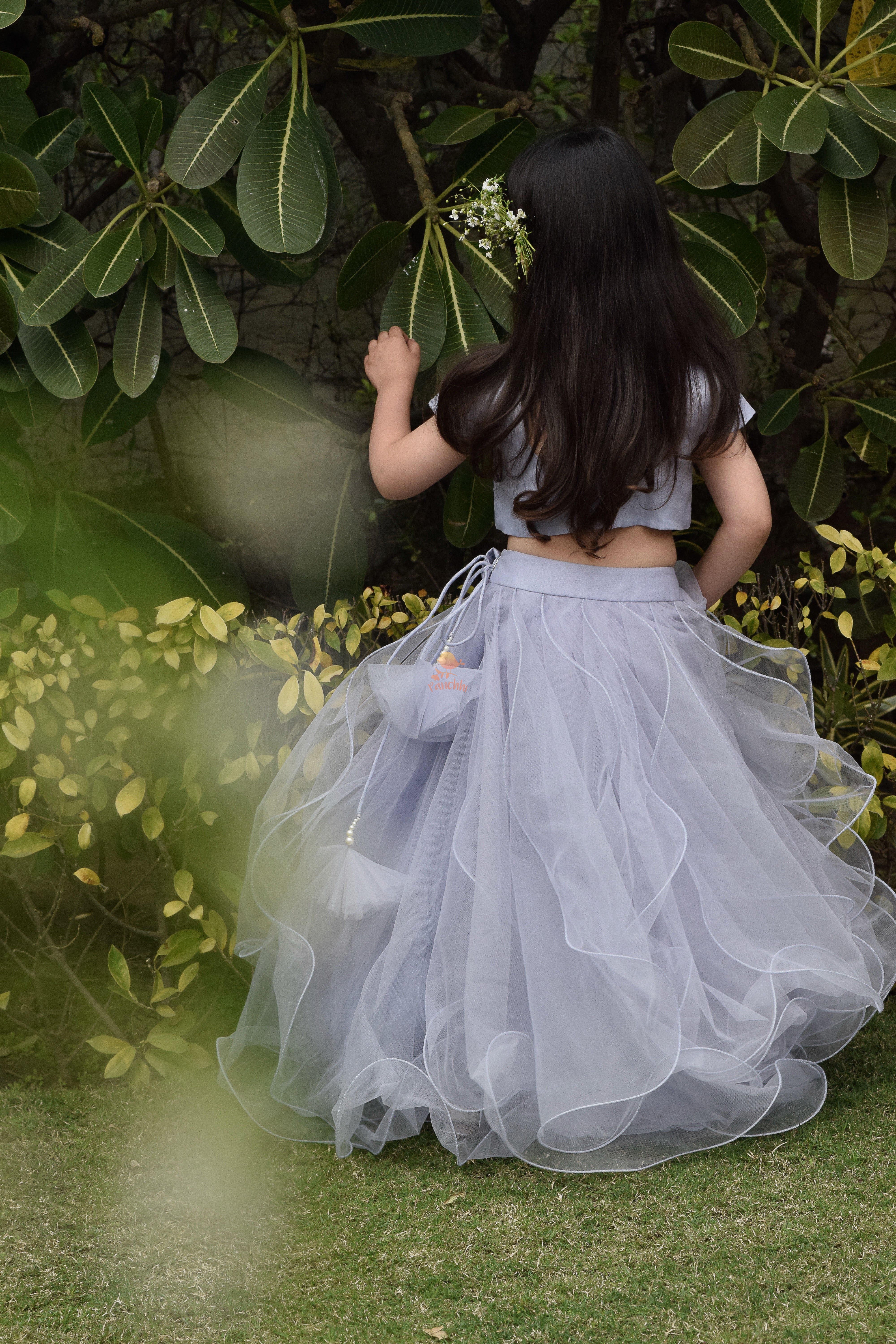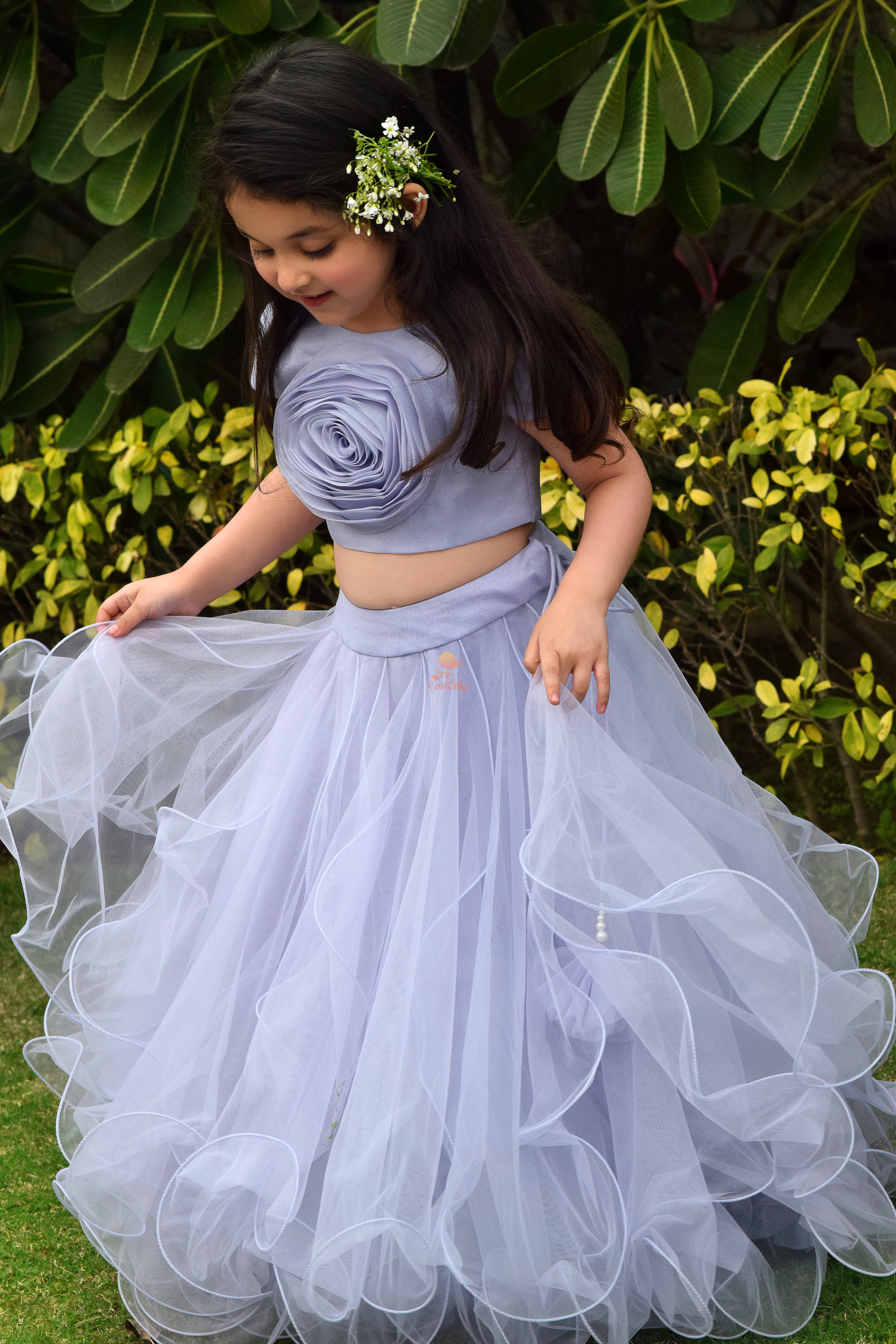 Layers of Net in a cascading style Lehenga with a handcrafted silk organza floret on blouse.