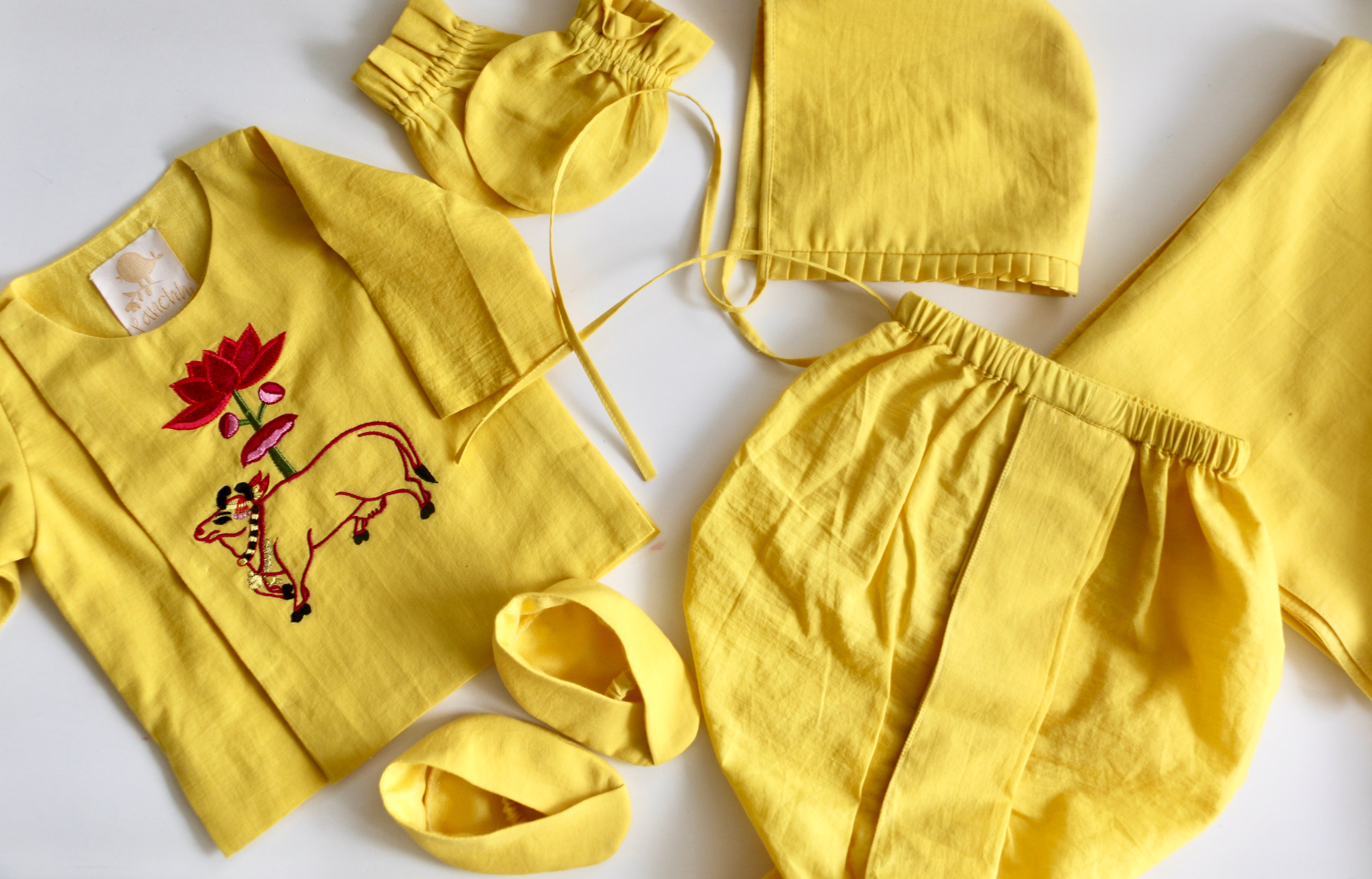 Set of 6 items - Kurta, Pants, Mittens, Booties, Cap and an Embroidered Swaddle
