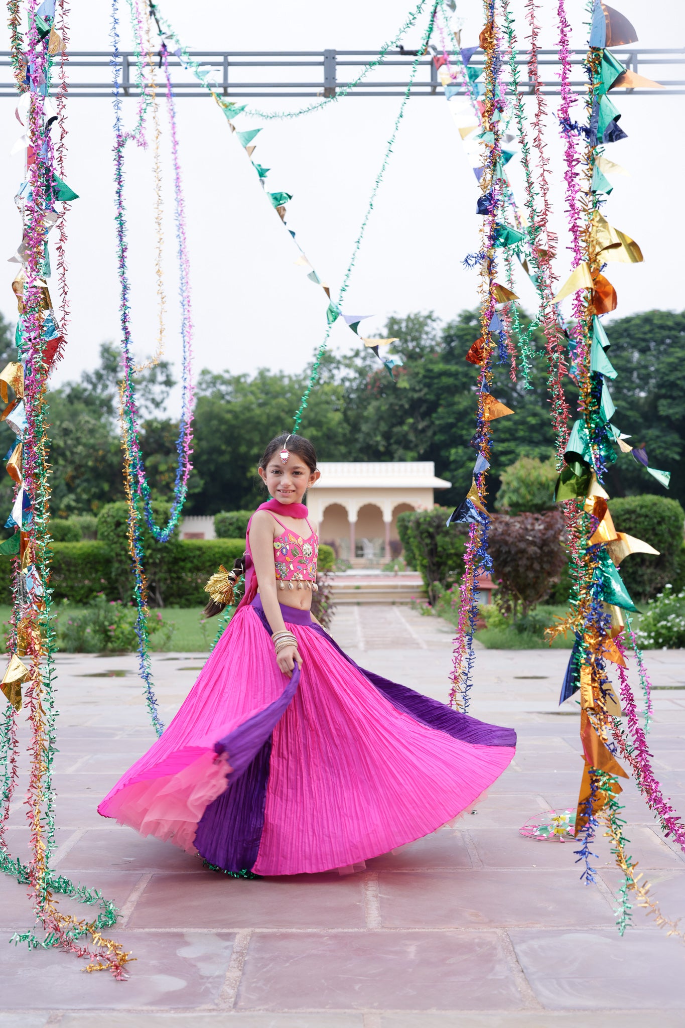 Chintz Inspired floral pattern embroidered on the blouse with our signature beads, sequins and mirror work. Crushed Silk Skirt in Multicolor panels. No Can Can.