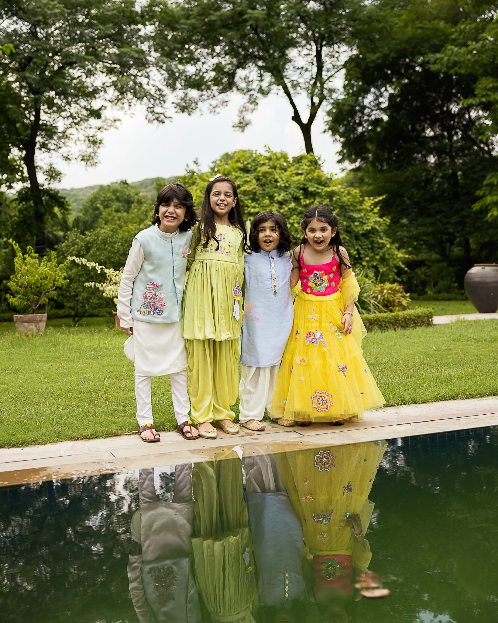 Bandi with Hand Embroidered Elephants adorned in multicolor beads and sequins. Lotus Shaped Embroidered Pocket Square Included