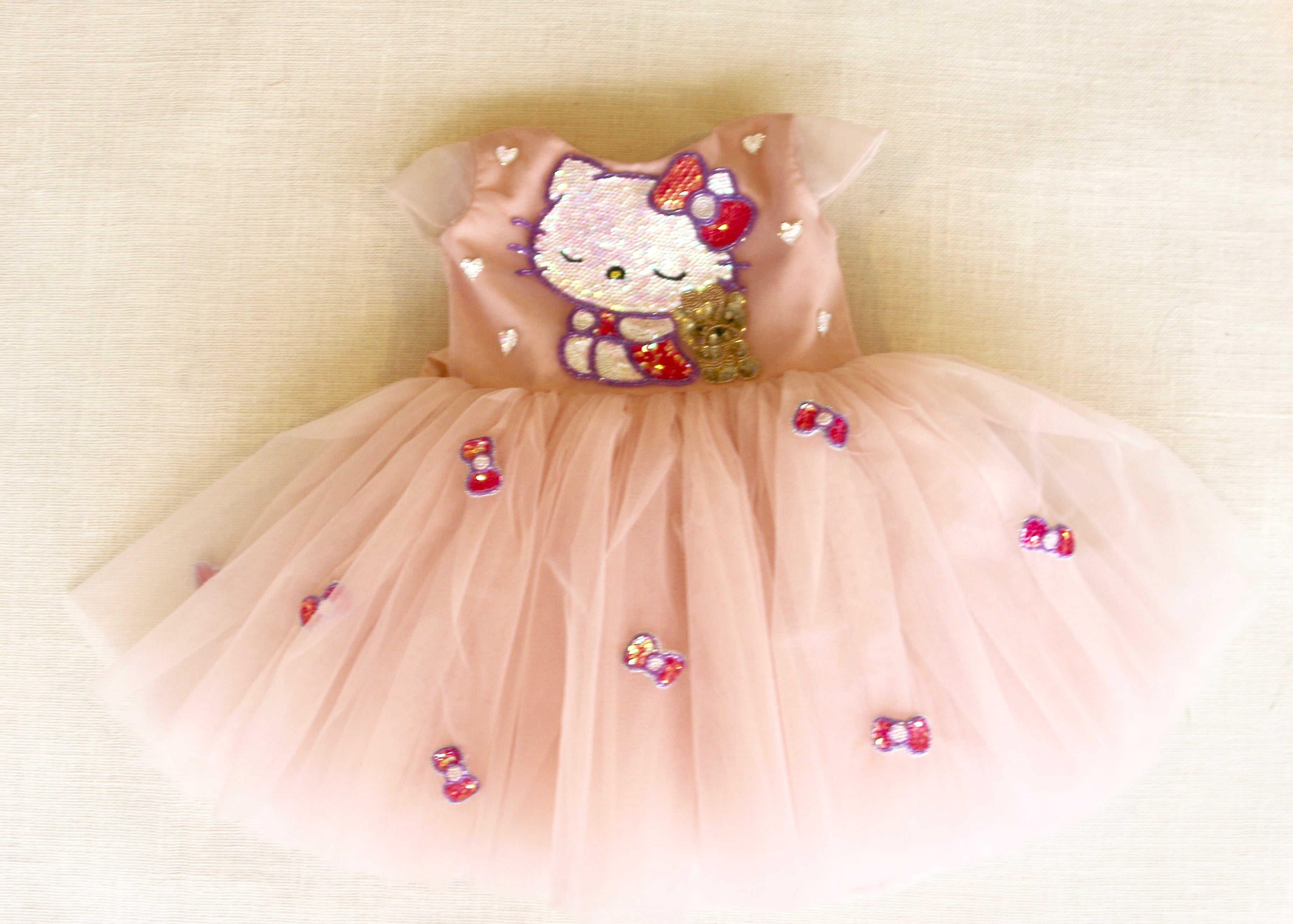 Hello Kitty Embroidered Mid thigh length dress with cap sleeves. Small Bows Embroidered and embellished all over the skirt. Deep back