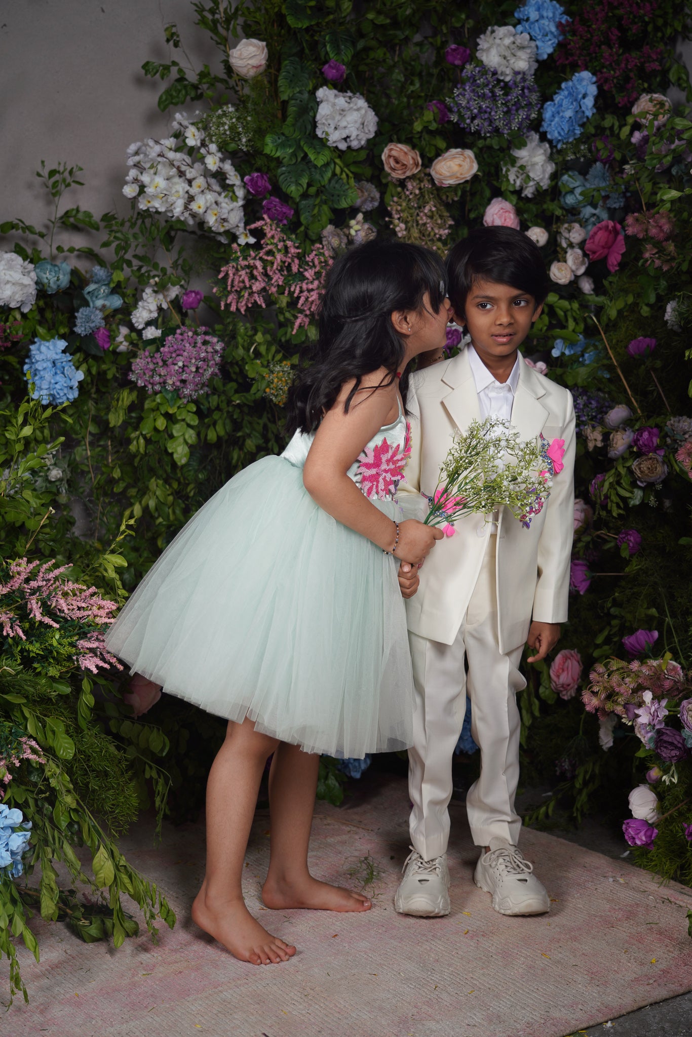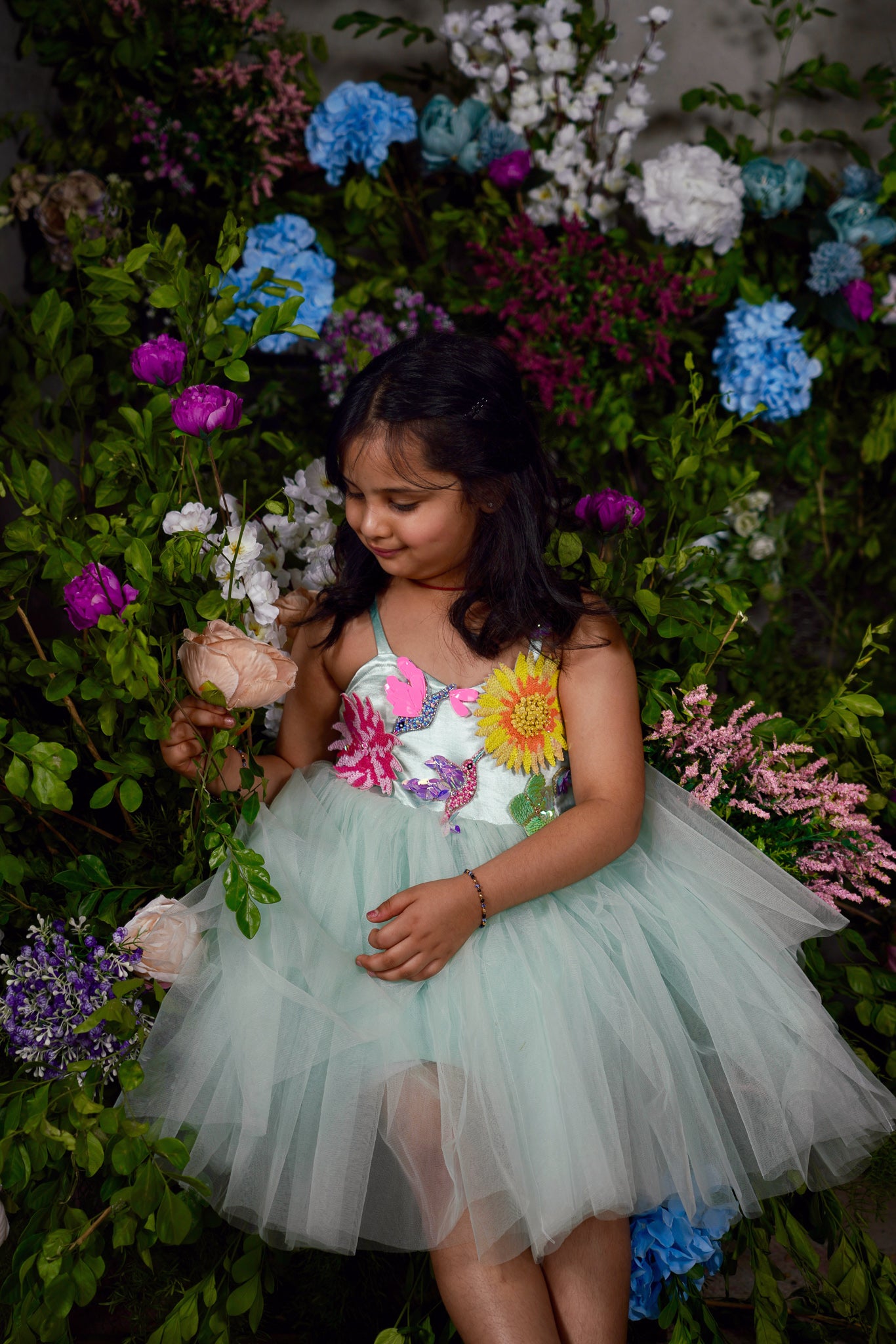 Satin Bodice in a knee length Tulle dress embellished with hand embroidered 3d flowers and Hummingbirds