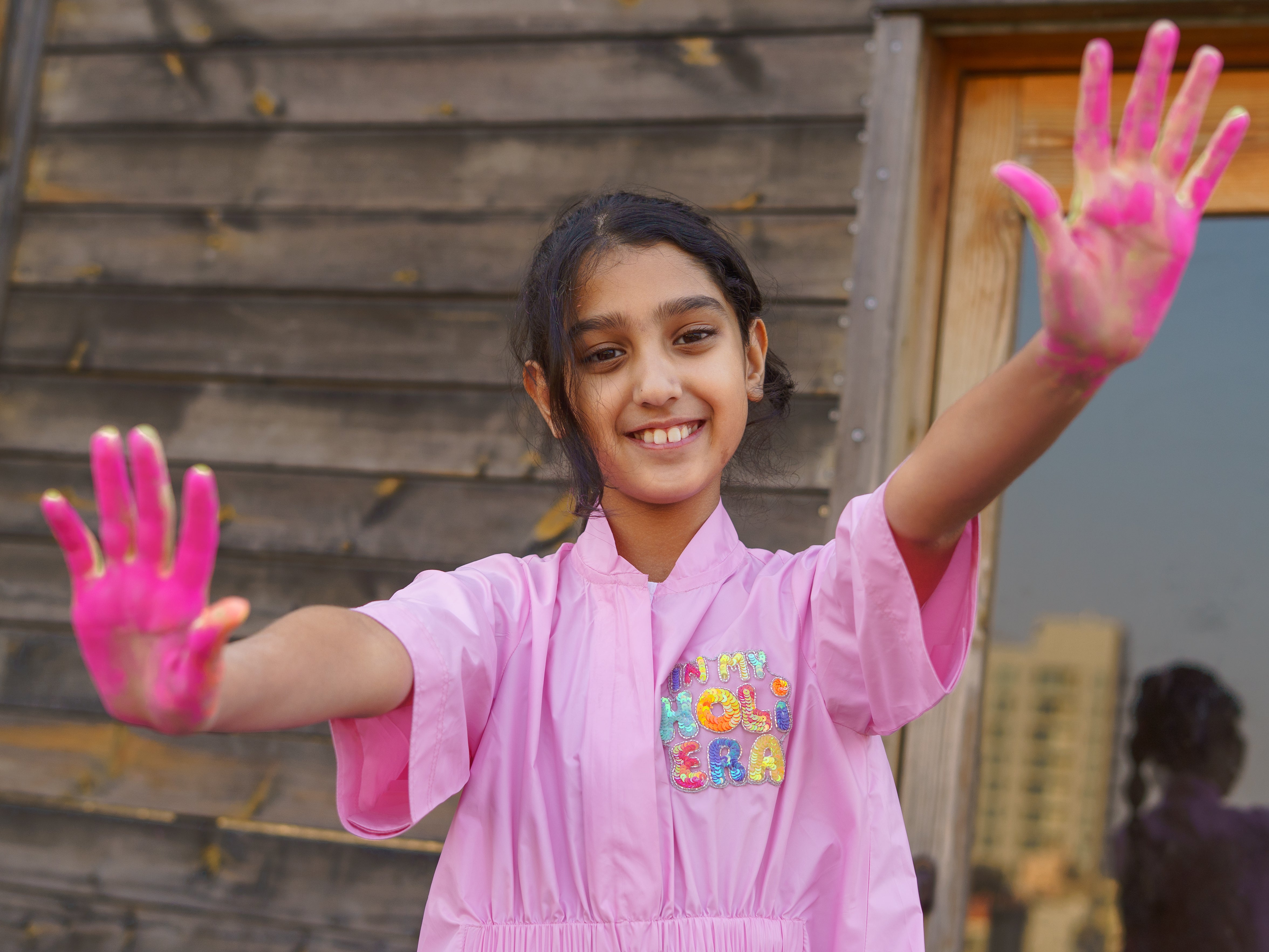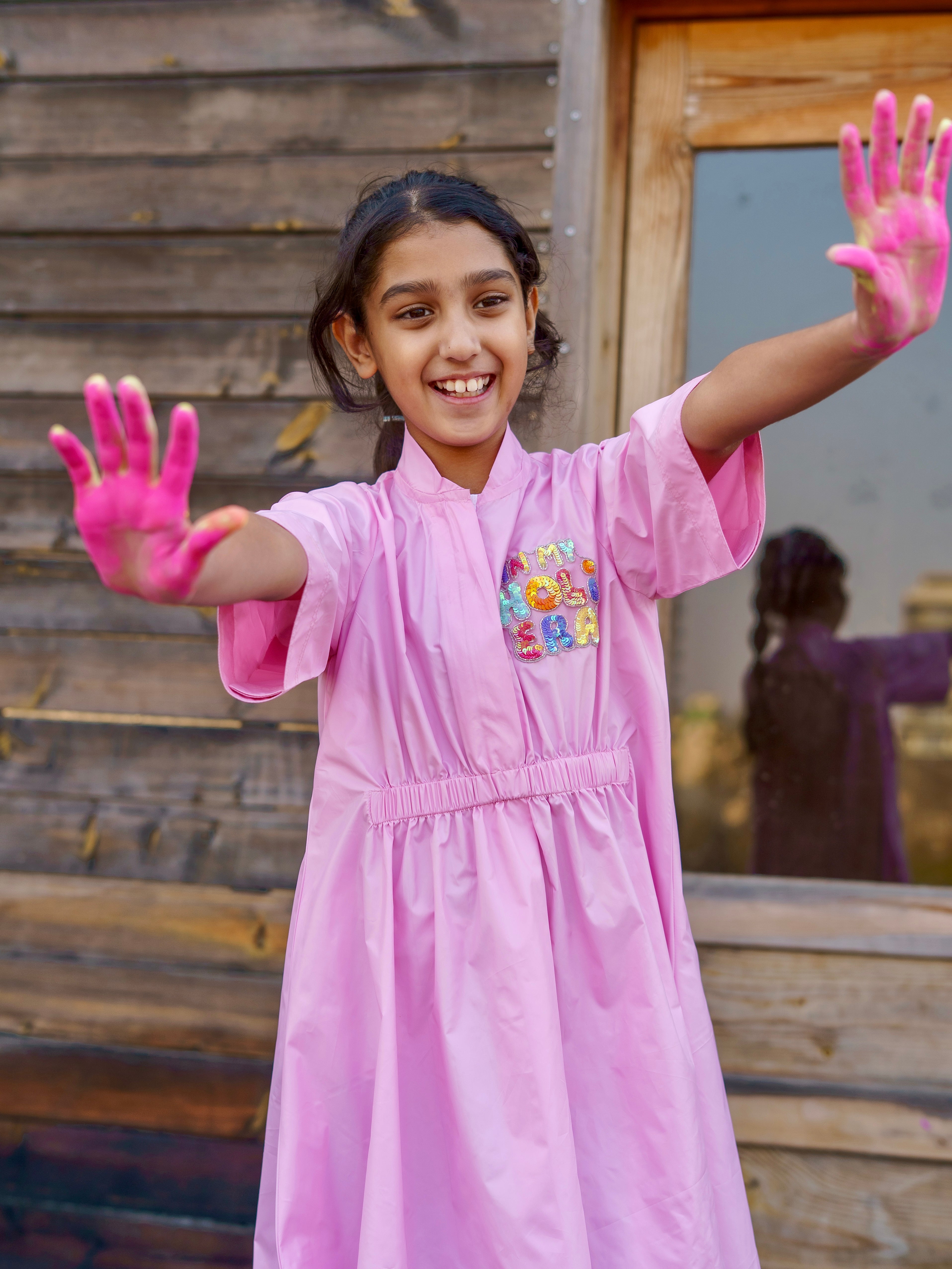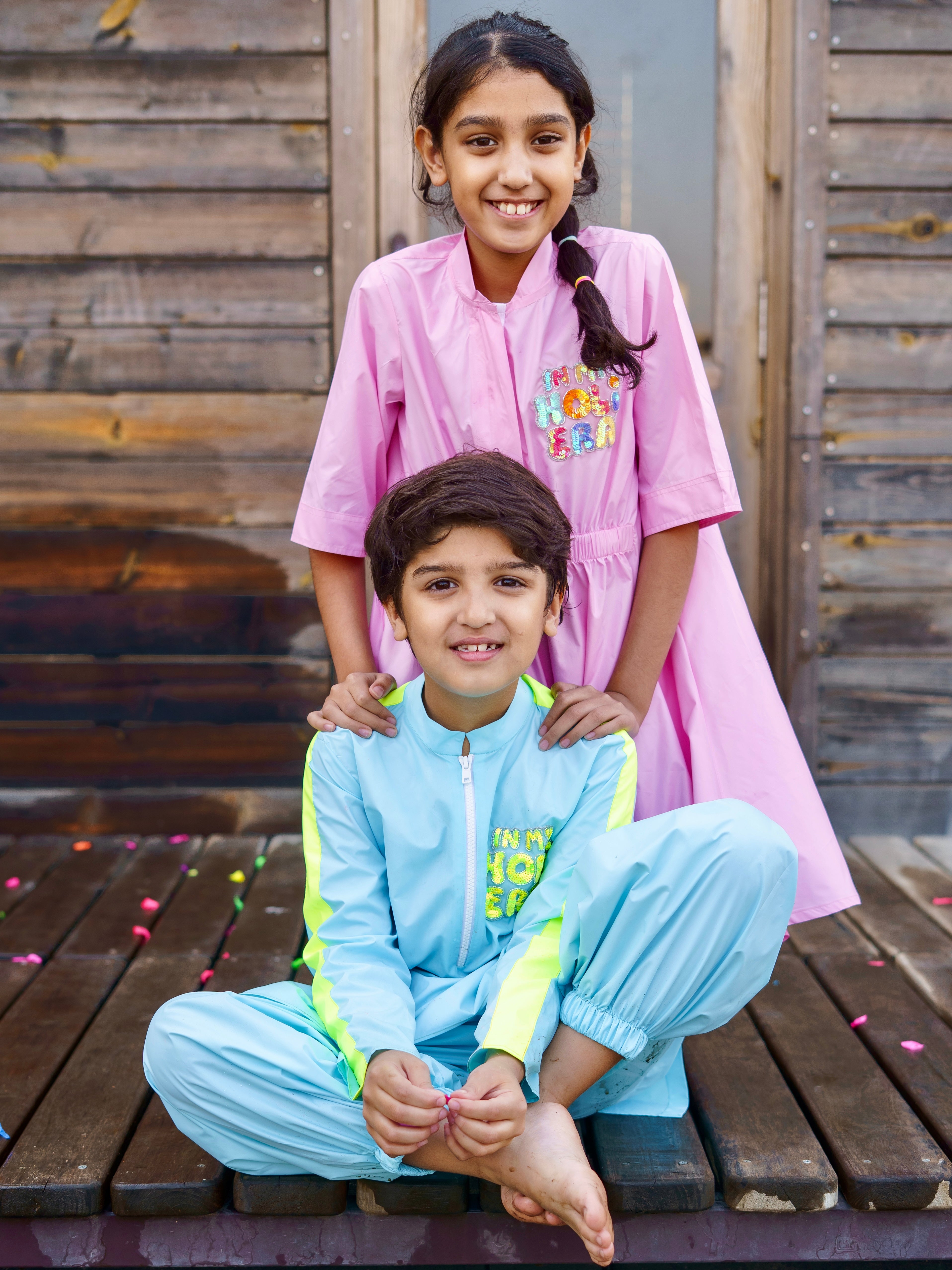 In my Holi Era Embellishment on a water resistant dress created with elastic waist detailing for a fun and sporty look