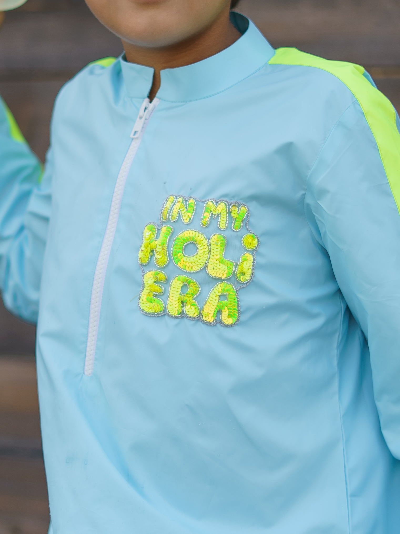 In My Holi Era Embellishment on a water resistant kurta set created with elastic hem detailing for a fun and sporty look
