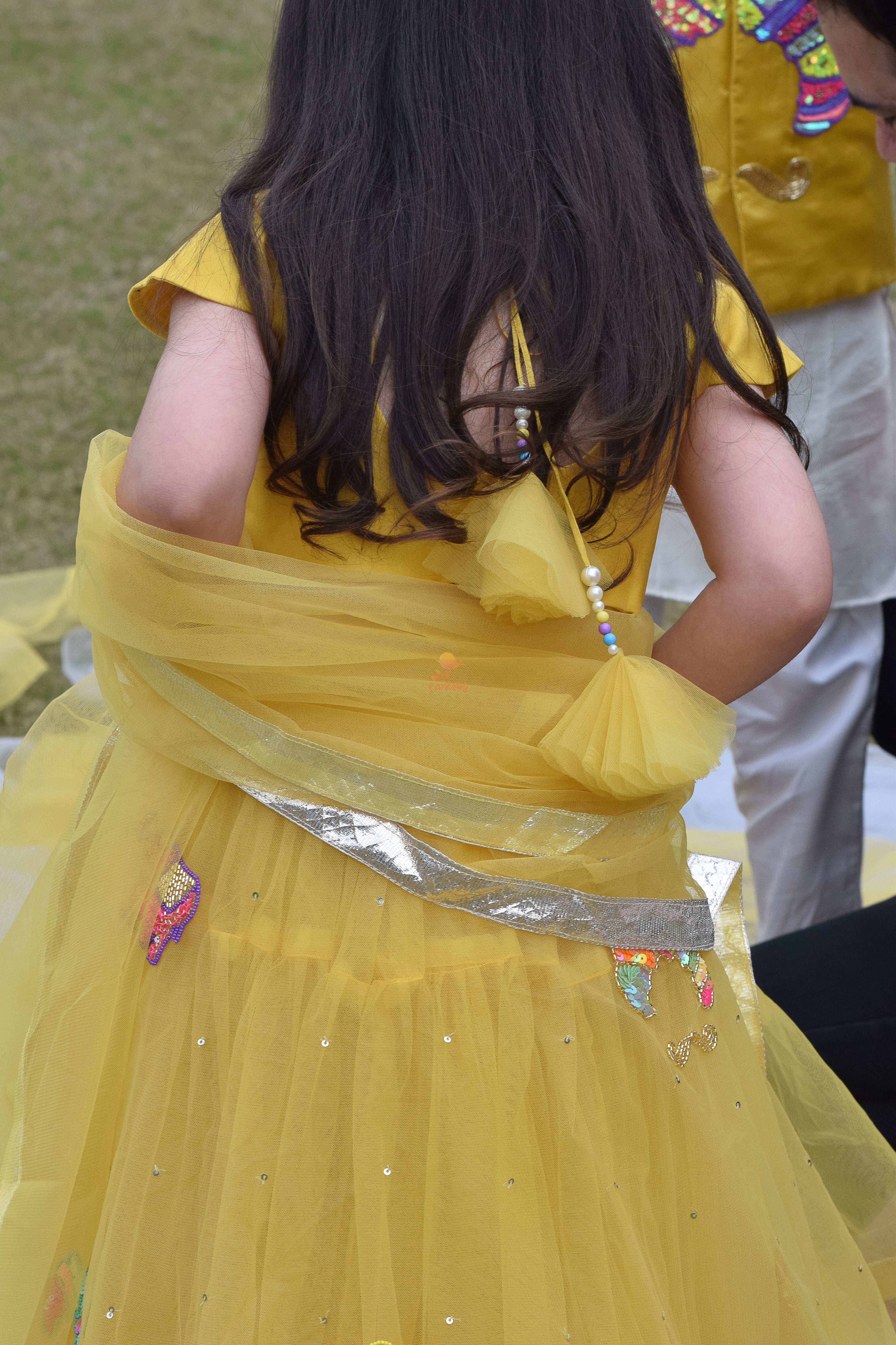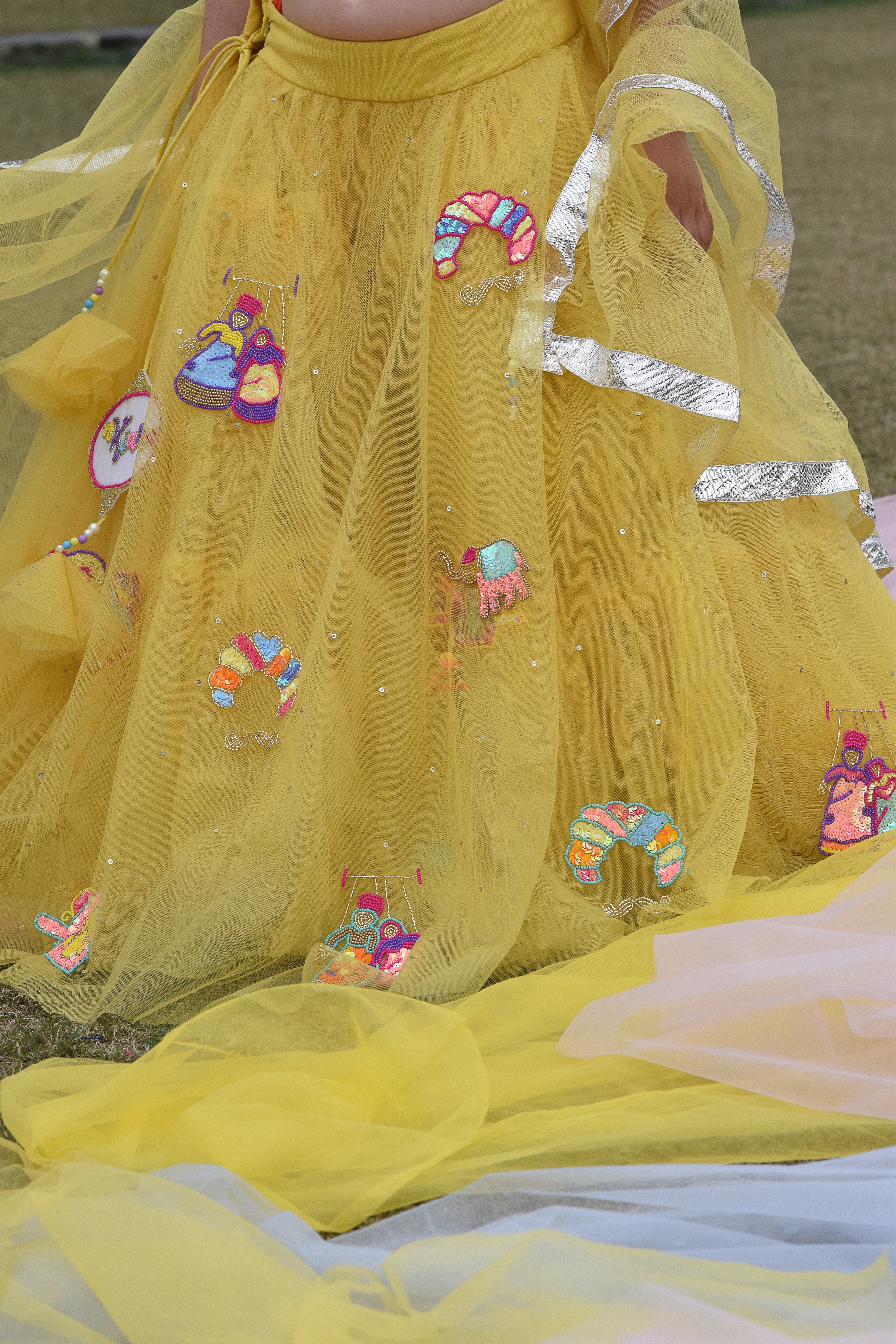 Rajasthan Themed Motifs hand embroidered all over the Lehenga skirt. Pleated Blouse. Net Dupatta with Gota Detailing. Embroidered Tassles not included.