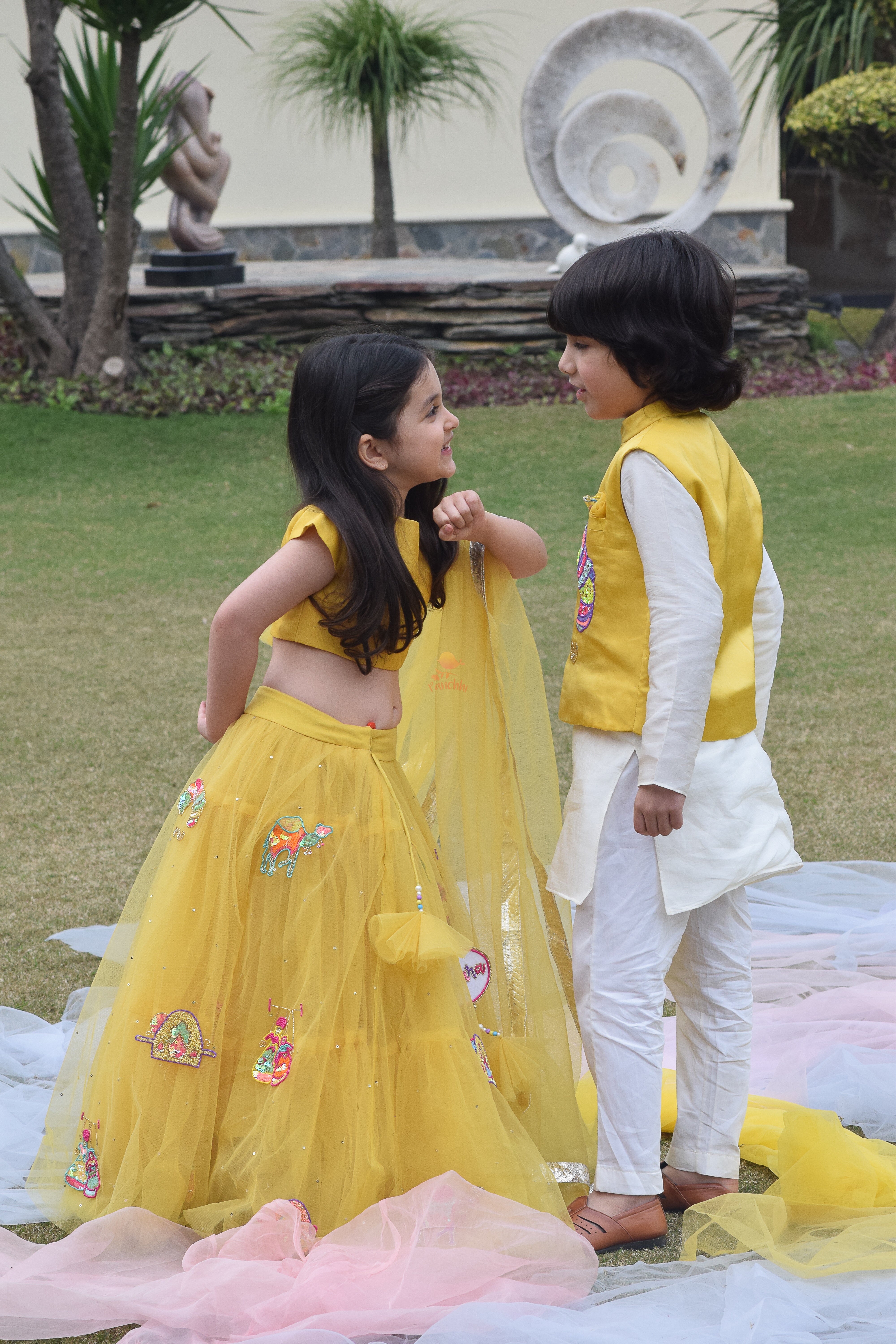 As colourful as an Indian Tyohaar! This kurta features our custom print — elephants, birds, hearts and florals, all brought together in a joyful patchwork. Perfect for a statement festive look. Fabric: Kurta: Custom Print Silk blend Pants:Cotton Lycra Note - For Name and...
