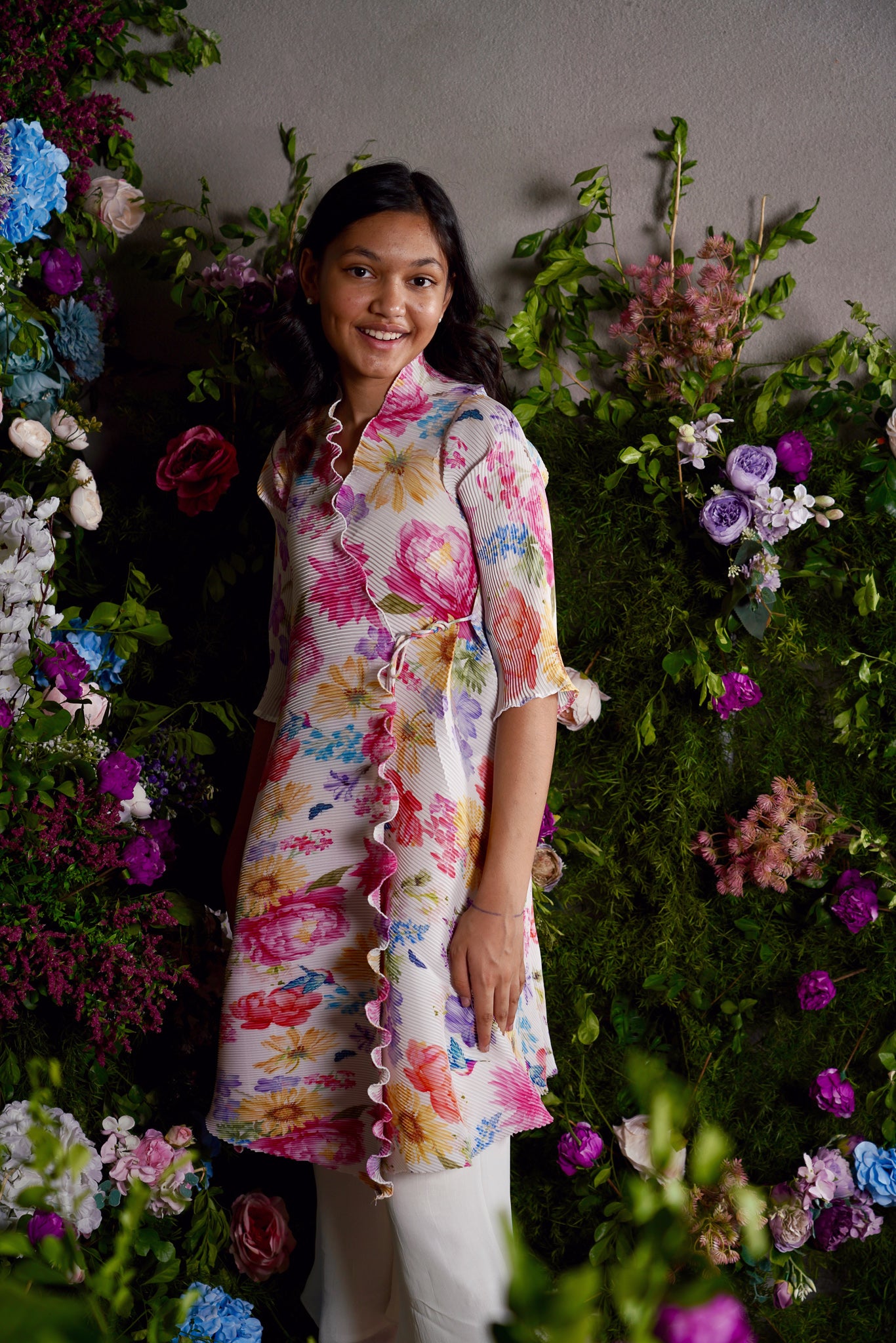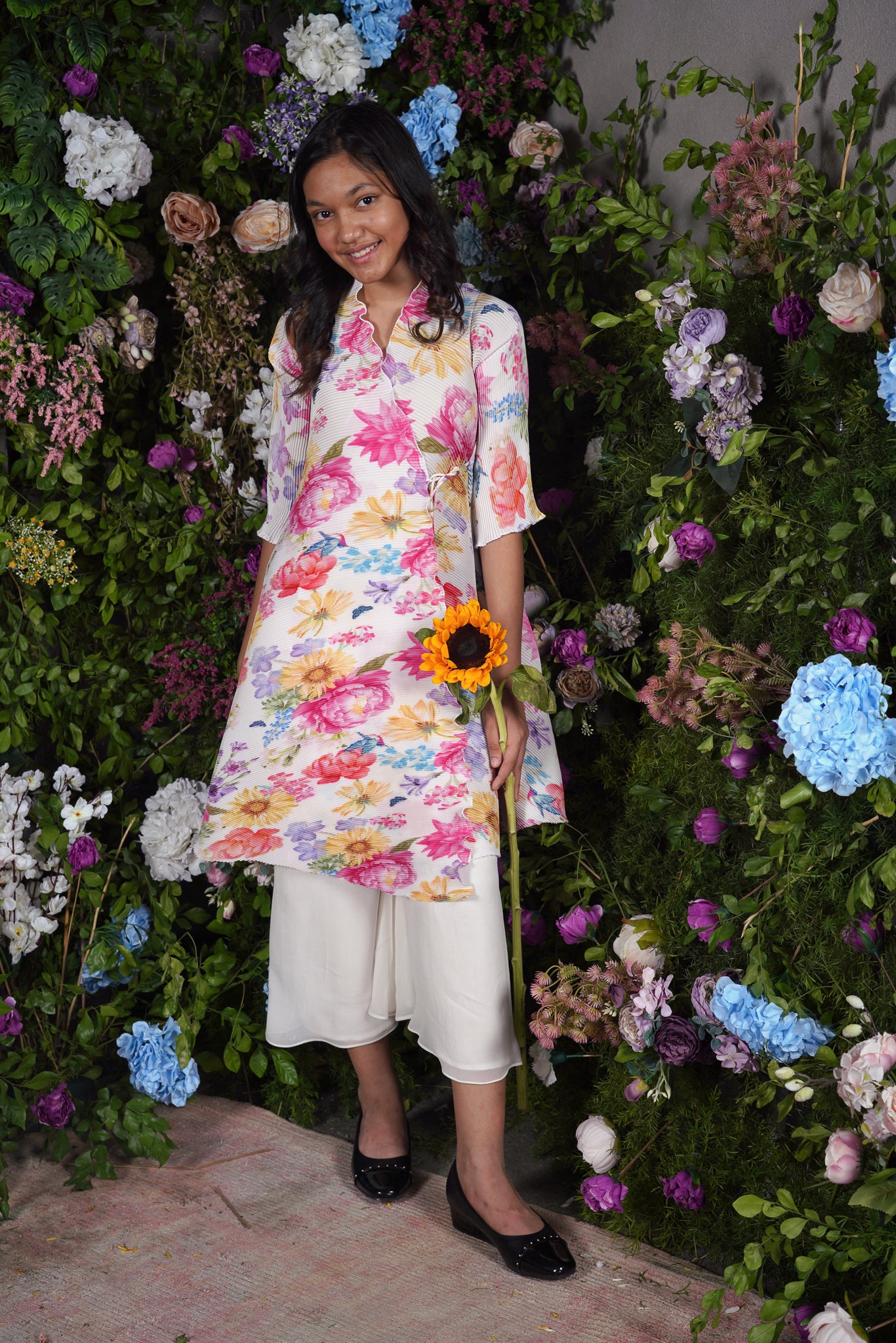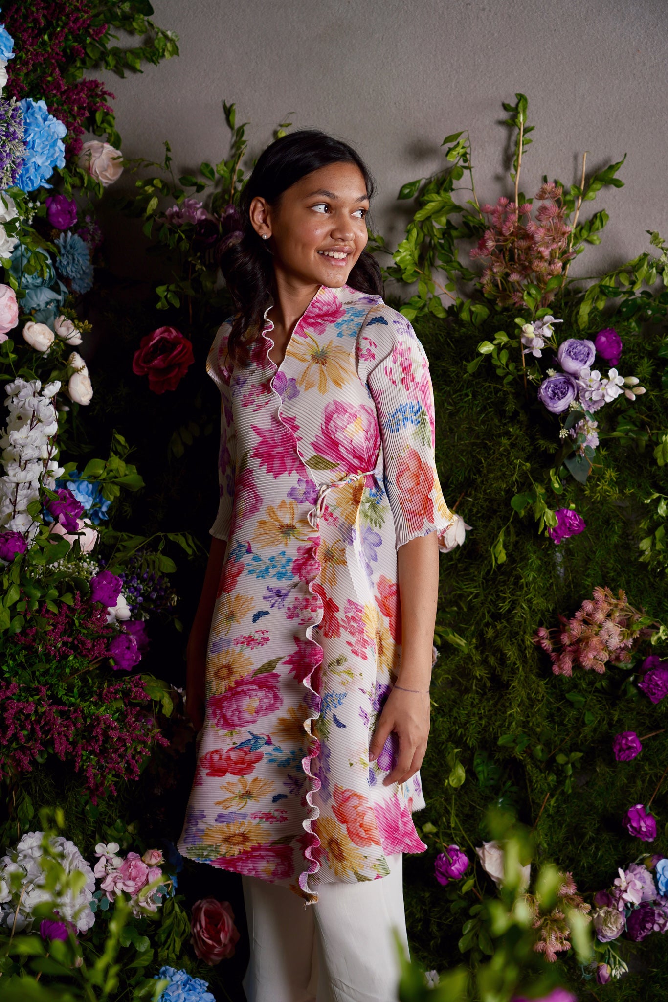 Overlap Tunic in Pleated Satin with tie up detailing paired with Narrow Palazzo Pants