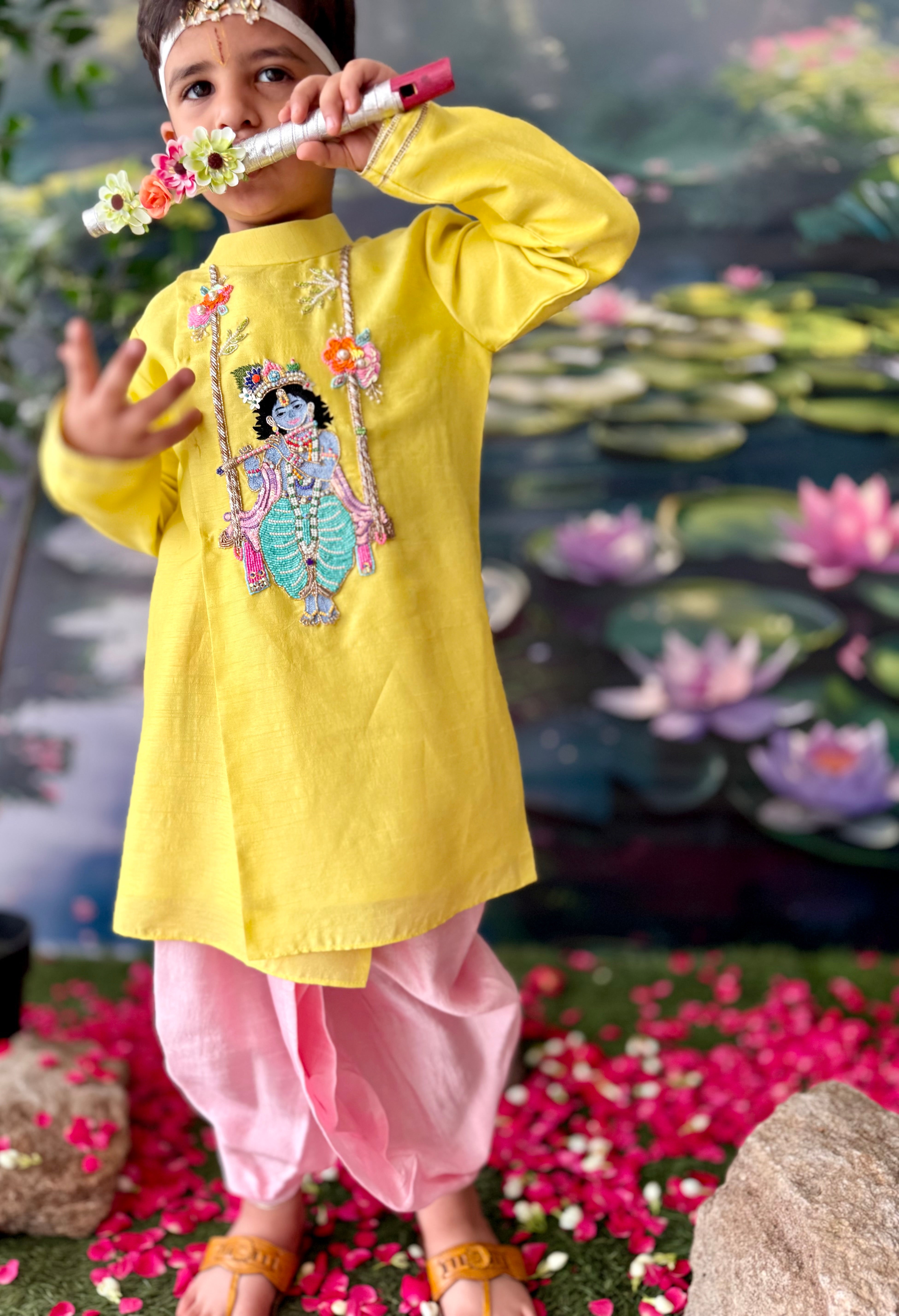 Krishna in a floral Jhoola (Swing) Embroidered Kurta with traditional center pleats dhoti style pants with tassel detailing.