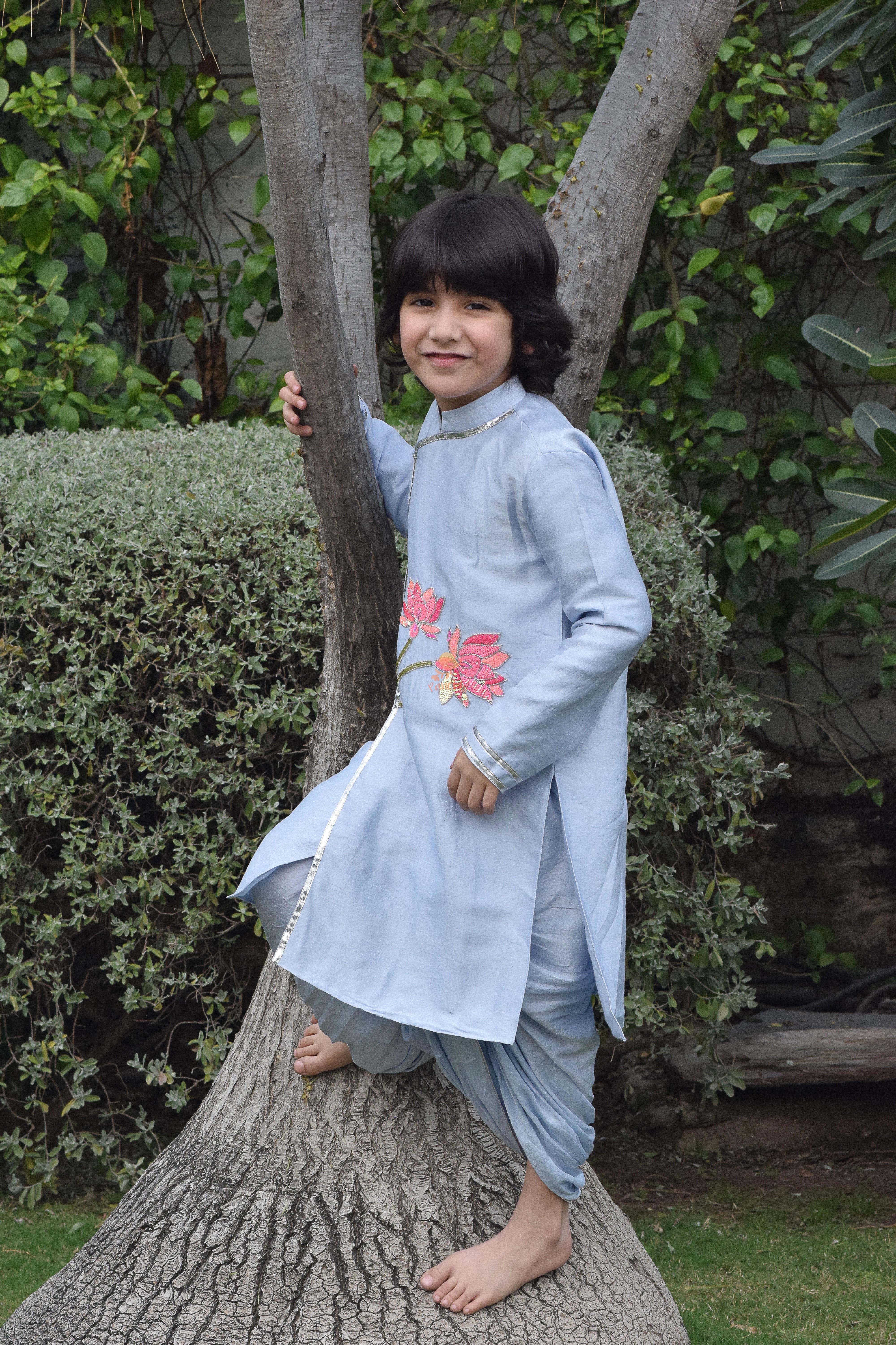 Lotus embroidered kurta with Traditional dhoti. Gota detailing on kurta