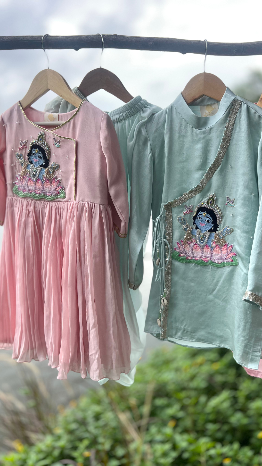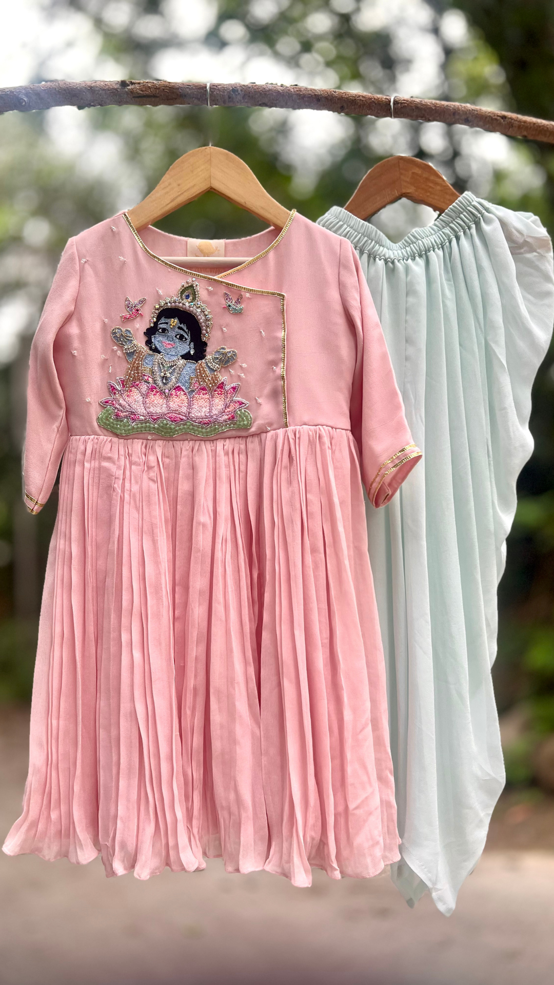 Embroidery Details: Krishna sitting on an ombre lotus under droplets of Crystal Rain Drops with birds flying around in a pastel pink pleated detailed Angrakha.