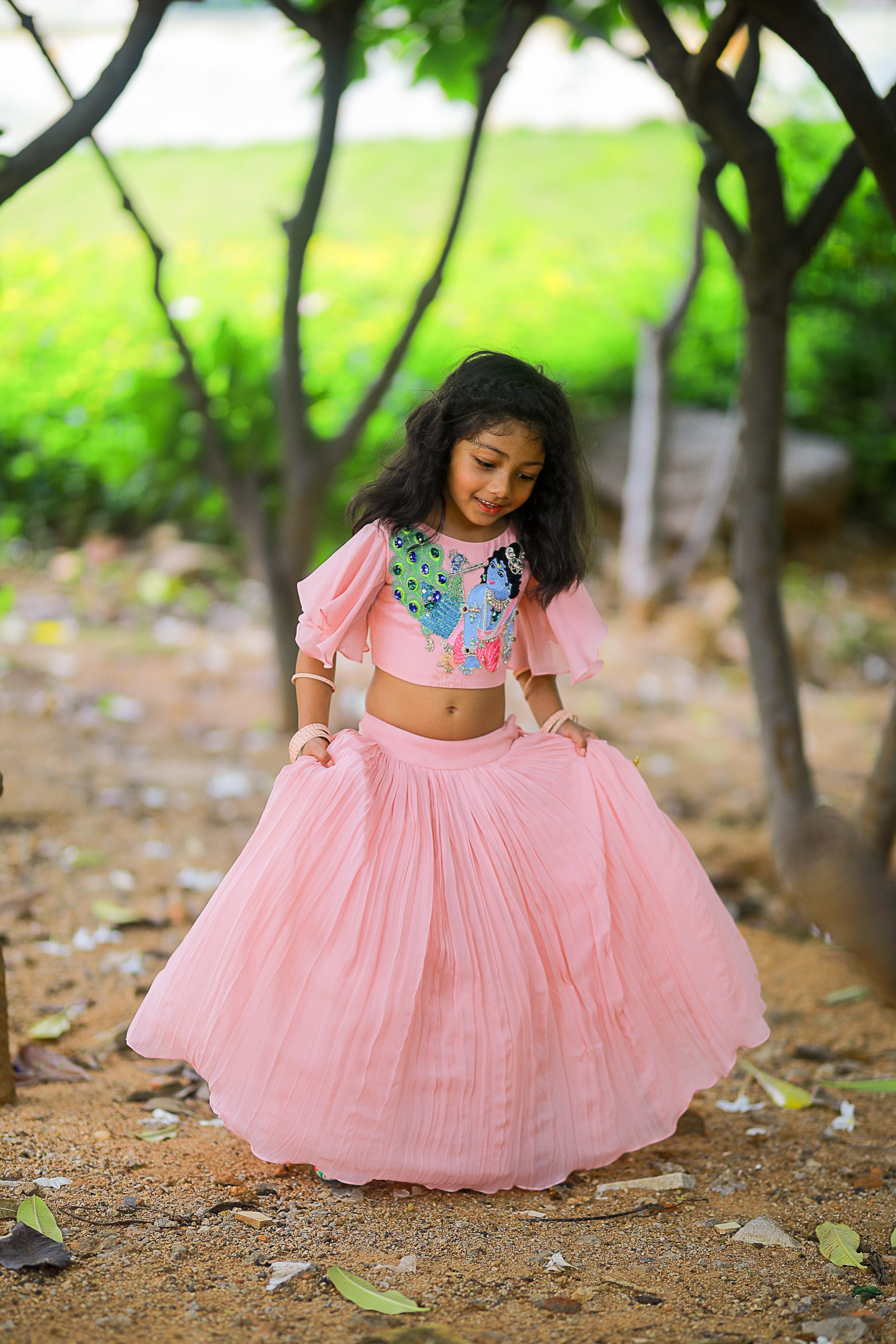 Bal-Krishna and Peacock Embroidered Blouse with Pleated Lehenga and Dupatta