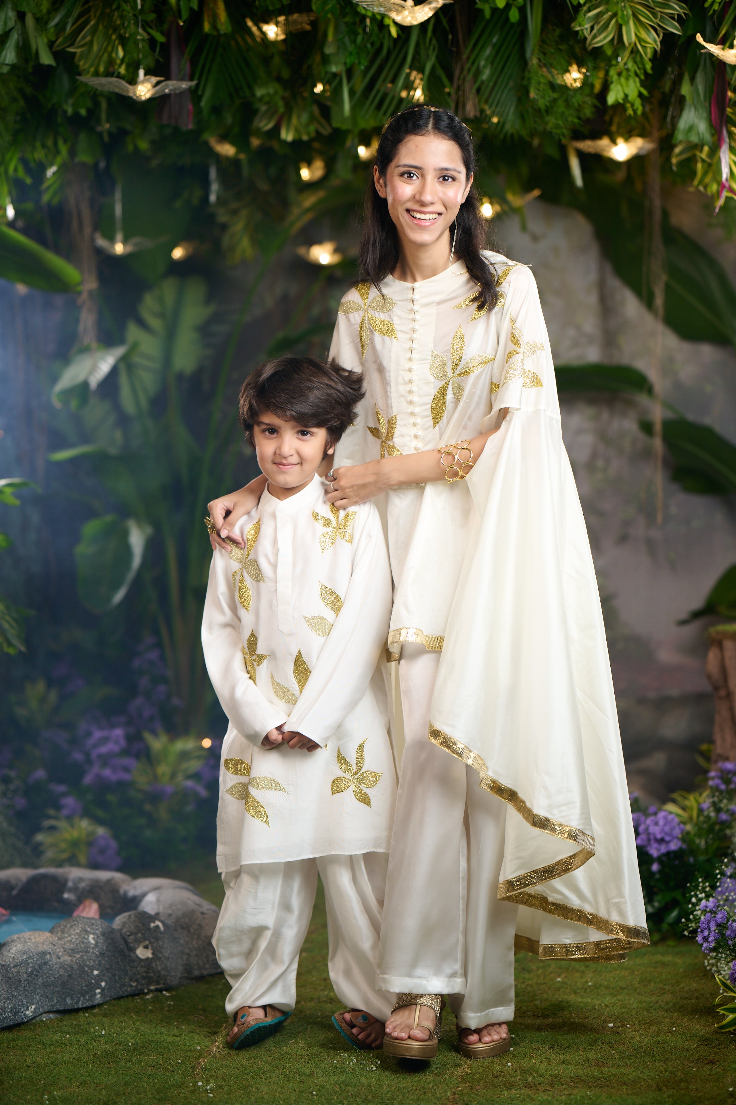 An Ivory Embroidered Kurta Set with Golden Leaves and flowers that bring to life the charm of an enchanted forest. Its a blend of tradition and modernity.