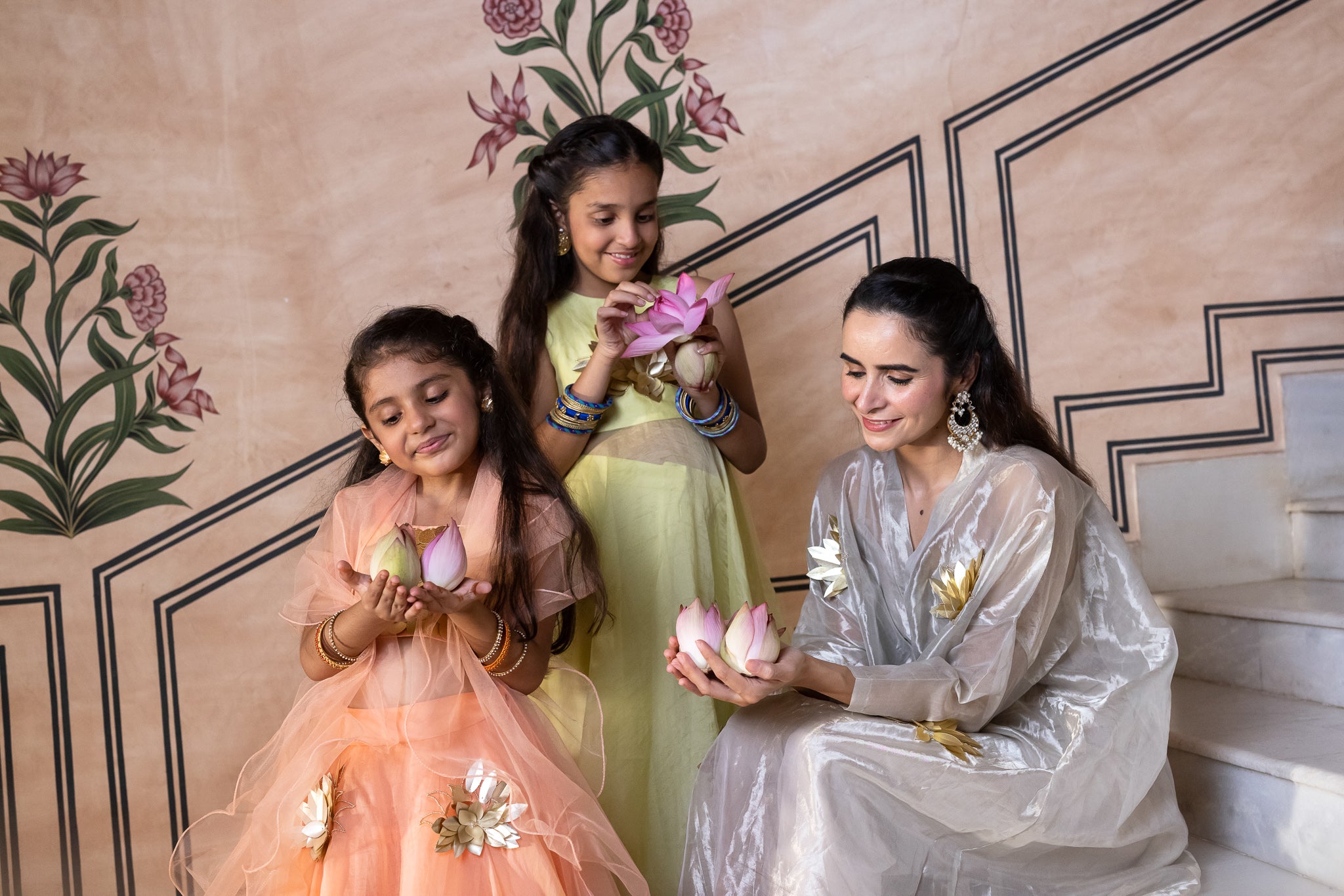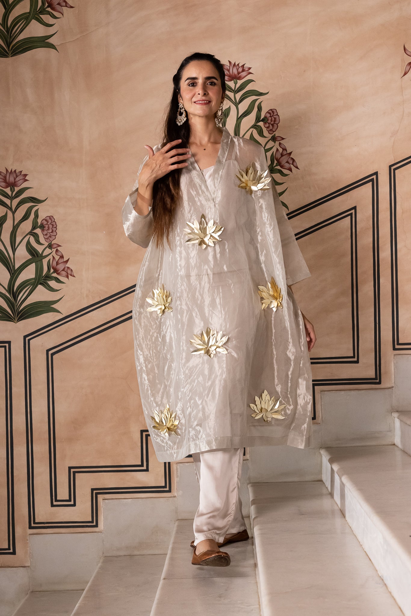 3D Petals Embroidered as Lotus all over a Silk Tissue Kaftan style long tunic with 3/4 sleeves. Paired with a slip and Pants.