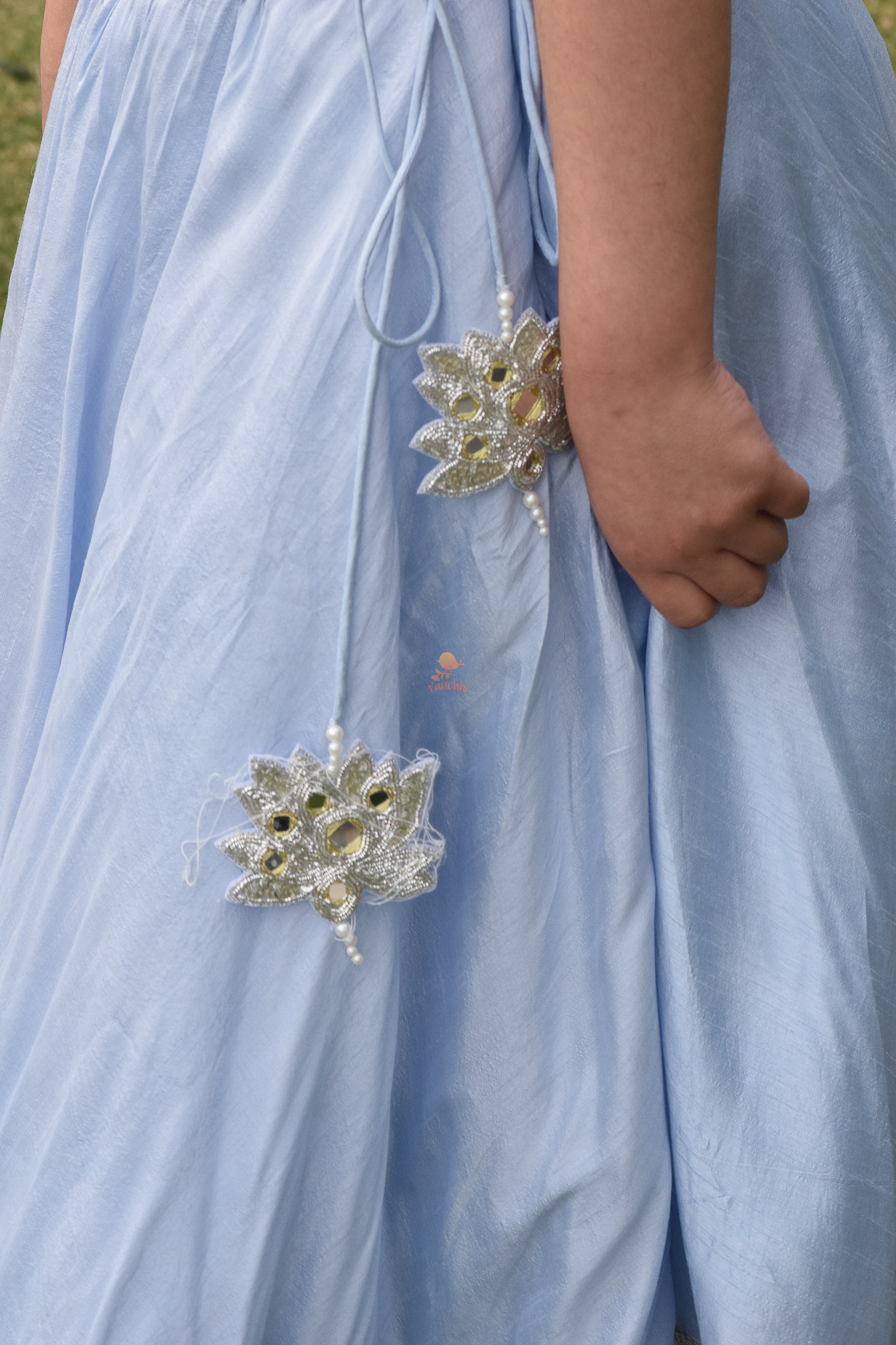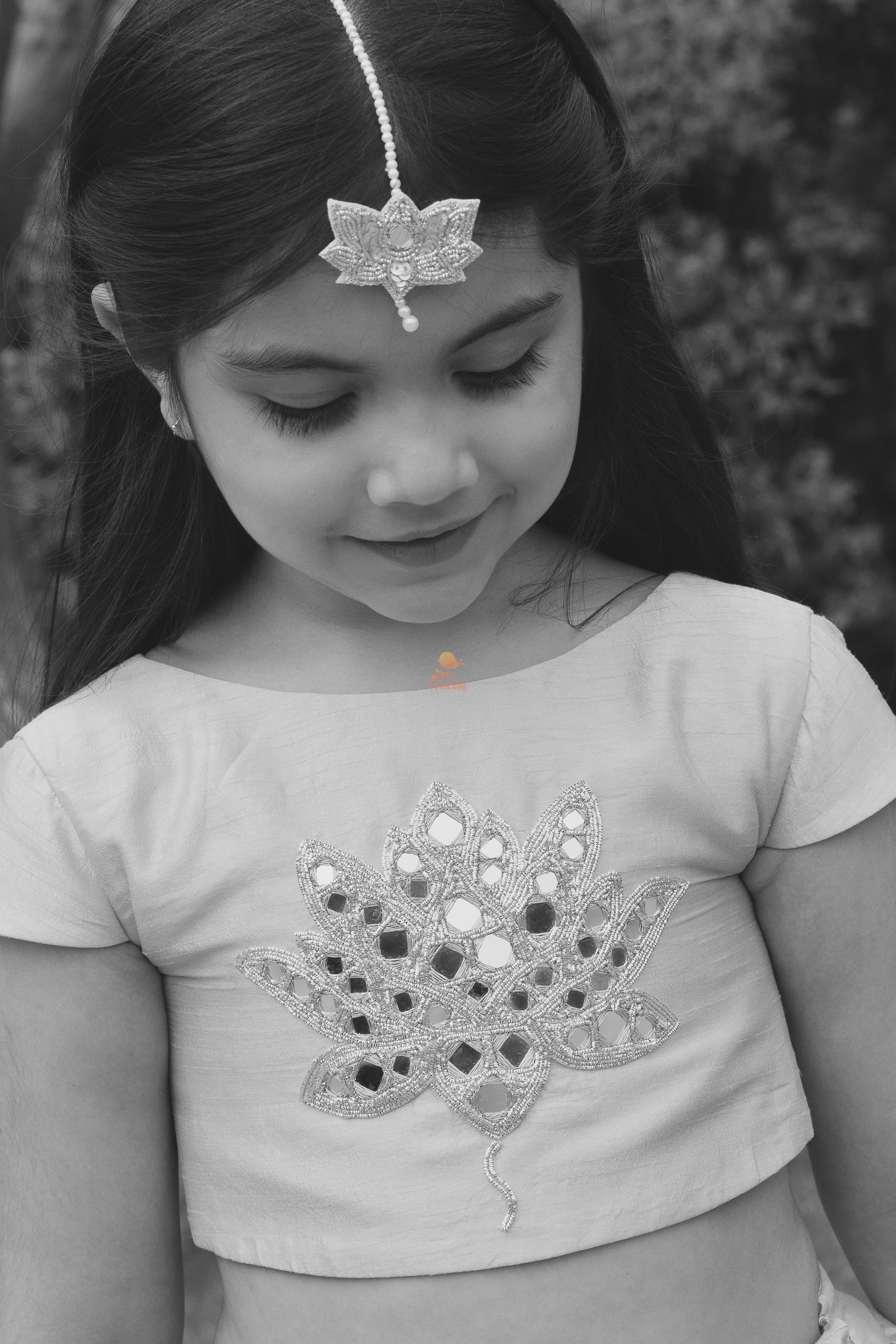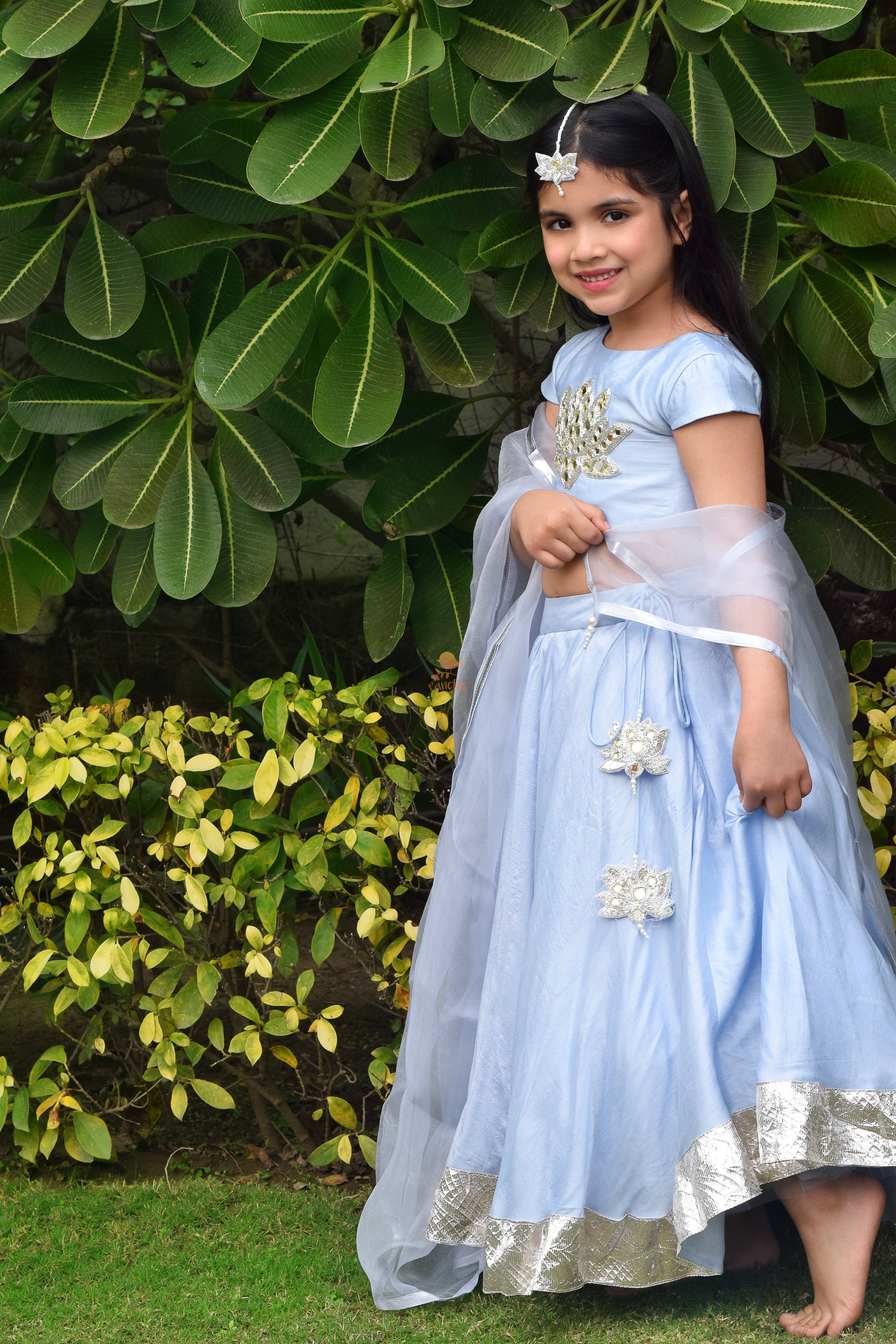Blouse with Lotus embroidered in Mirror Work paired with Gota Detailed Lehenga skirt. Lotus in Mirror work Tassles. Net Dupatta included.