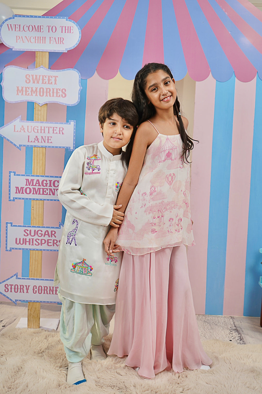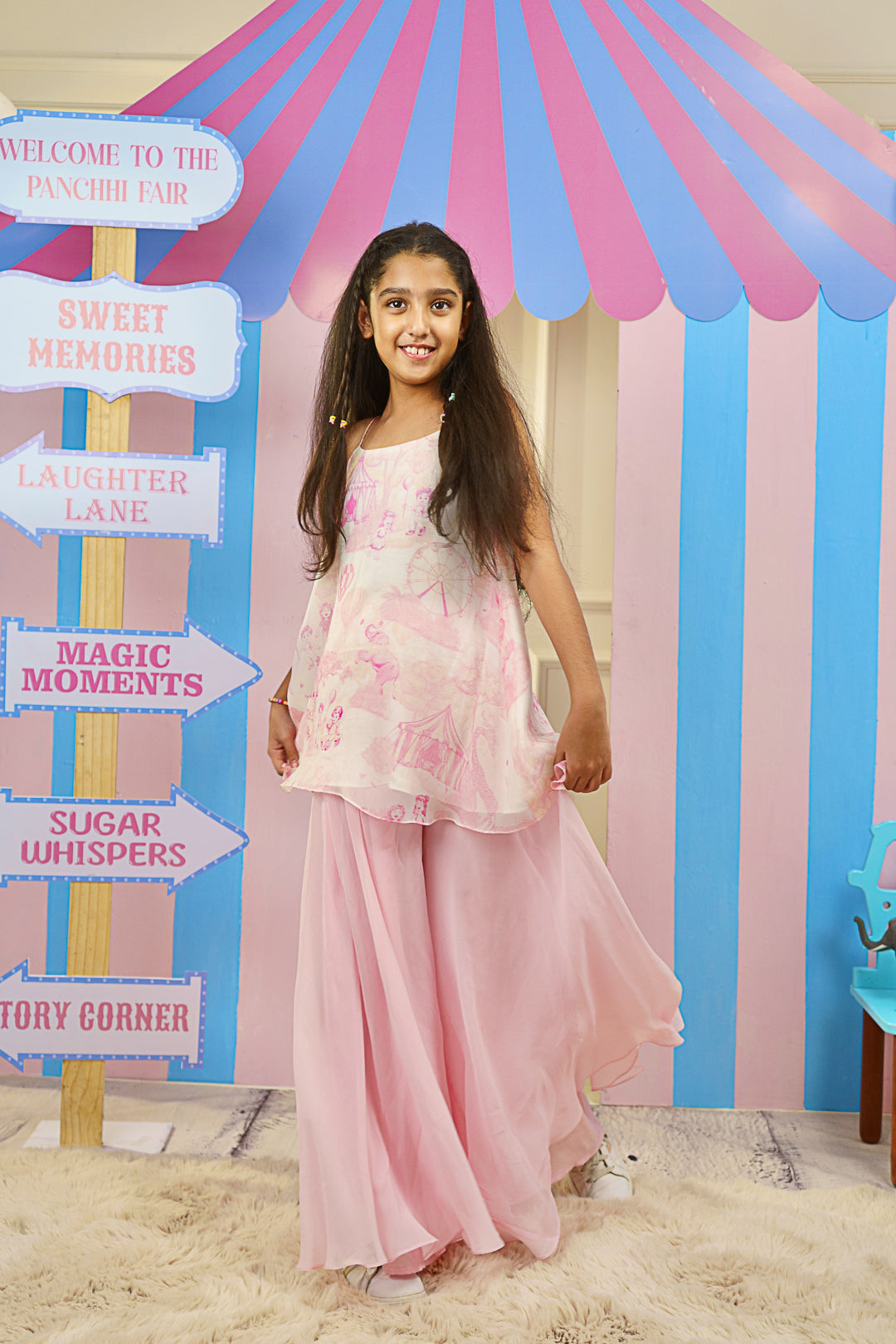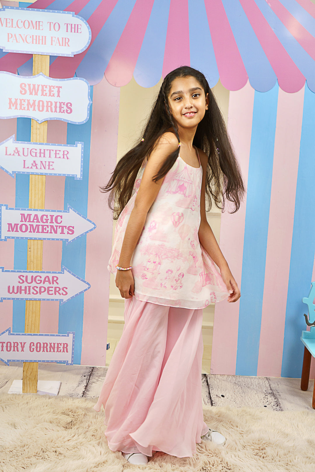 A tunic set in Toile De Juoy style Print in a children's carnival theme