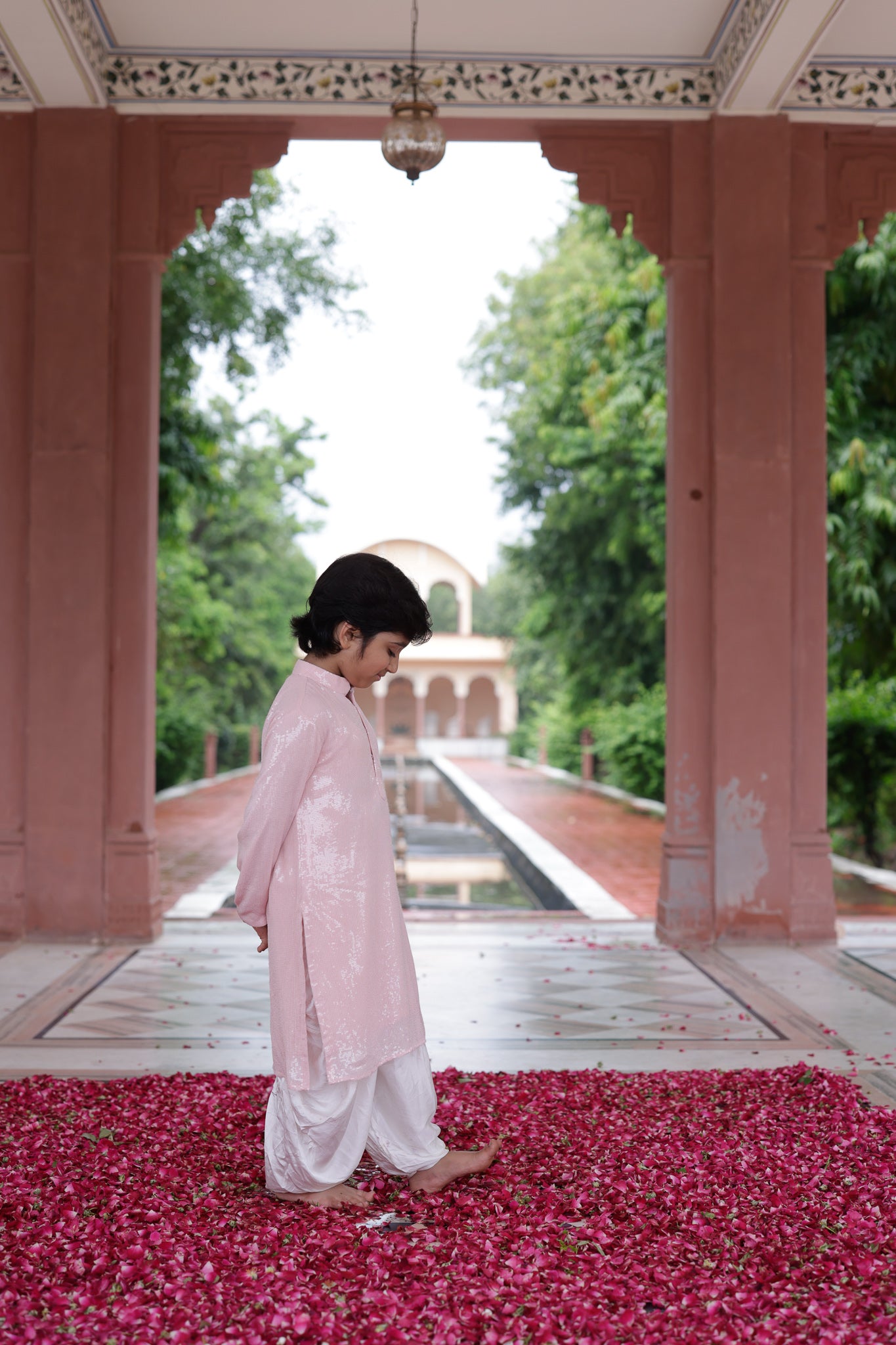 Plain Kurta in Pink Water Sequinned Fabric Paired with Dhoti Pants.