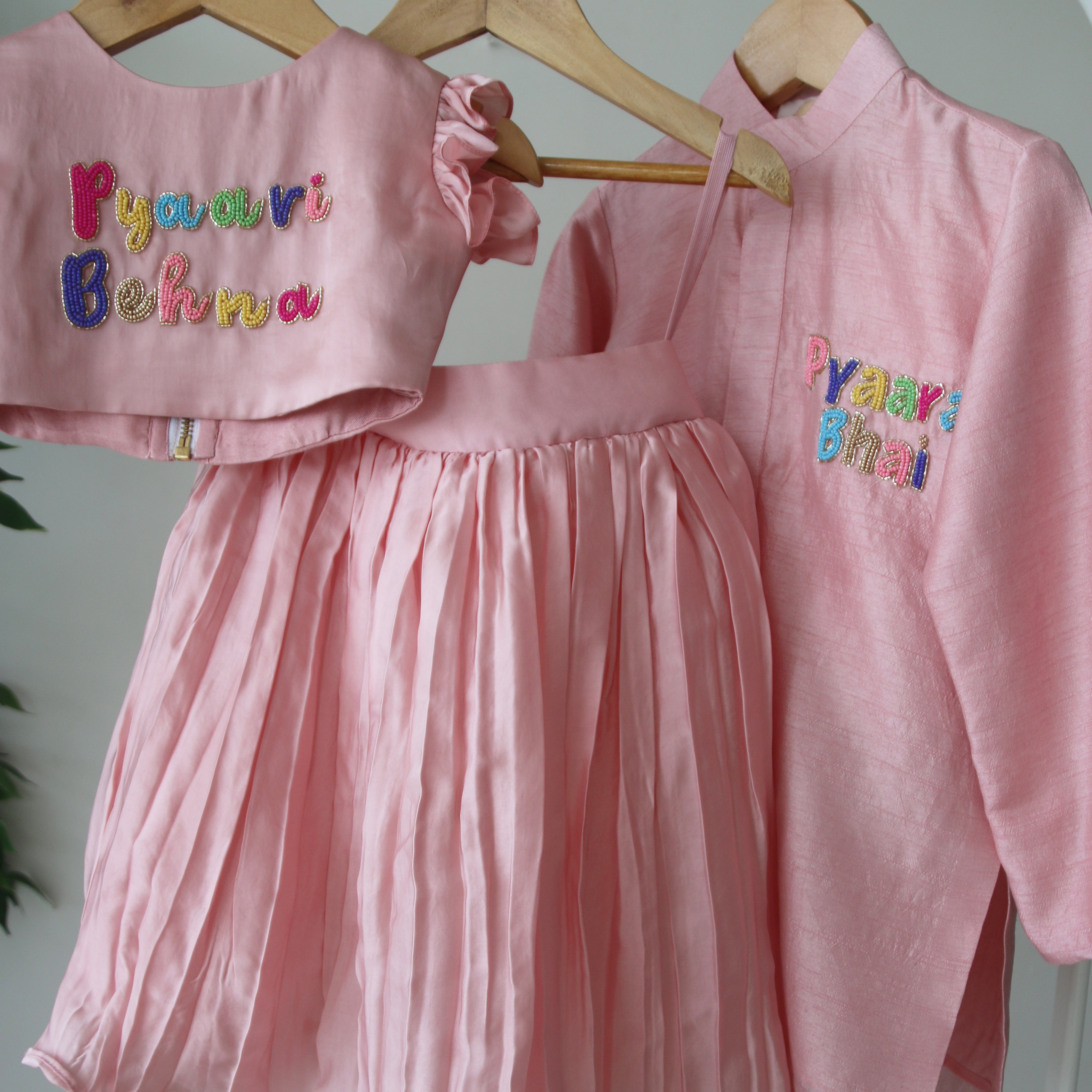 Pyaari Behna Typography hand embroidered blouse with a pleated skirt.
