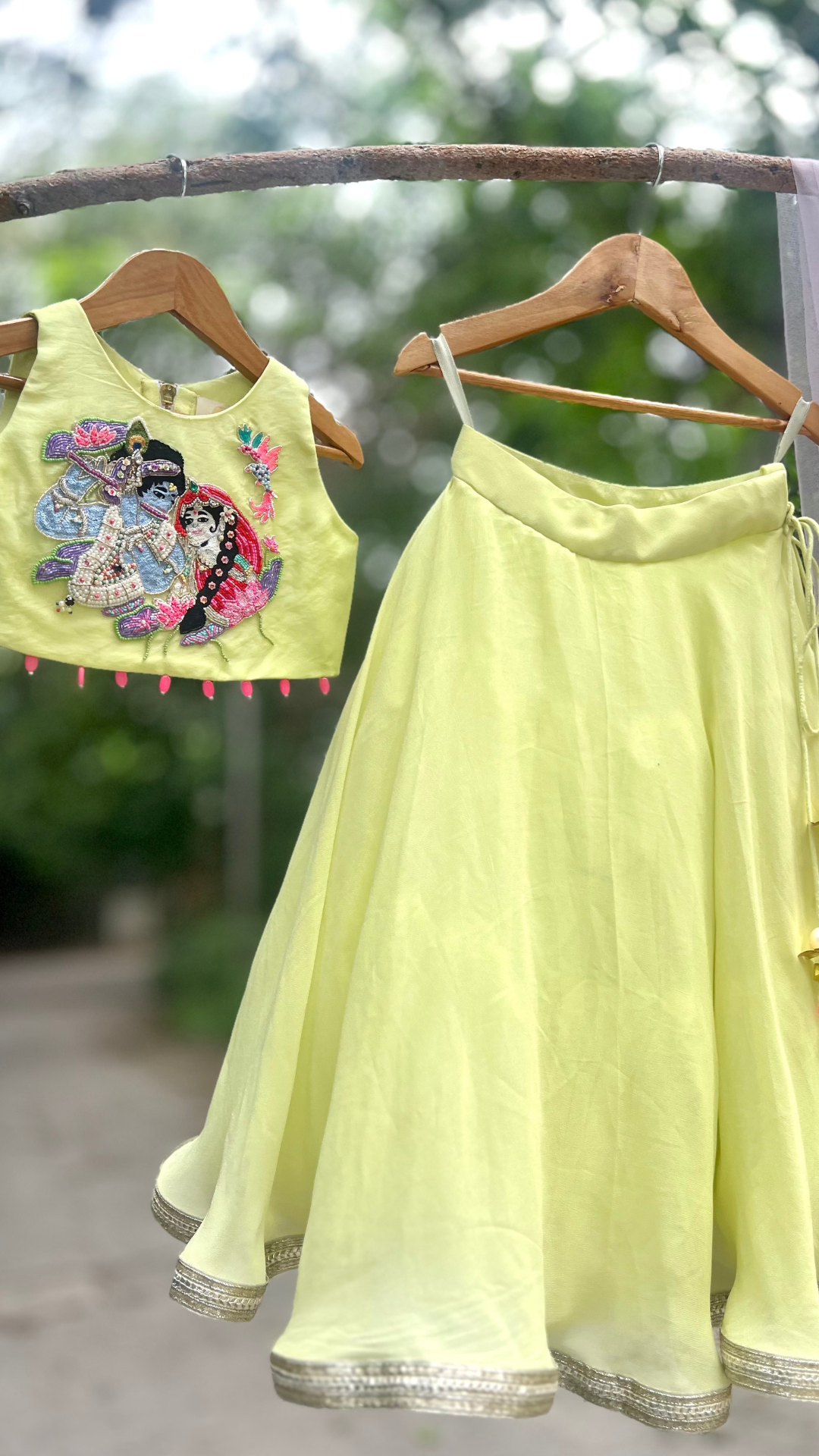 Radha-Krishna embroidered Blouse with Gota Detailed Lehenga. . Embroidery Detailing: Krishna playing flute and joined by his beloved surrounded by Lotuses and nature.