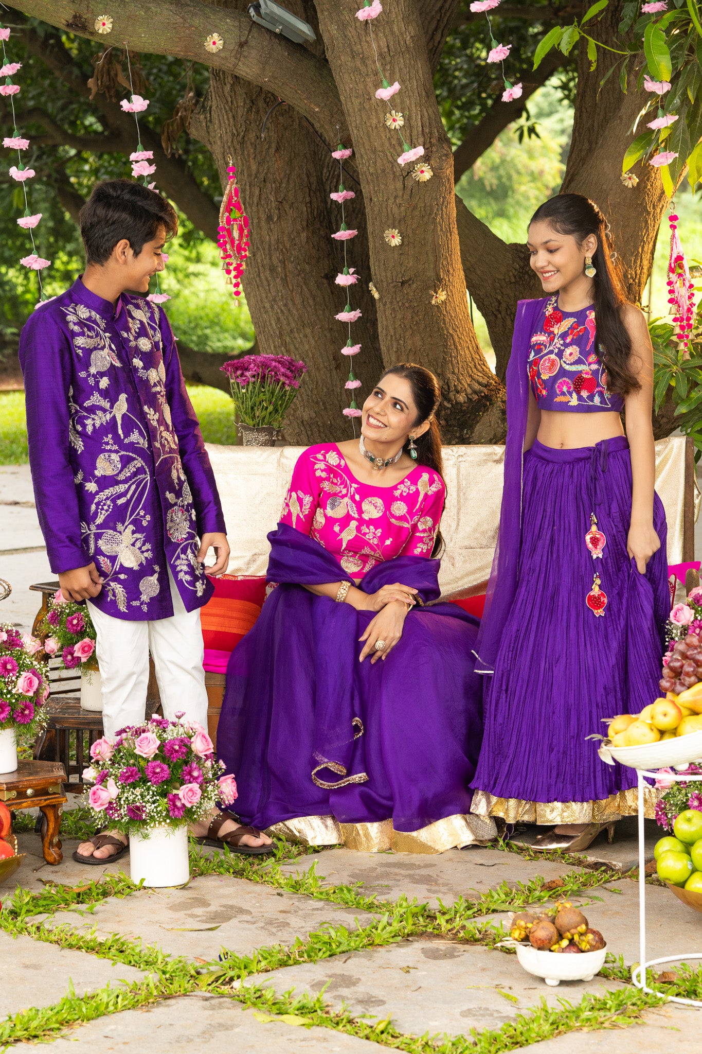 Inspired by the colourful Rang Mahals of Rajasthan, this lehenga is an ode to festivity. The jewel-toned skirt flows gracefully, while the pink embroidered blouse features gold parrots and floral vines — symbols of auspiciousness and happiness.