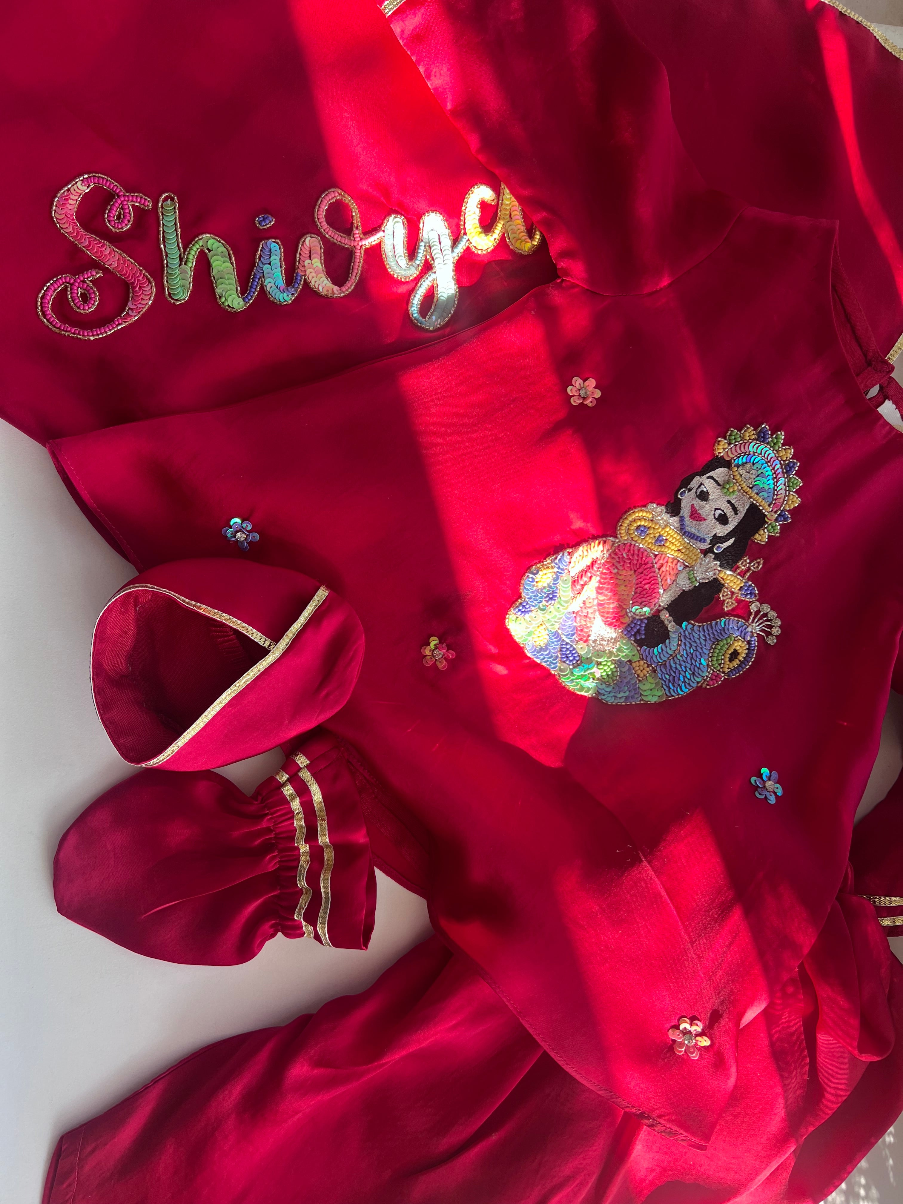 Newborn Jaamna Set with Goddess Saraswati embroidered Tunic Set.