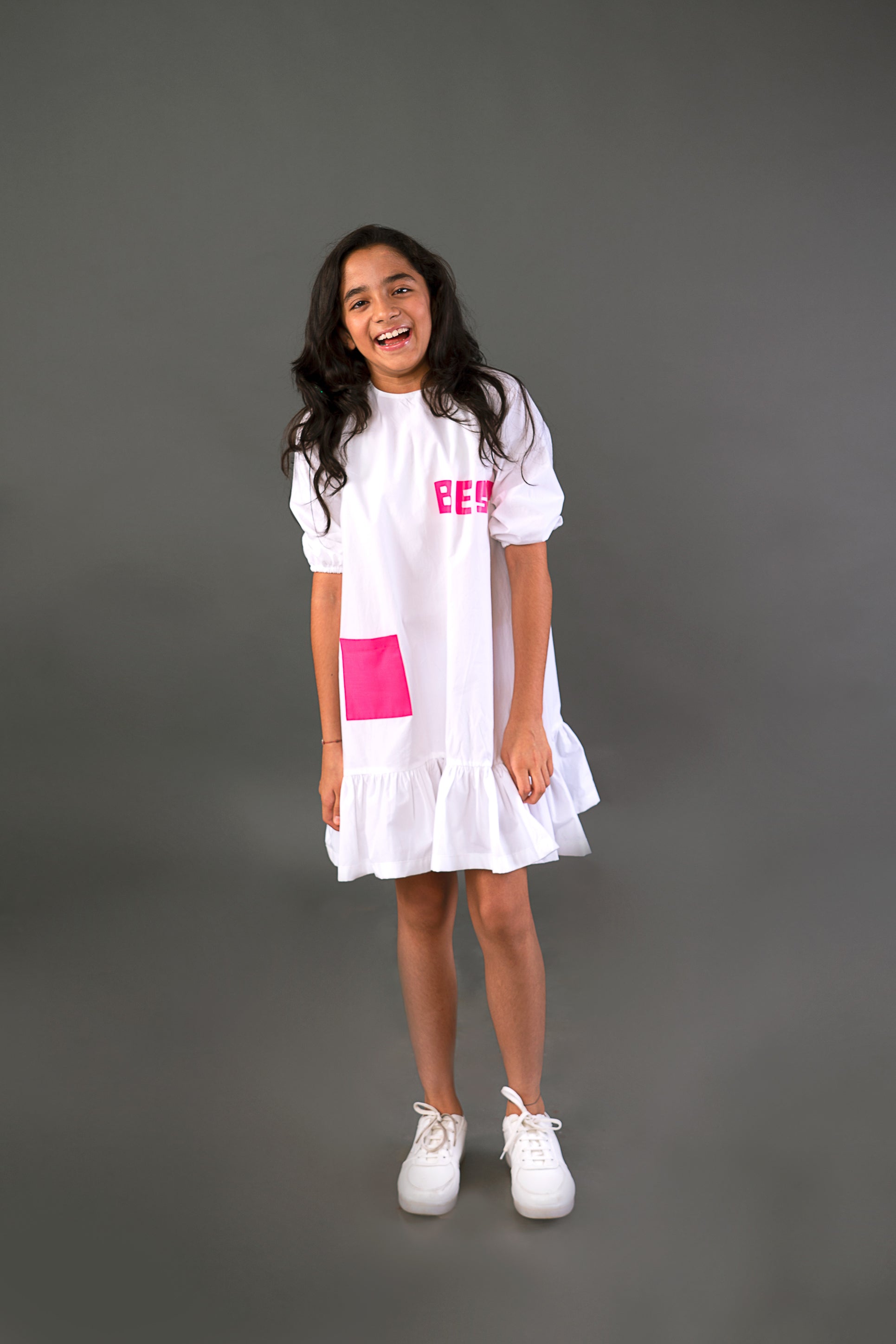 Frill Detailed Short Dress with "BEST" prominently displayed in big, bold letters on the dress, making a confident and impactful statement. The typography is carefully crafted to create a visually striking effect, ensuring that the message stands out and captures attention. Pocket detailing and puff sleeves.