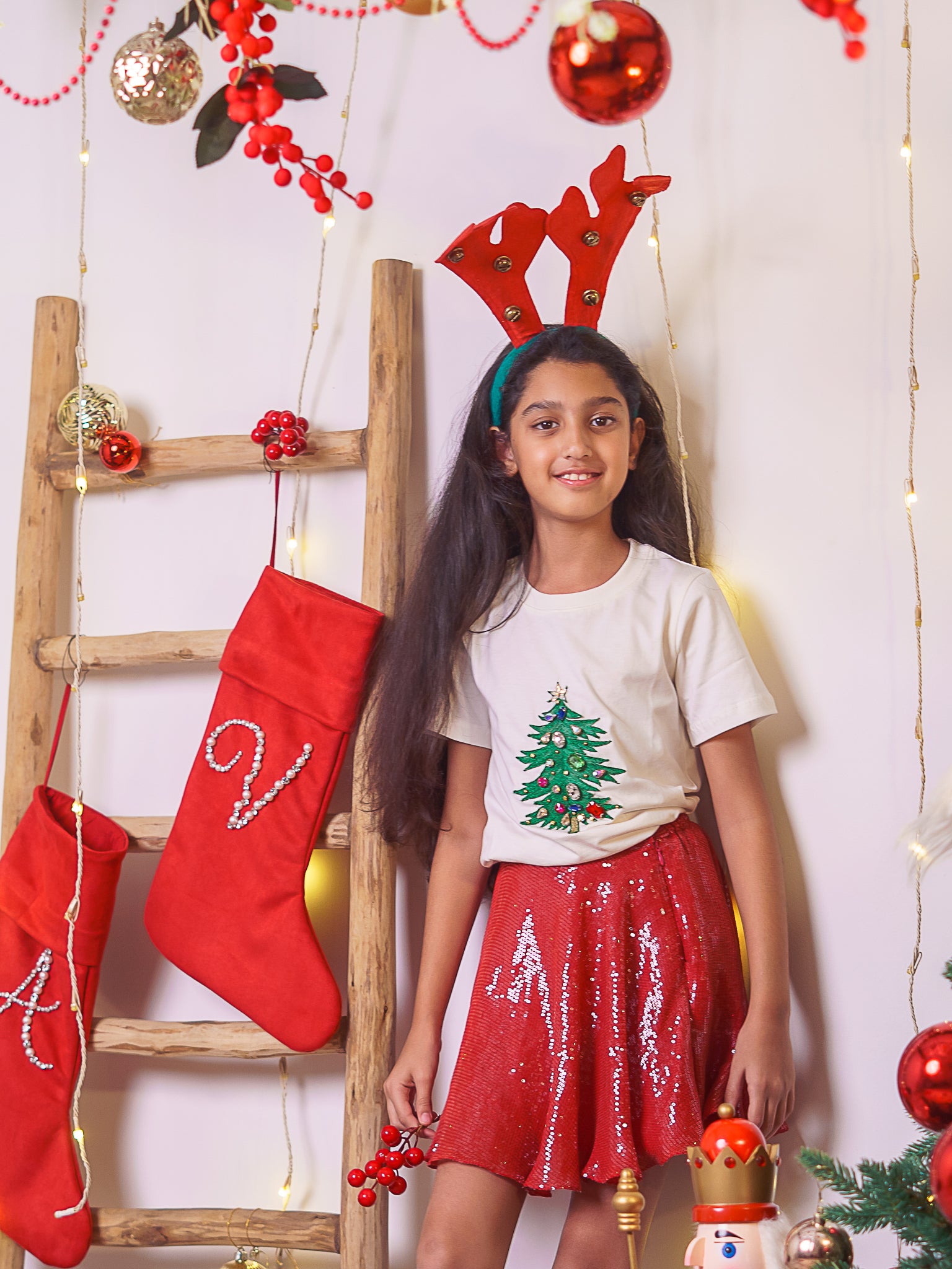 A sequined red skirt with 100% Cotton T-shirt embellished with a hand embroidered christmas tree made of shiny metallic threads and crystals.