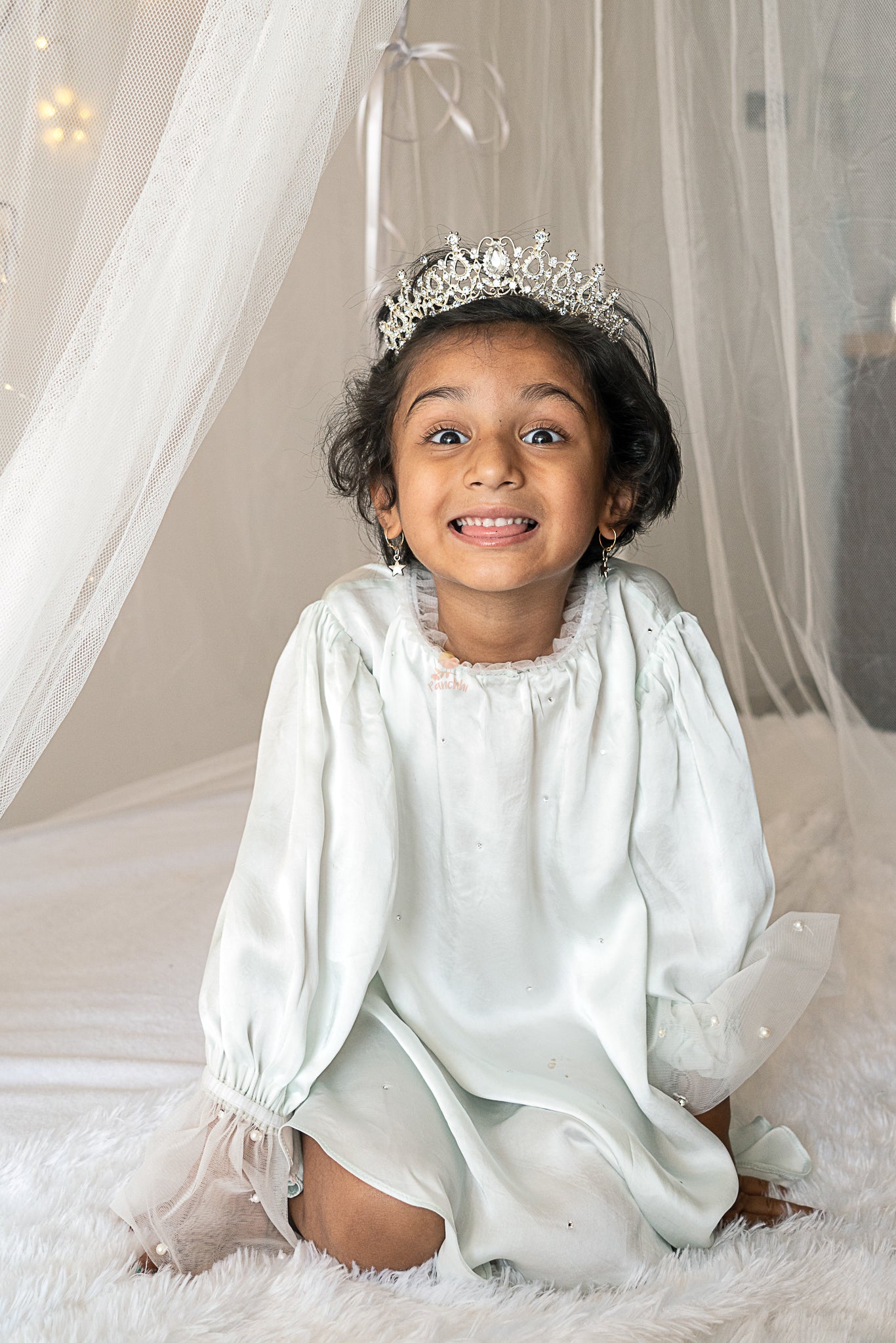 Loose fit and comfortable pastel nightdress with Original Round Swarovski Crystals Spread out on the entire front body. Tulle ruffle Detailing on the neck and sleeves with hand embroidered crystals and pearls
