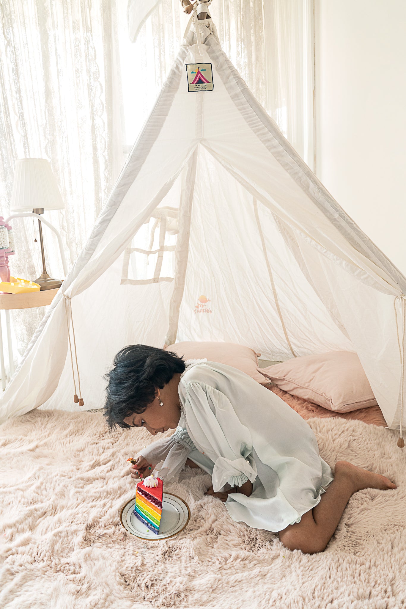 As colourful as an Indian Tyohaar! This coord set features our custom print — elephants, birds, hearts and florals, all brought together in a joyful patchwork. Perfect for a statement festive look. This outfit has no lining Fabric: Kurta: Custom Print Crepe Dhoti: Custom...