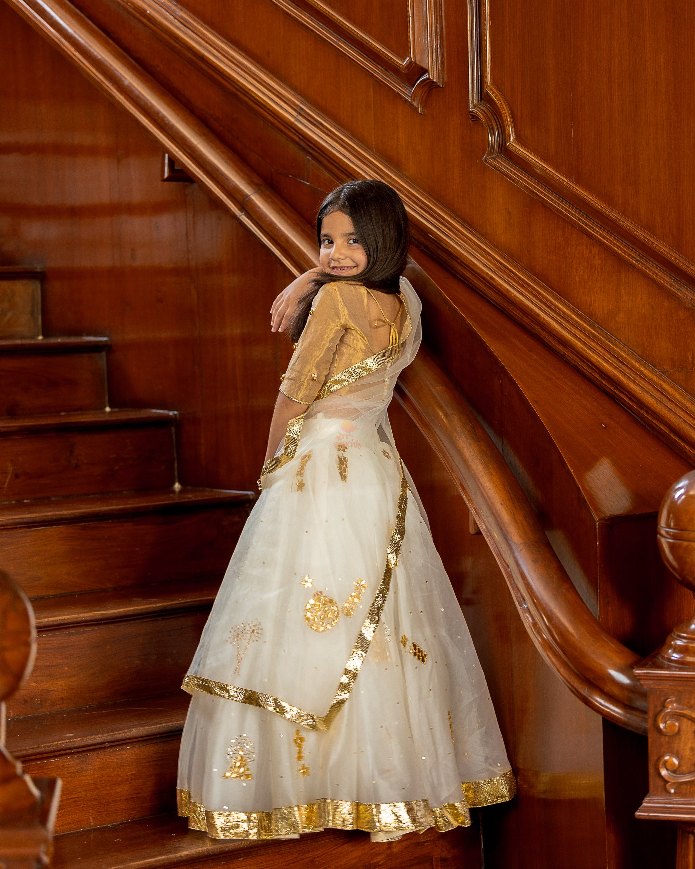 Silk Tissue Blouse embellished with Gota Pattti Flowers and Tassles paired with Gota Patti Crackers embroidered all over the skirt. Gota detailing at the hem. Gota Detailed Dupatta.