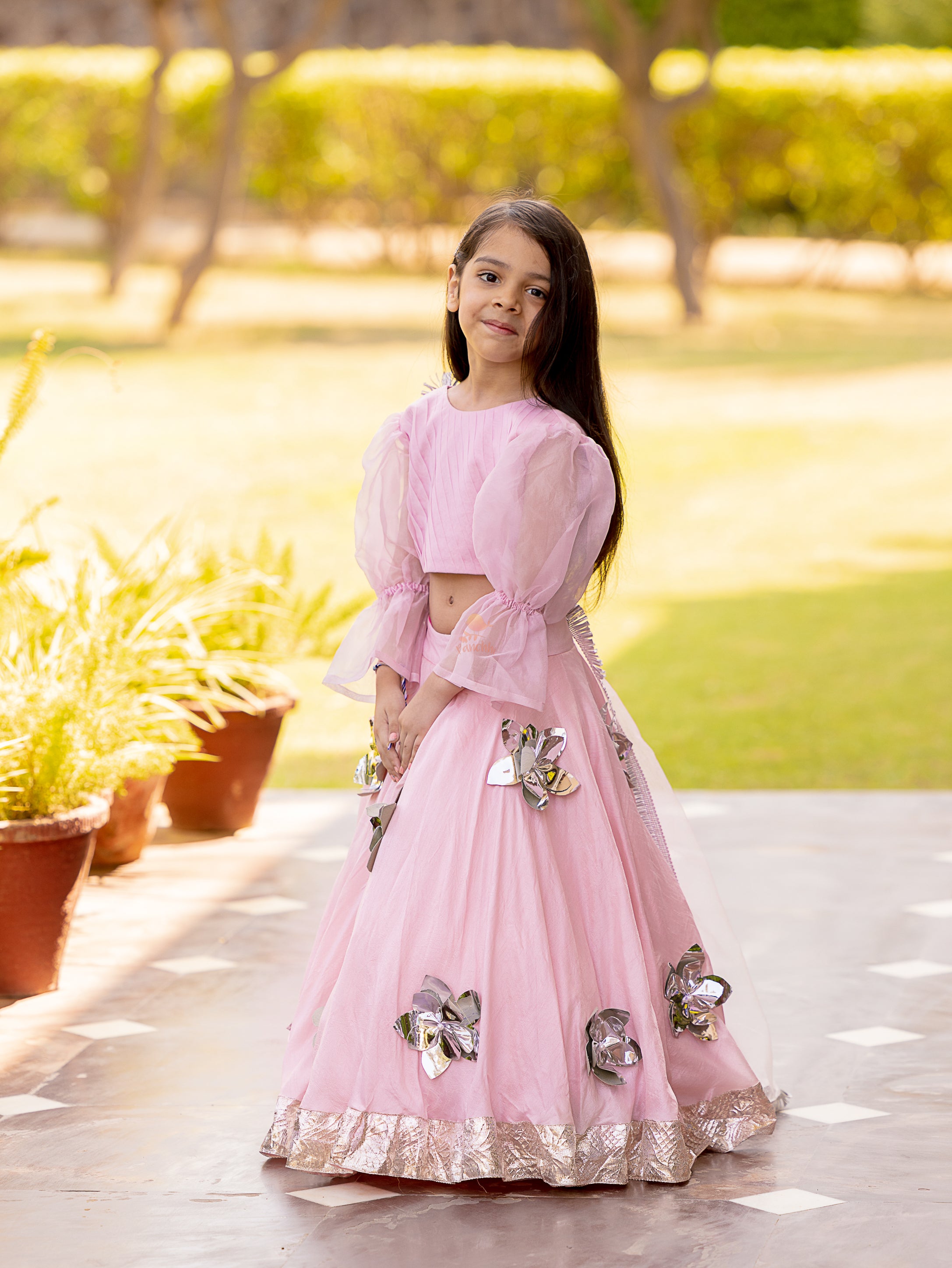Pleated Organza Blouse with Sleeves detailing and Leather Mogra Motifs Hand crafted and sewn all over the skirt. Gota Detailing at the hem and Dupatta.