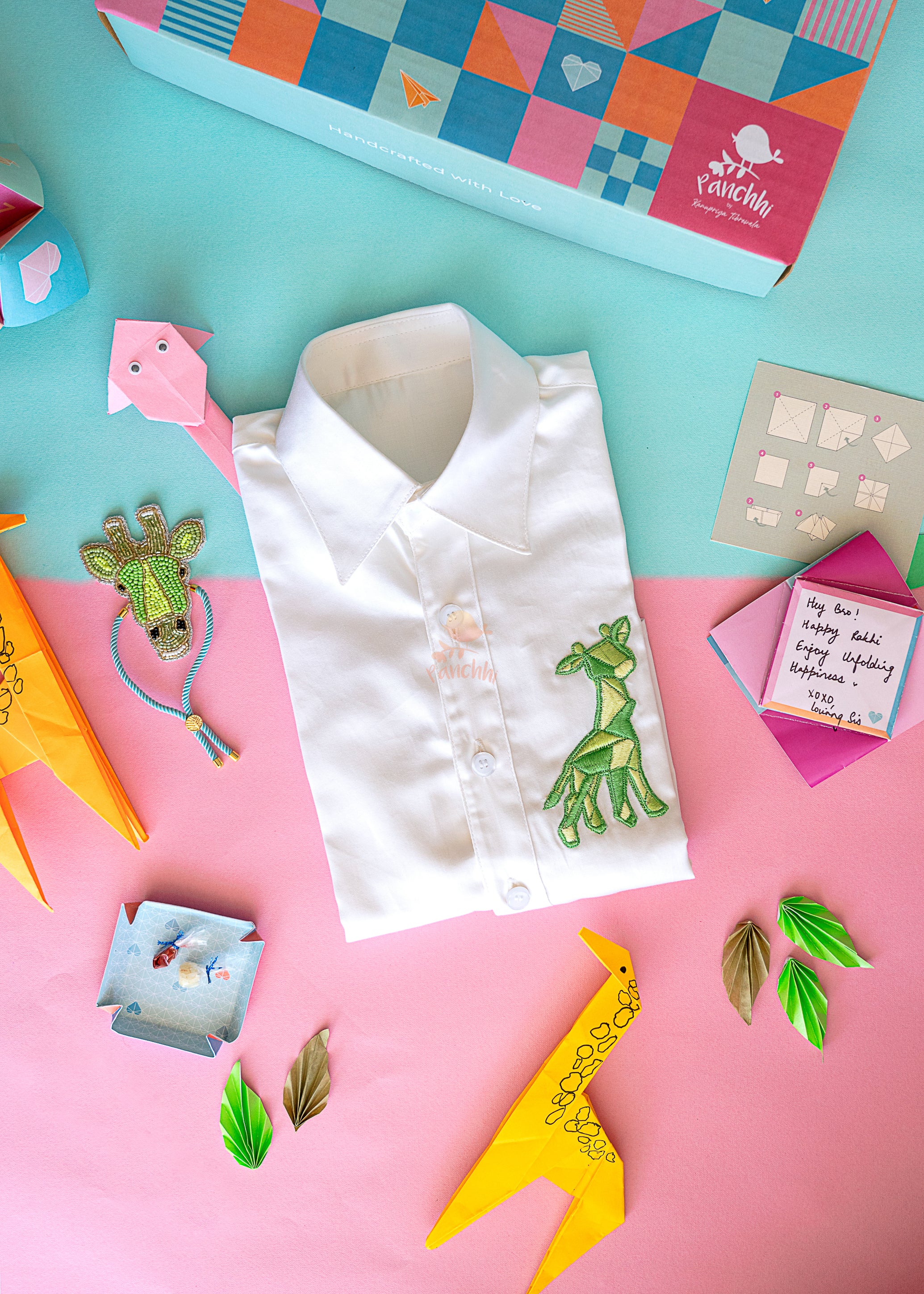 Shirt with an Origami Inspired Giraffe Embroidery with foldable sleeves detailing.