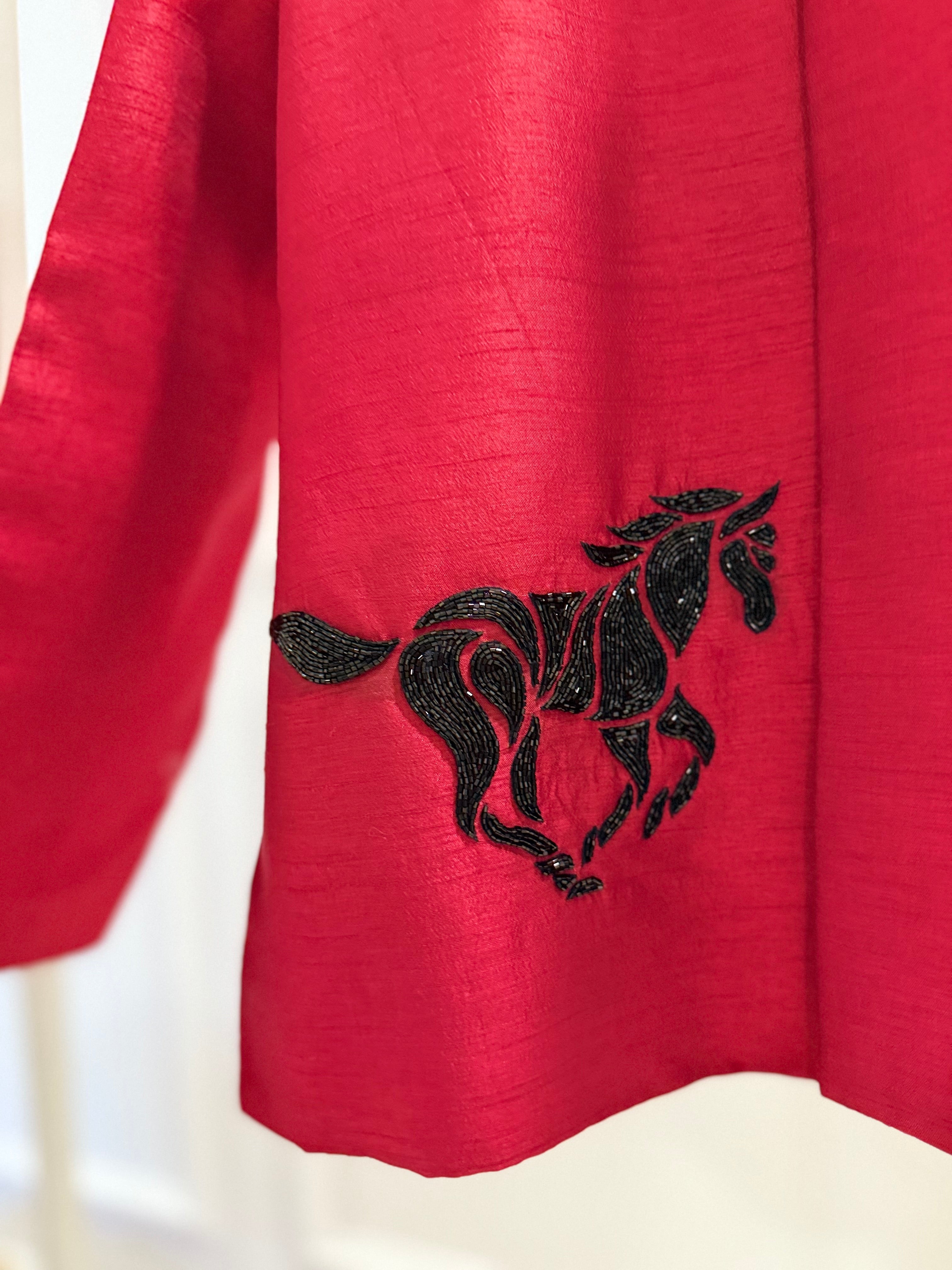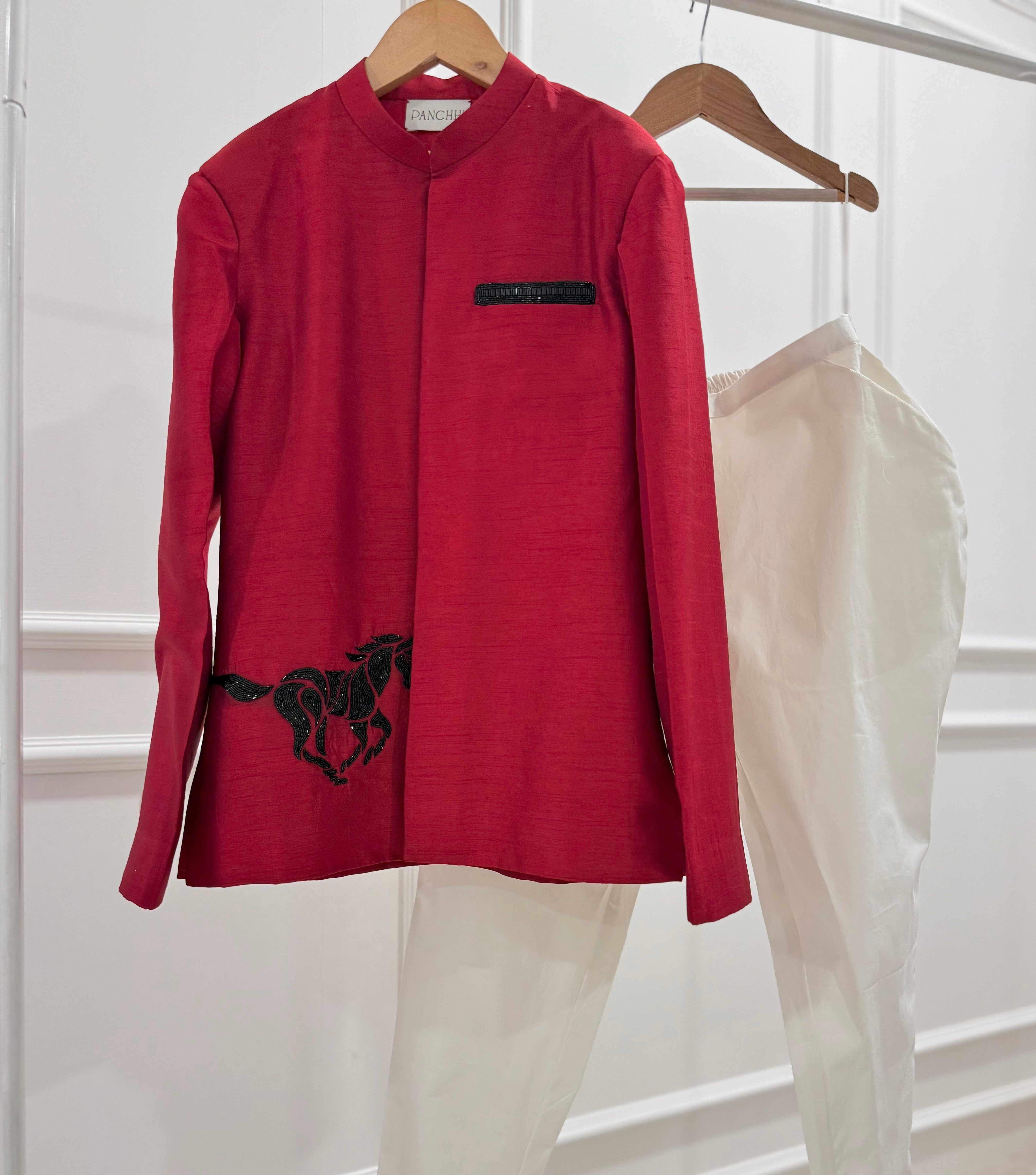 A running horse embroidered Bandhgala with Pocket detailing paired with polo style pants.