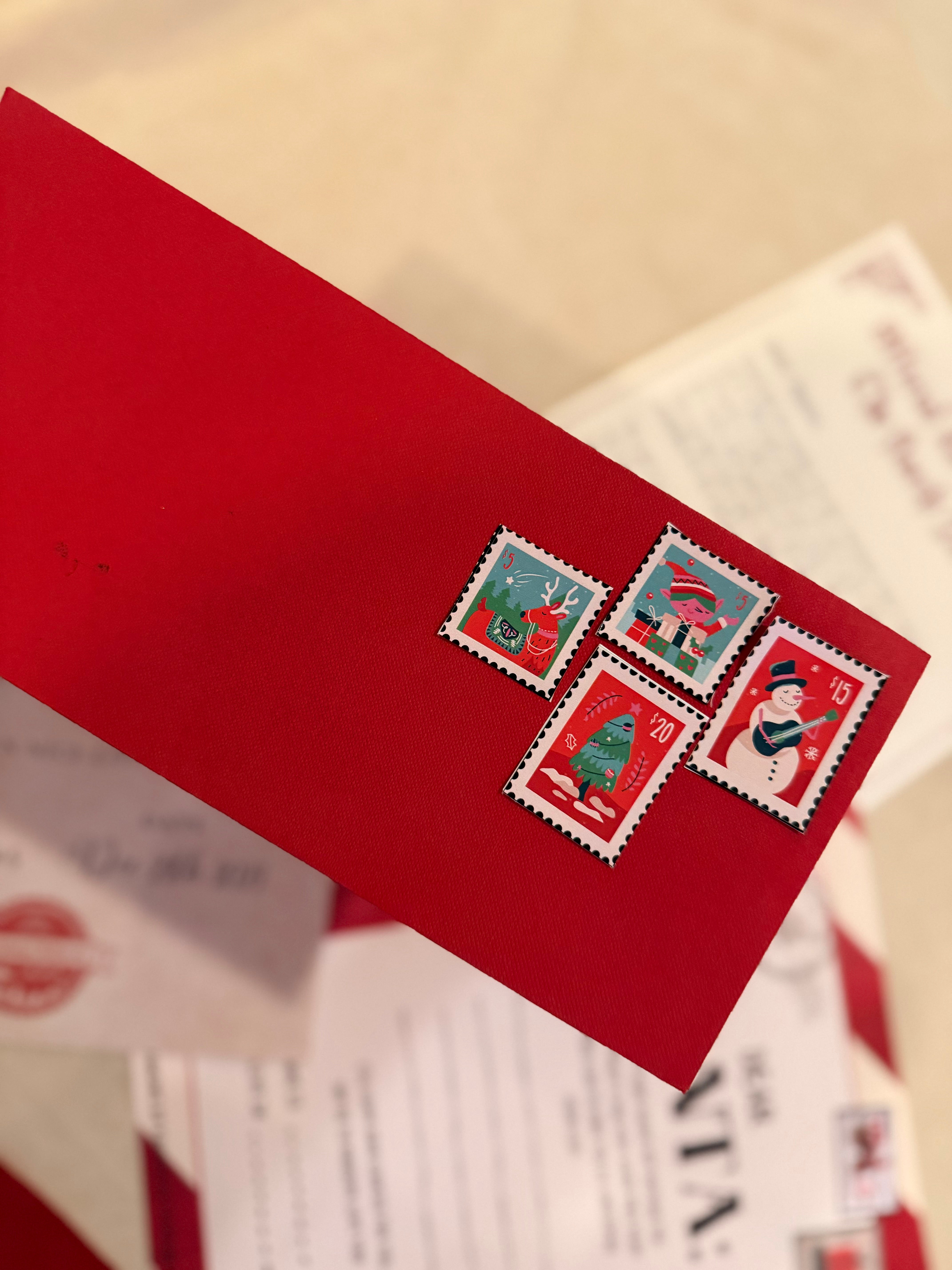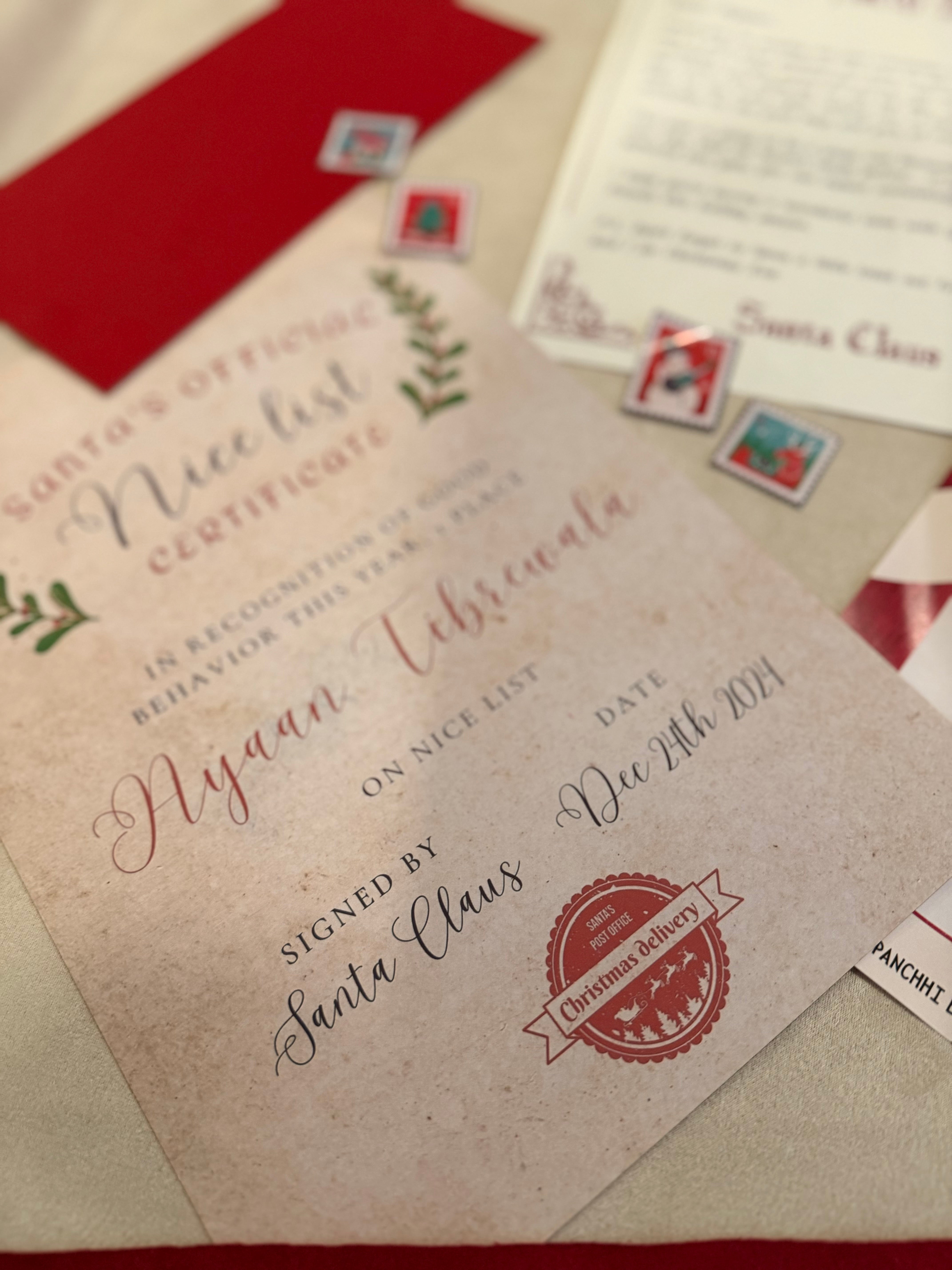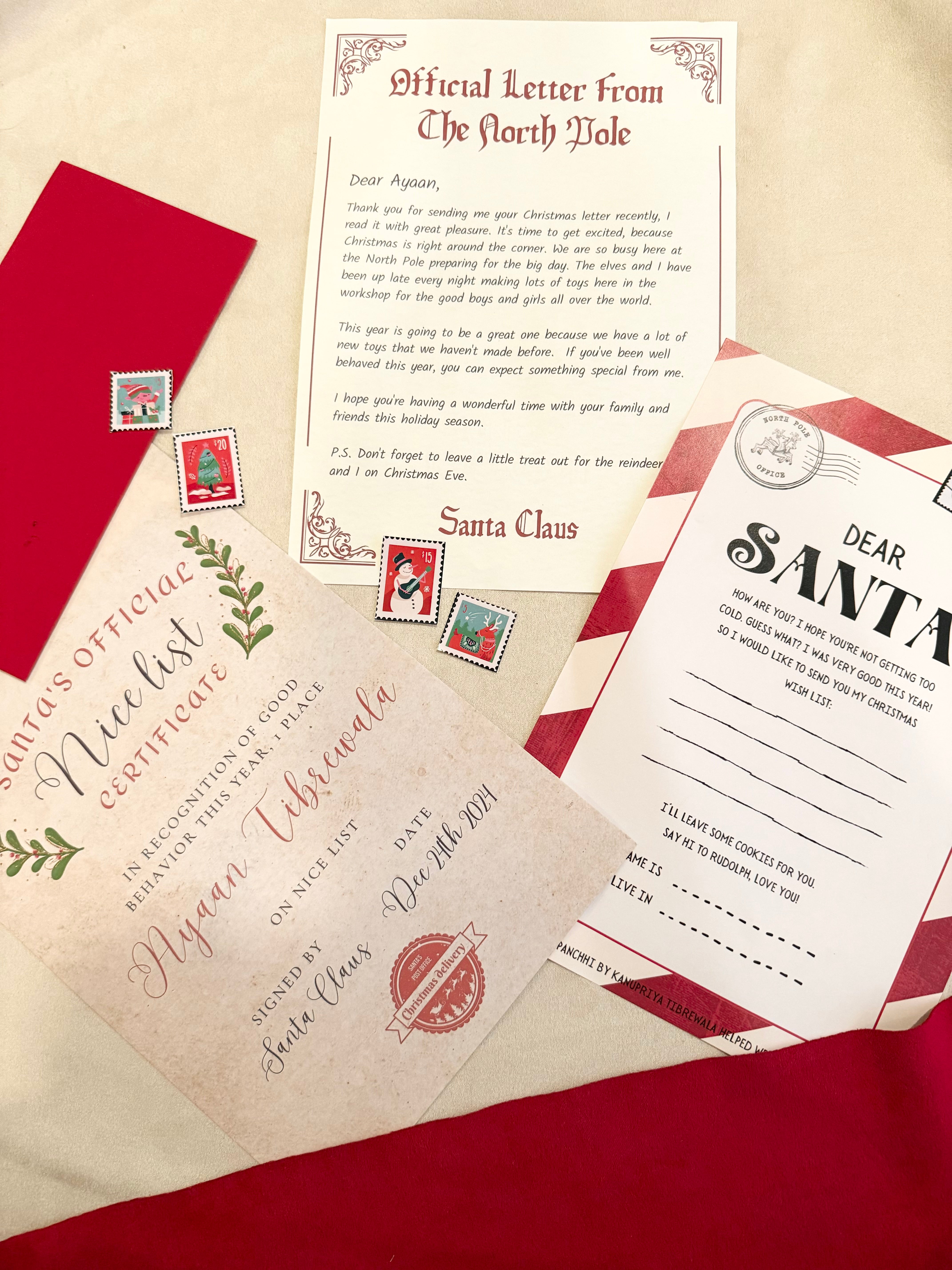 A Letter to Santa, A letter from Santa, A Nice List Certificate and 4 postage stamps sticker for easy use.
