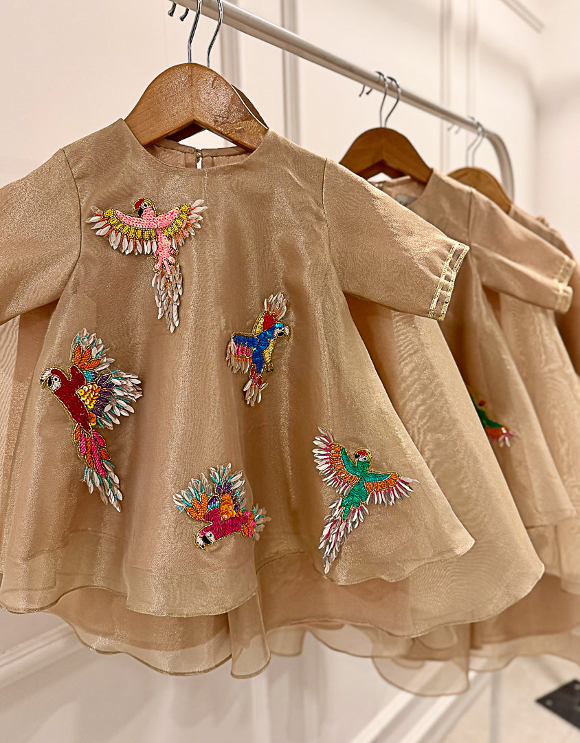 Light as air and full of movement, this ivory tunic set is adorned with hand-embroidered flying parrots in 3d effect, each motif crafted with multicoloured sequins and delicate beads.