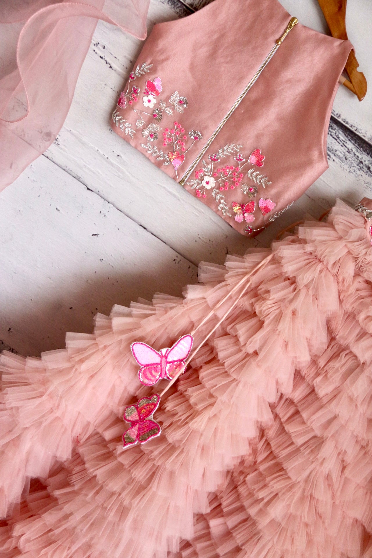 Ruffle lehenga with Halter Neck Blouse. Blouse and Belt hand embroidered.