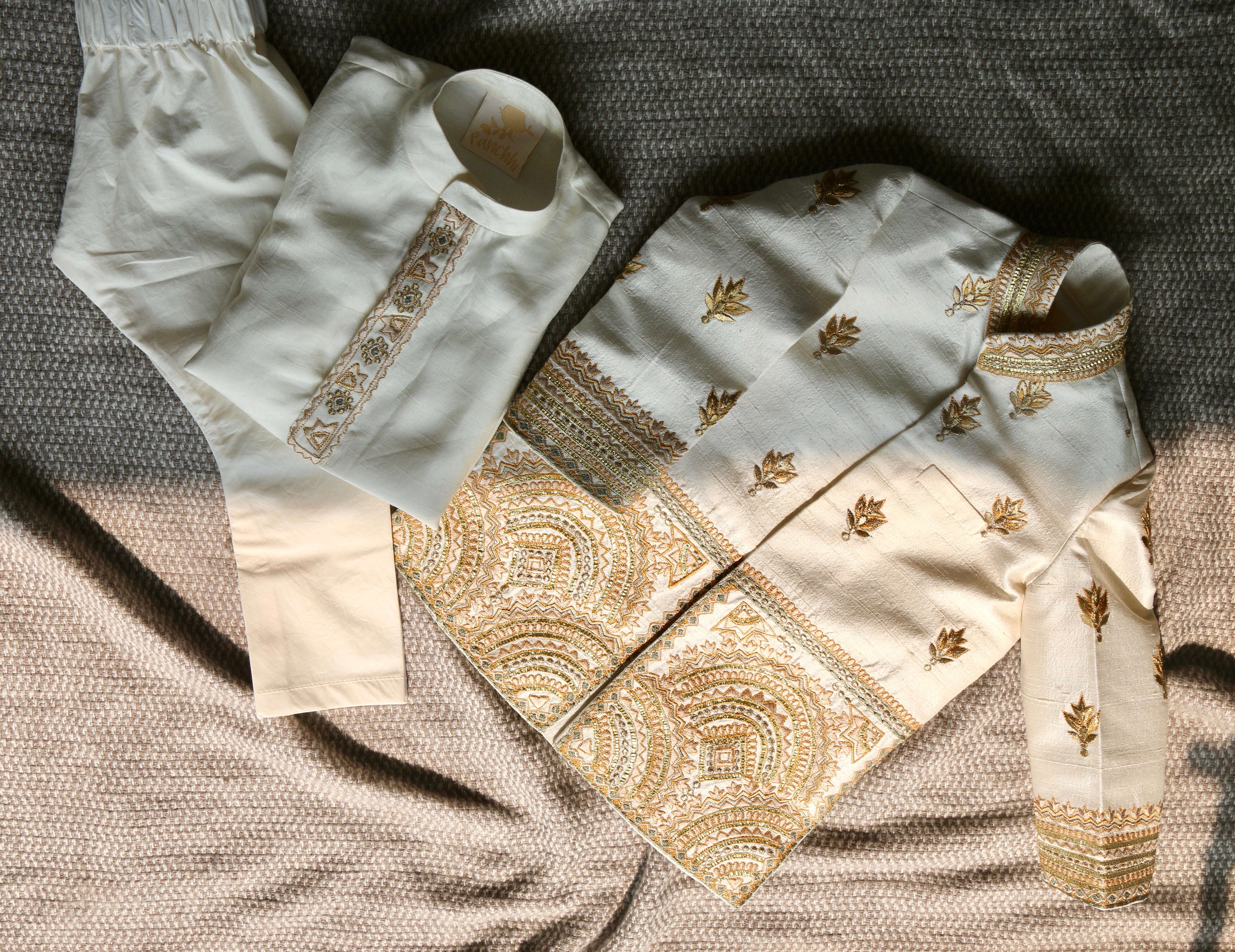 Gota and Thread work in intricate aztec pattern with zari booties accentuated Sherwani Set. Kurta with Placket Detailing.